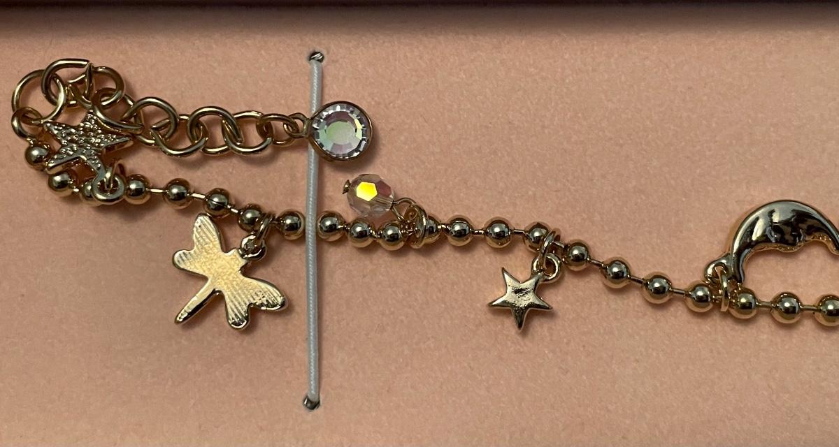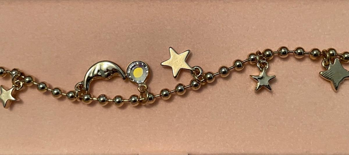 Brand new in box Vintage Kirks Foley charm bracelet featuring moon, hearts, dragonfly & more
