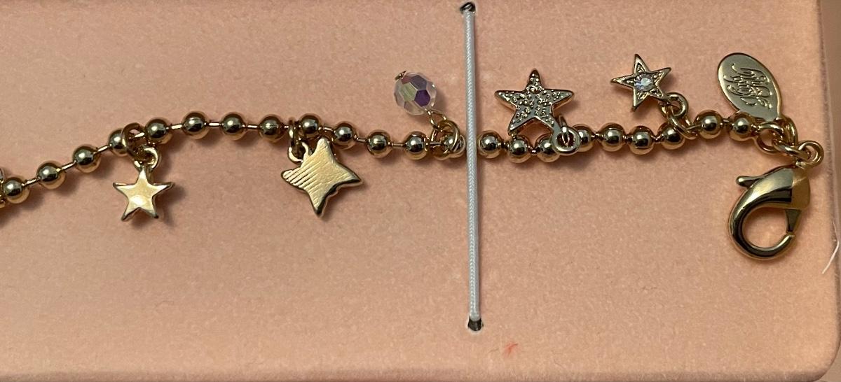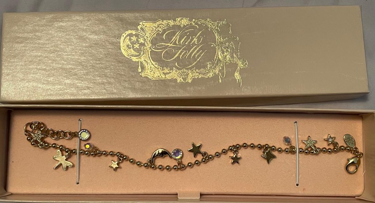 Brand new in box Vintage Kirks Foley charm bracelet featuring moon, hearts, dragonfly & more