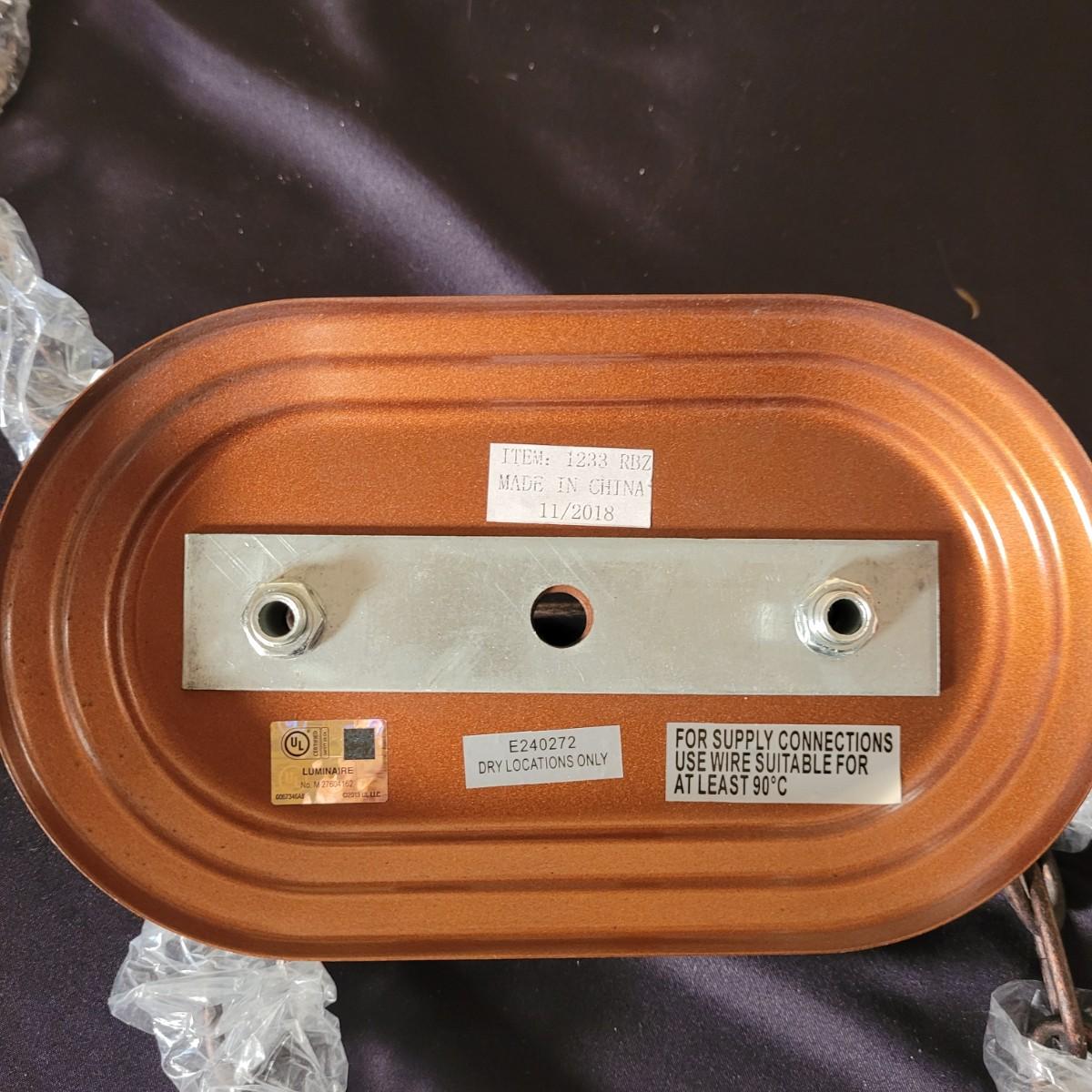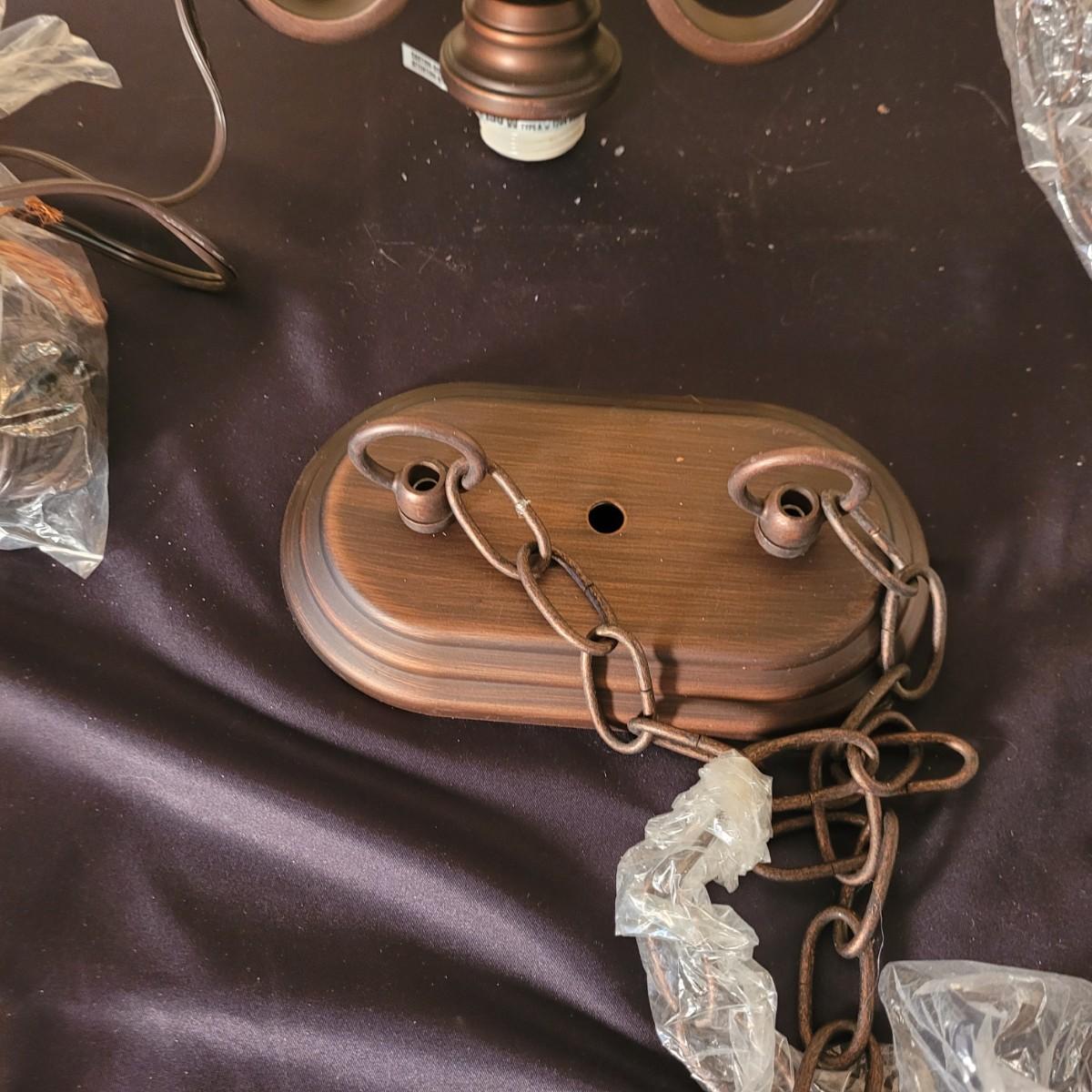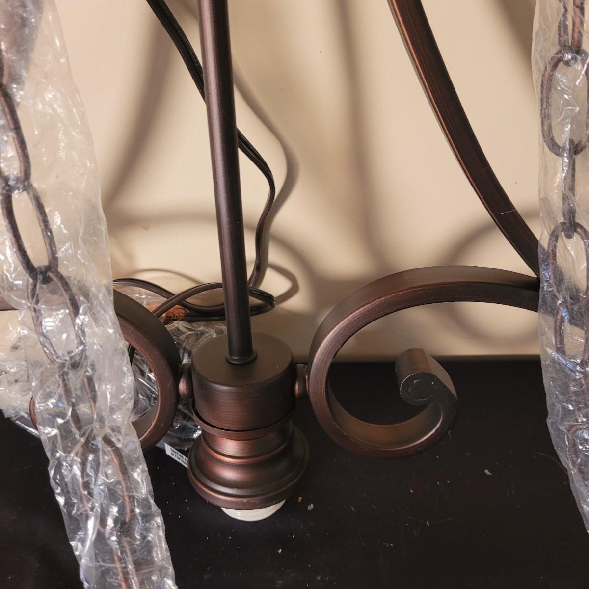 Three light rubbed bronze light pendant with Turinian Scavo glass shades. 450 Watts. New in box, not able to test. Pendant measures approximately 32"L x22.5"H, chain length 57". Shipping available.