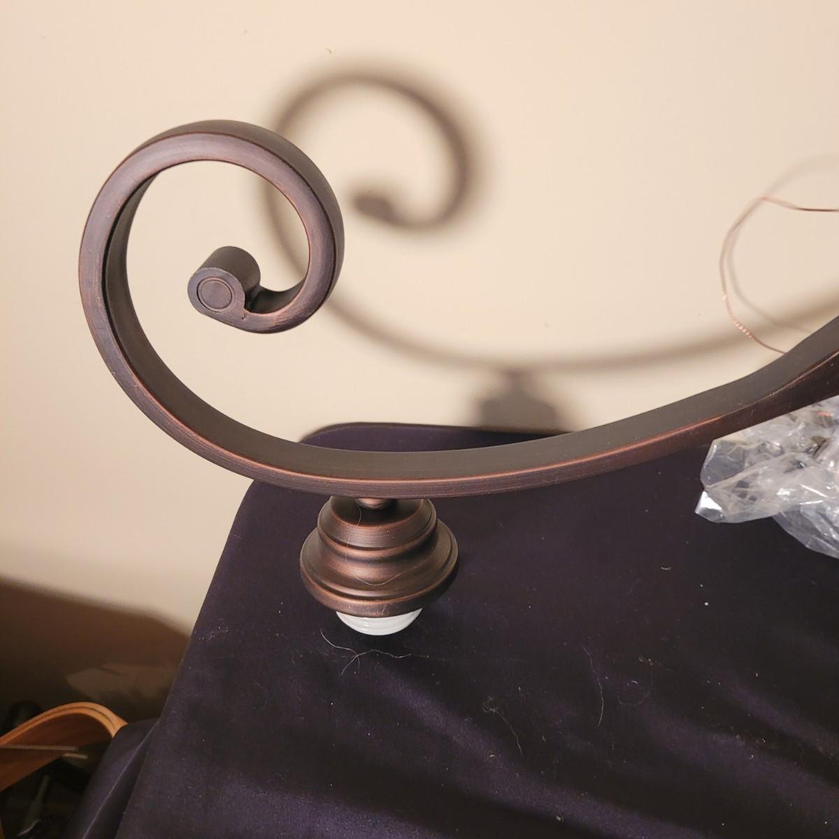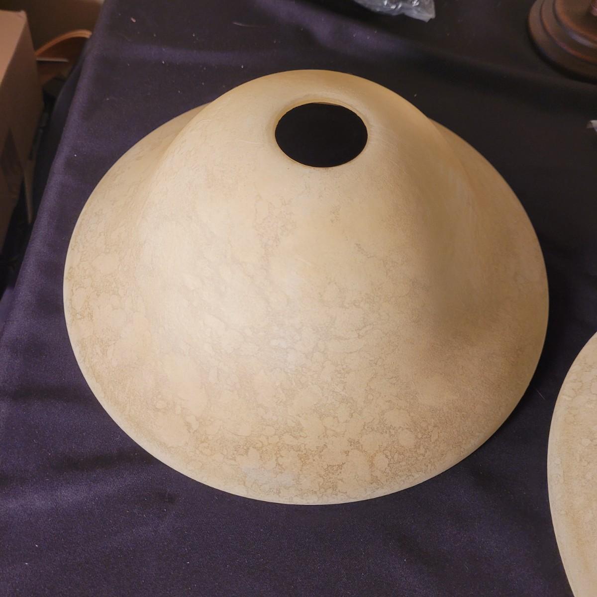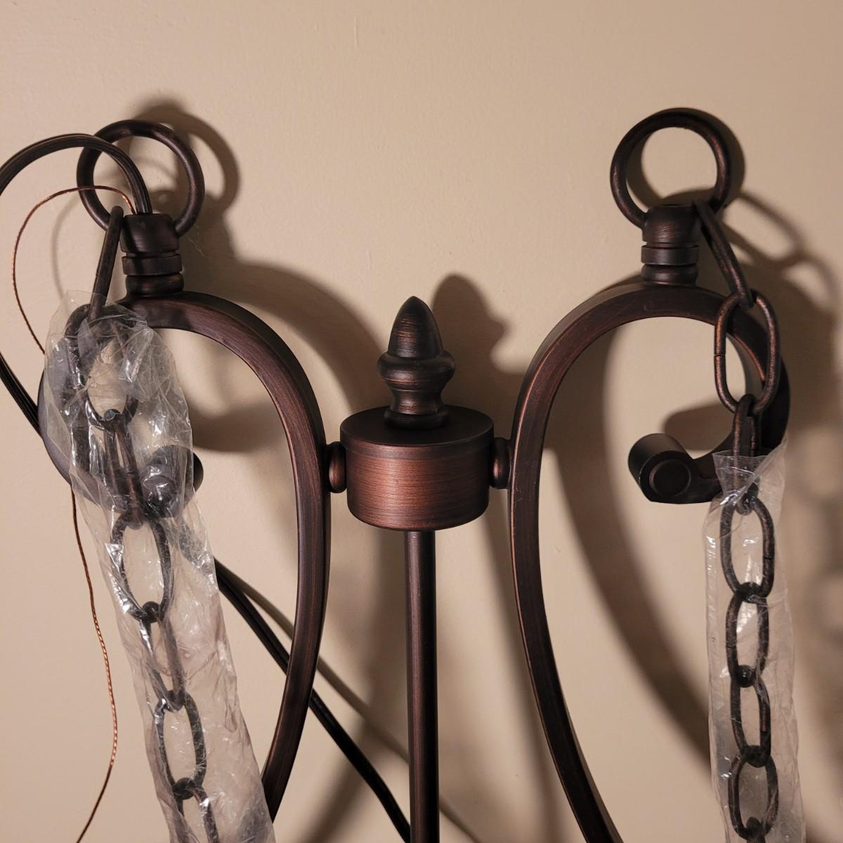 Three light rubbed bronze light pendant with Turinian Scavo glass shades. 450 Watts. New in box, not able to test. Pendant measures approximately 32"L x22.5"H, chain length 57". Shipping available.