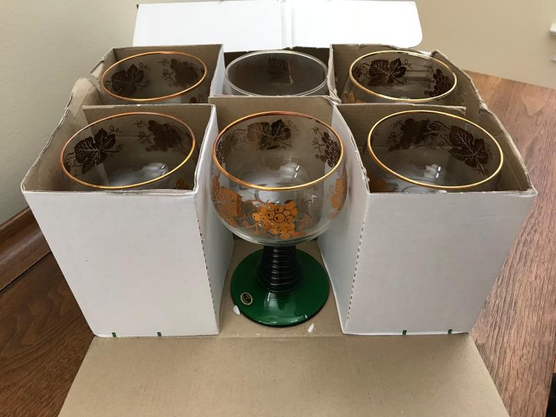 Great set of six German wine goblets in their original box by Bockling Glas. Glasses have the traditional green ribbed stem and foot, supporting a clear goblet accented with gold grapes, leaves, and rim. 4" x 5 1/2" H.