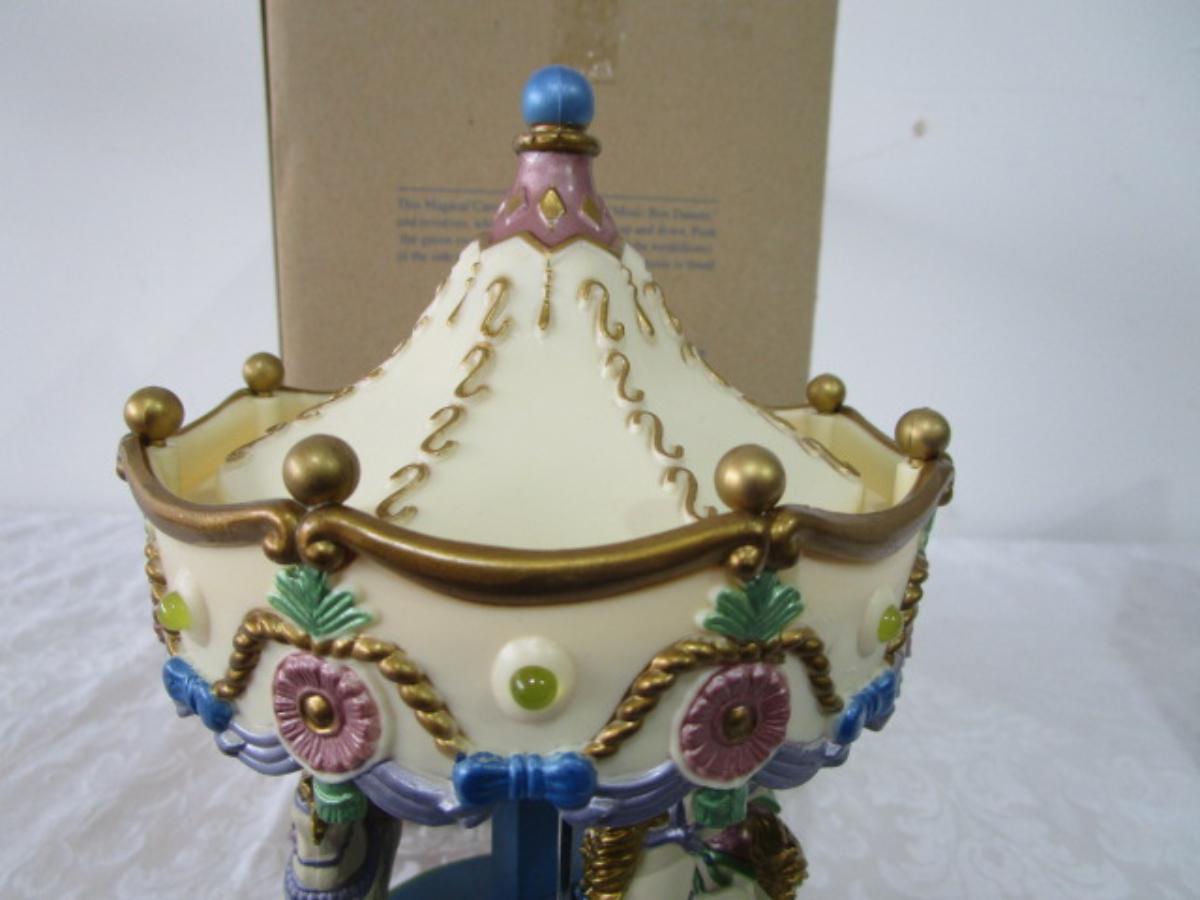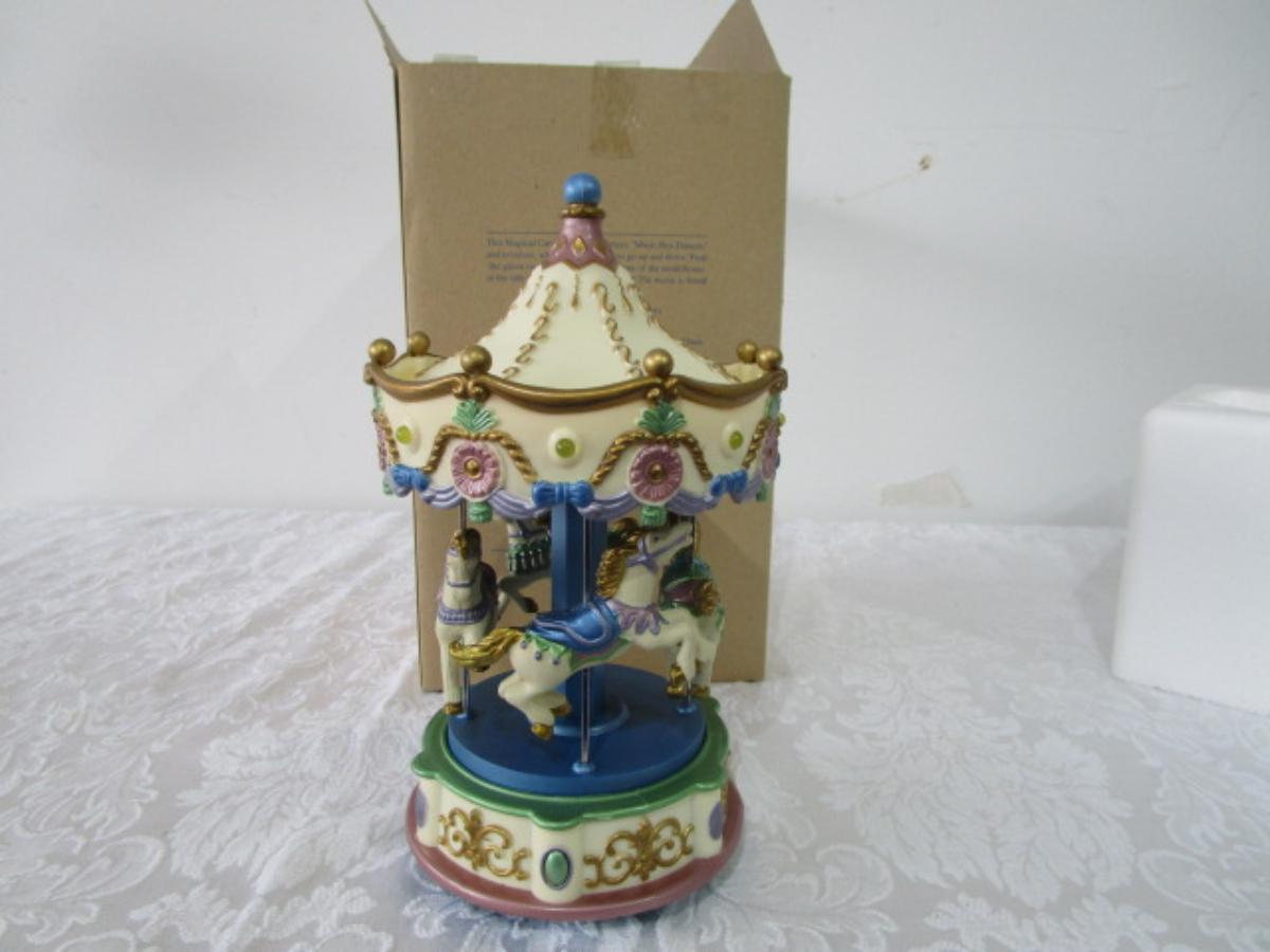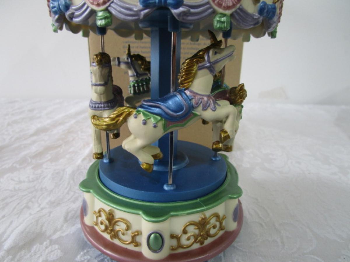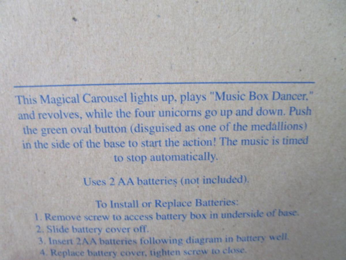 Horses go around & move up and down. Takes 2 AA batteries, plays "Music Box Dancer" tested & works, from Avon Gift Collection