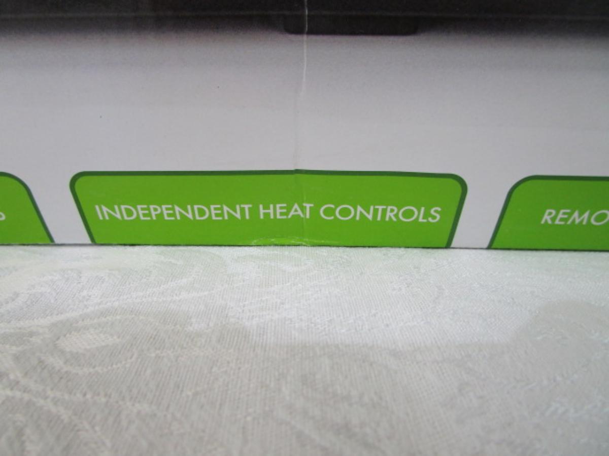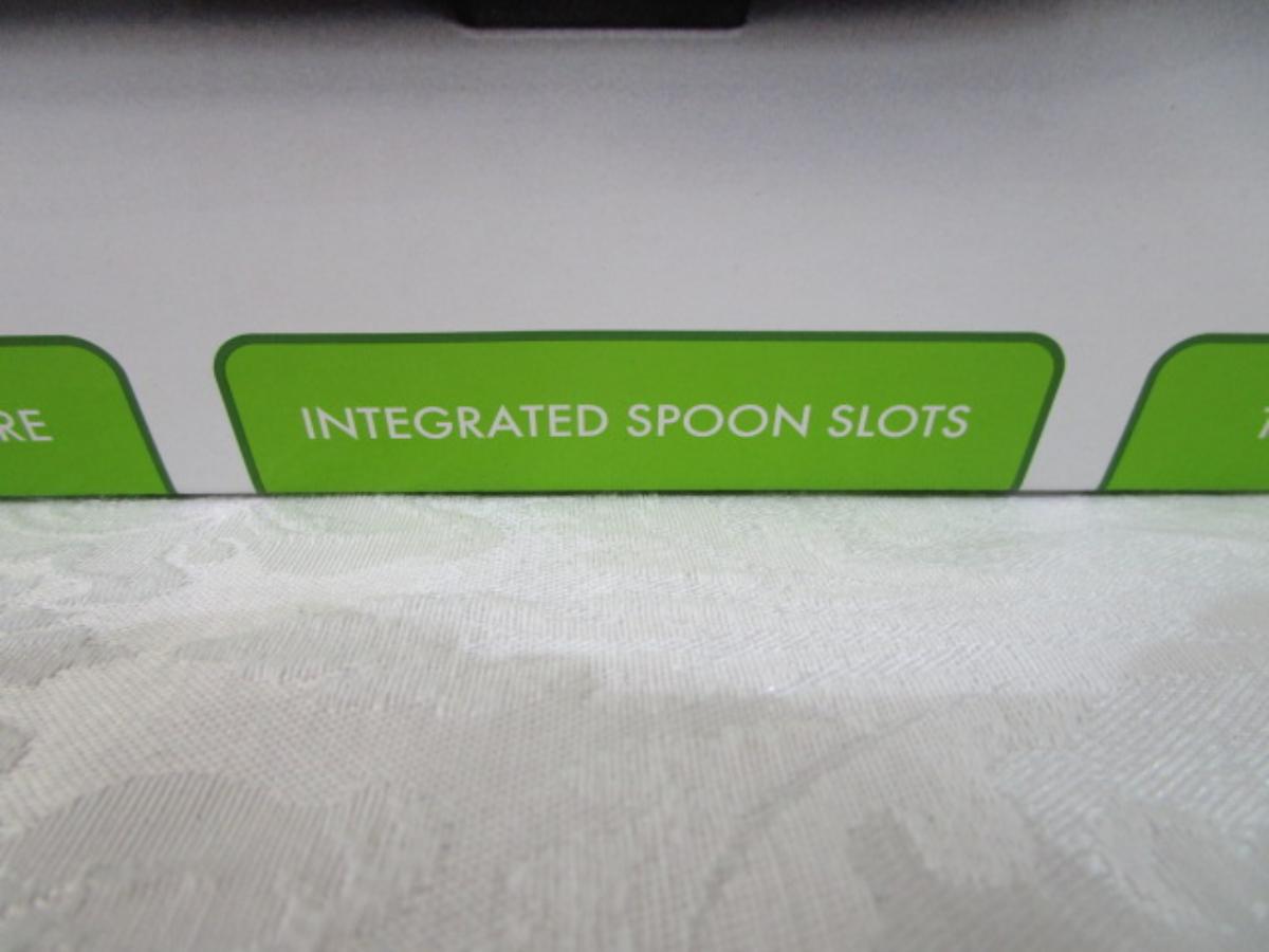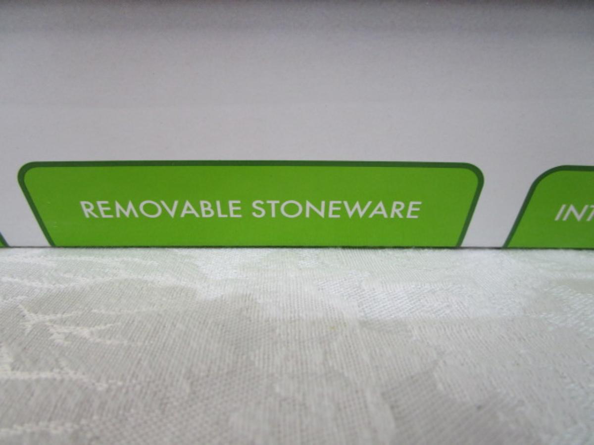 Removable stoneware inserts, independent heat controls, tempered glass lids, 3 serving spoons included