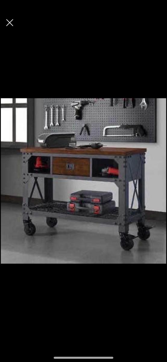 One 48in Industrial Metal & Wood Workbench The sturdy welded wire shelf is ideal for storing larger items. 4 heavy-duty casters (2 locking) Allows for a mobile workstation that can be locked in place for stability during projects Lined center drawer protects scratches and dings from metal tools Keeps tools and small items from sliding around when opening and closing the drawer Heavy duty ball-bearing metal drawer glides 2 open faced side storage cubbies, 1 on each side of the center drawer Hand applied rich wood finish The workbench top has plenty of real estate for all your projects on the 48 by19 inch work surface.