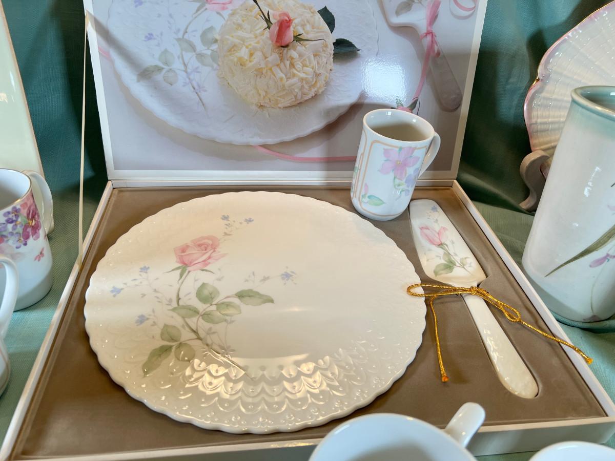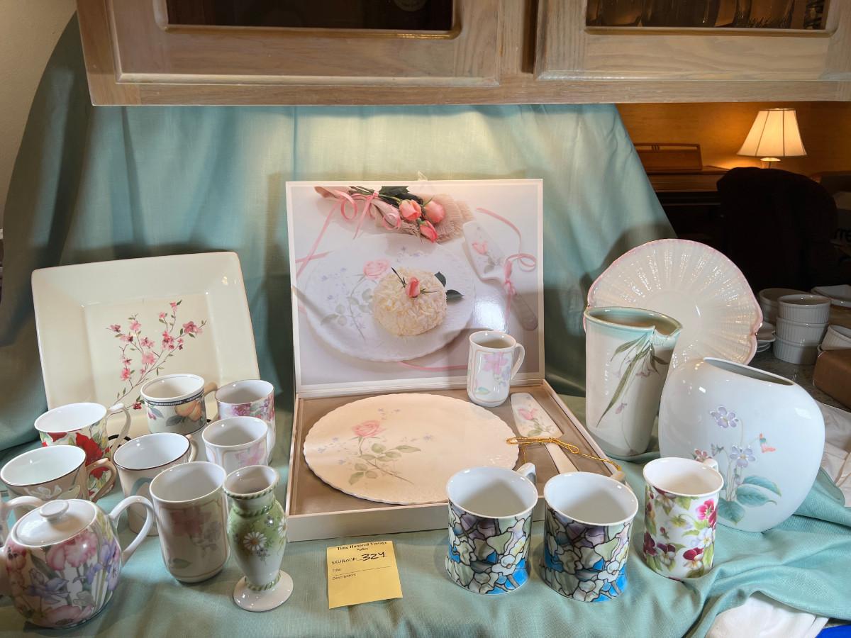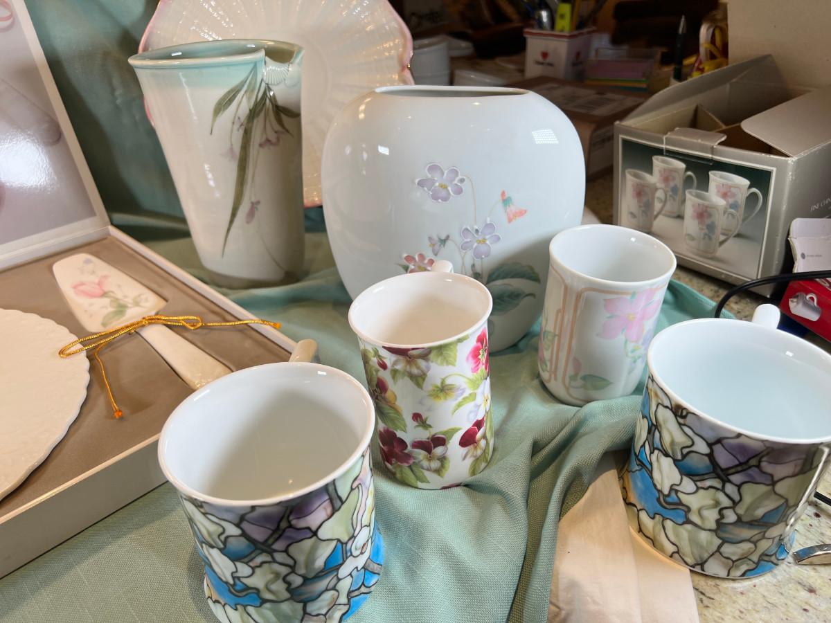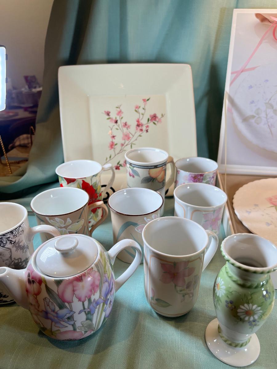 New in gift Box Mikasa Floral cake Plate and server. 12 Floral Mugs , 2 Vases 1 Floral Pottery Barn serving plate, Vintage Fine china shell plate with delicate pink rim. Floral tea pot, Bud vase, 2 Floral