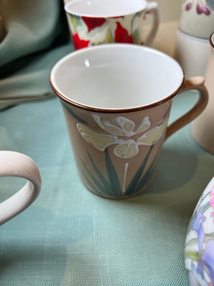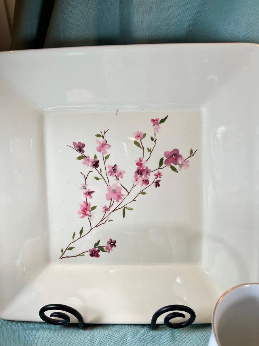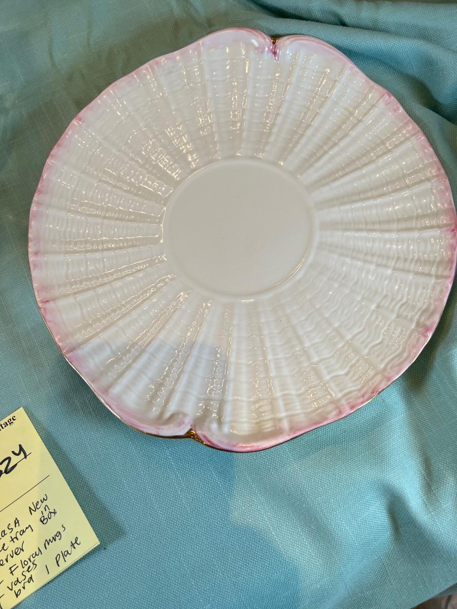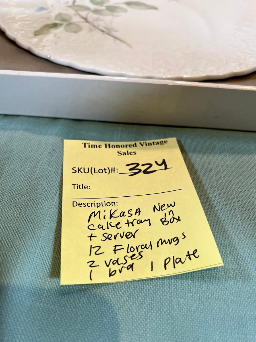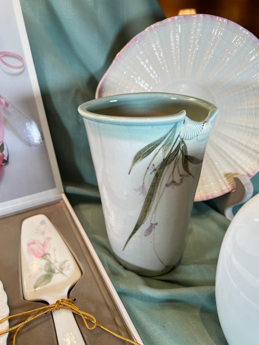 New in gift Box Mikasa Floral cake Plate and server. 12 Floral Mugs , 2 Vases 1 Floral Pottery Barn serving plate, Vintage Fine china shell plate with delicate pink rim. Floral tea pot, Bud vase, 2 Floral
