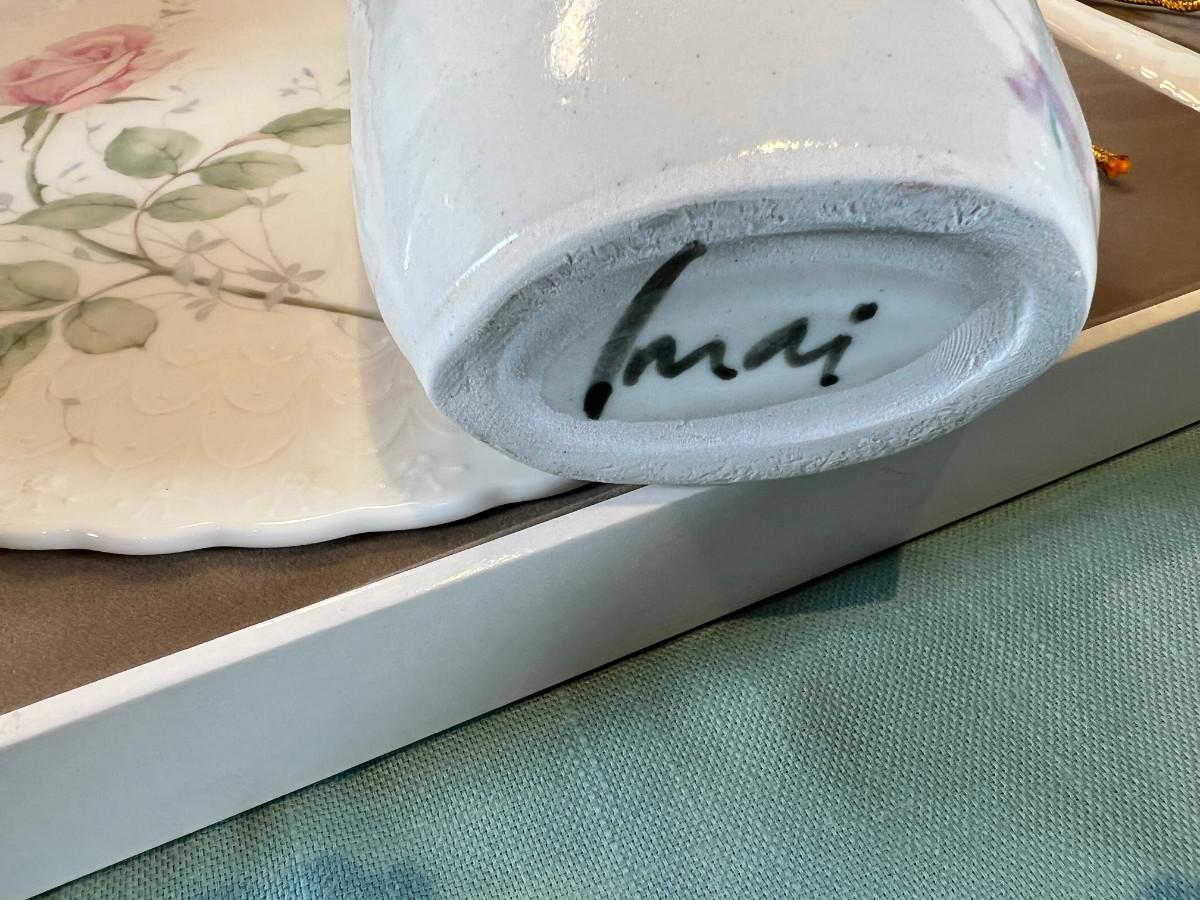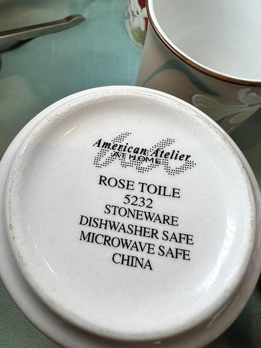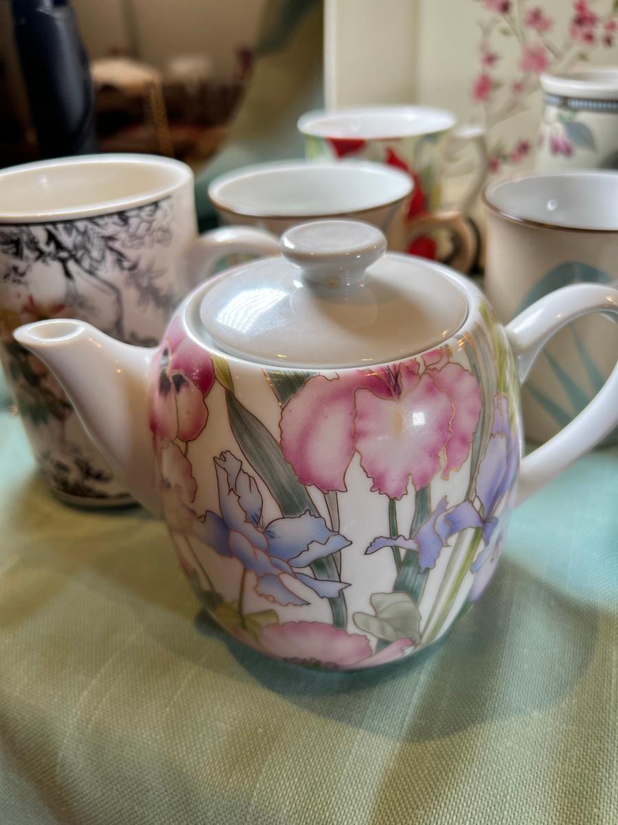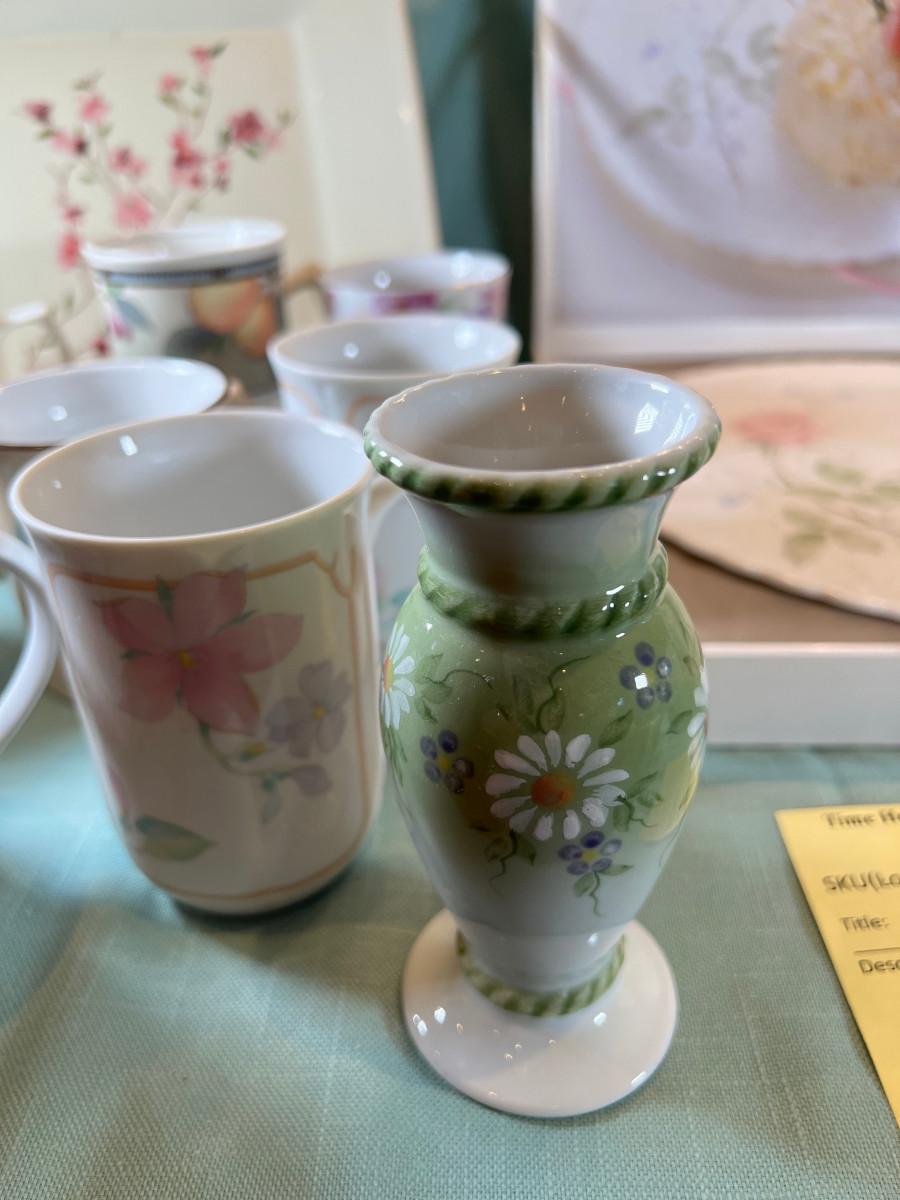 New in gift Box Mikasa Floral cake Plate and server. 12 Floral Mugs , 2 Vases 1 Floral Pottery Barn serving plate, Vintage Fine china shell plate with delicate pink rim. Floral tea pot, Bud vase, 2 Floral