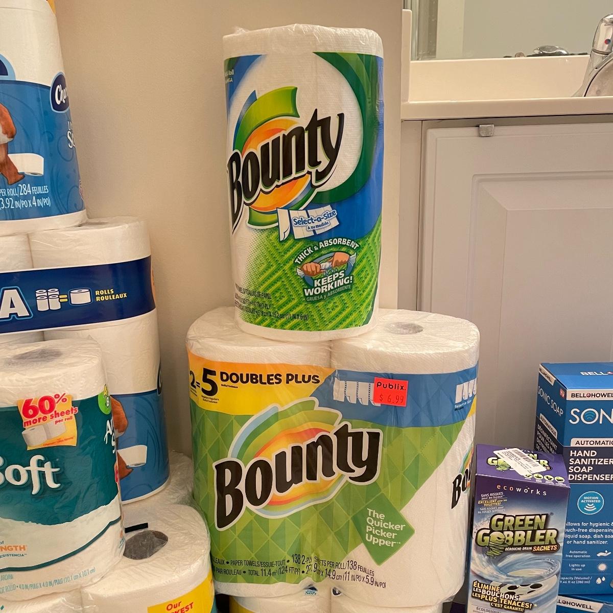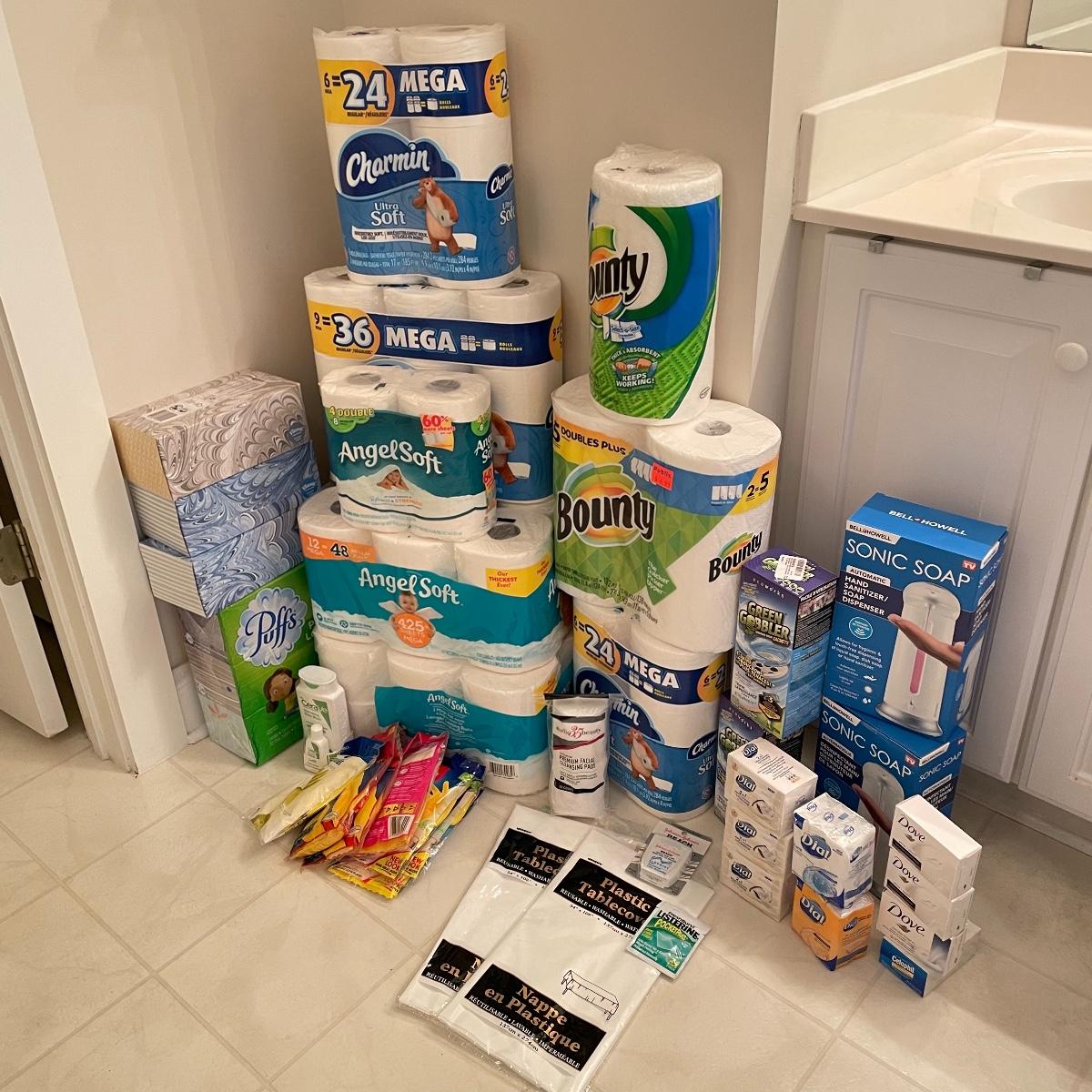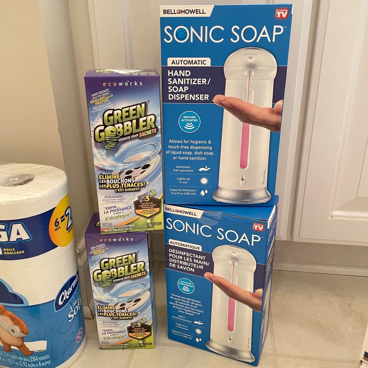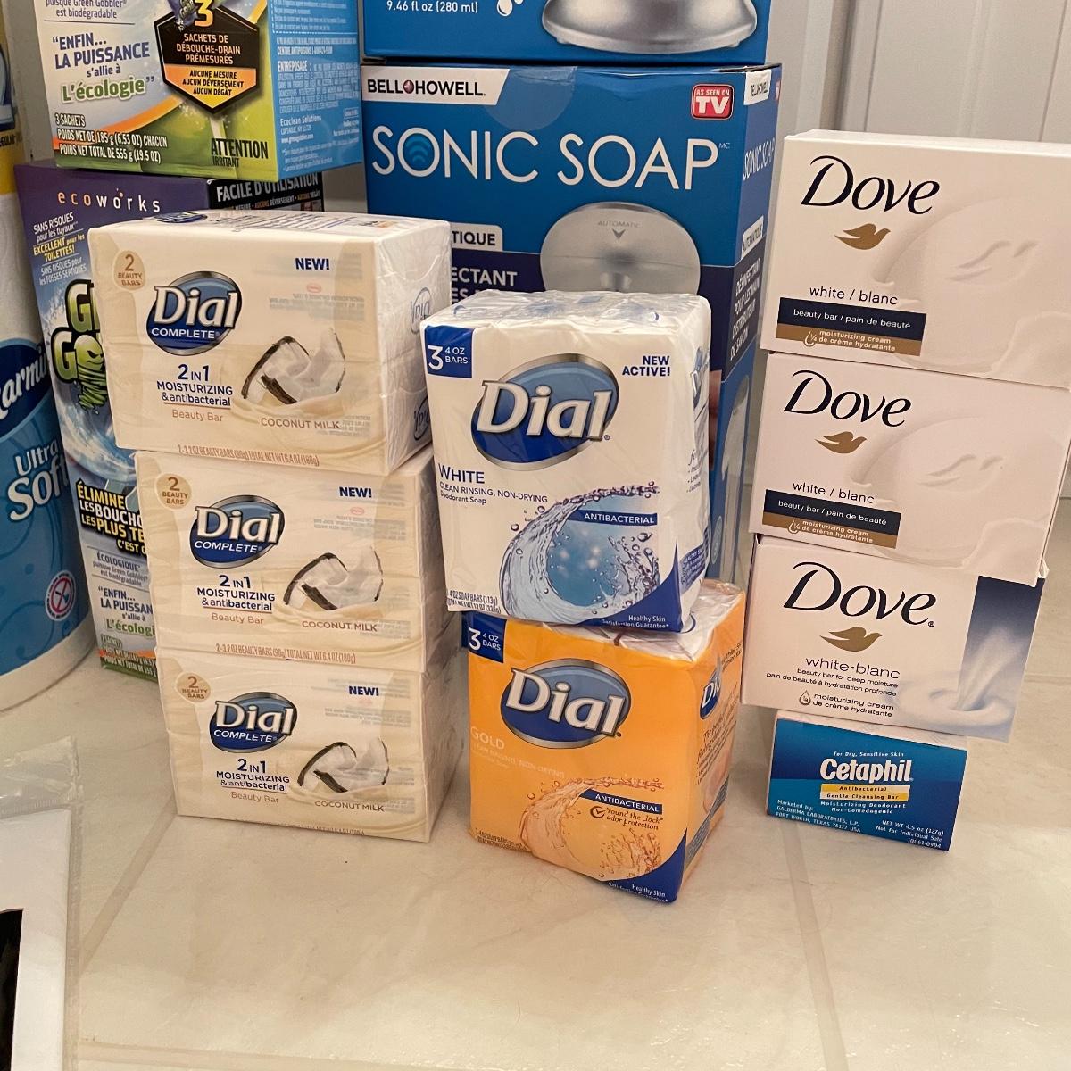 Six various sized/brand packaged toilet apparel, three rolls Bounty paper towels, six boxes of tissues, 16 packaged bar soap, two Bell+Howell automatic soap dispensers and more. Local pick up only.