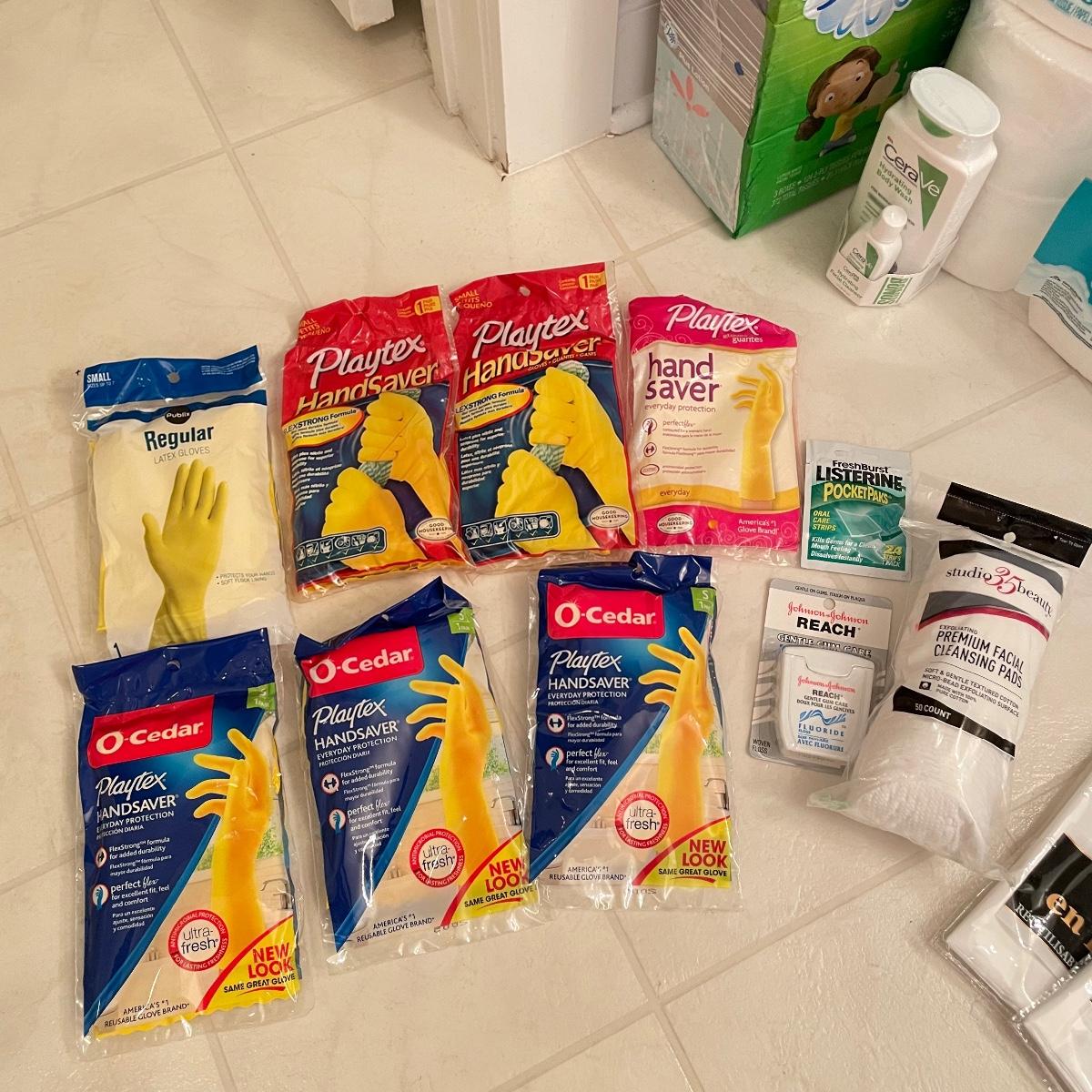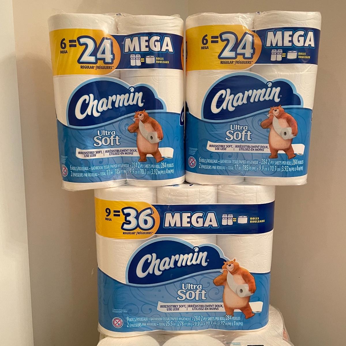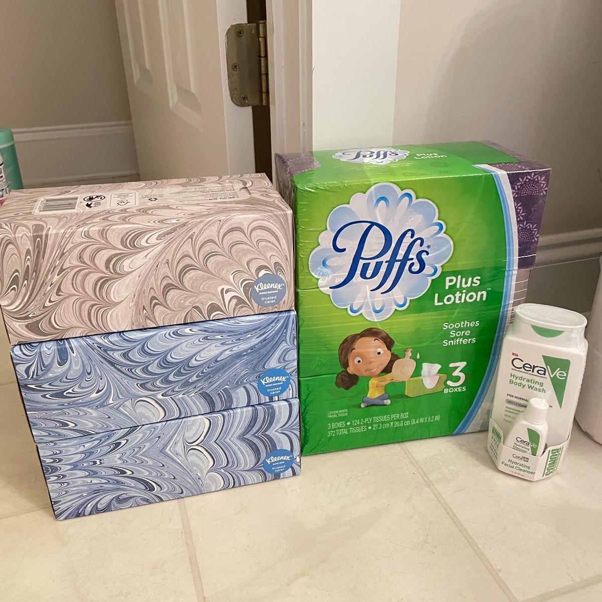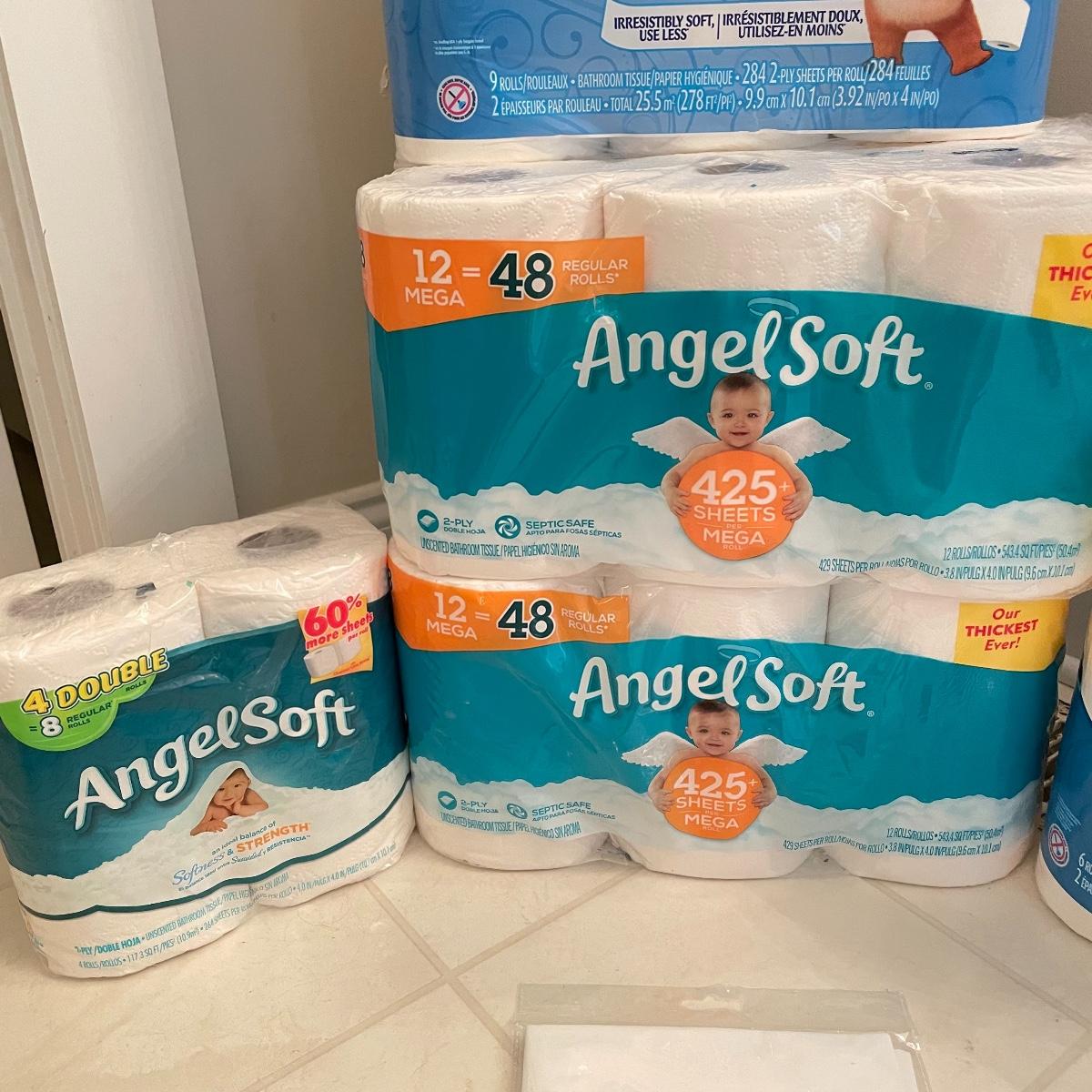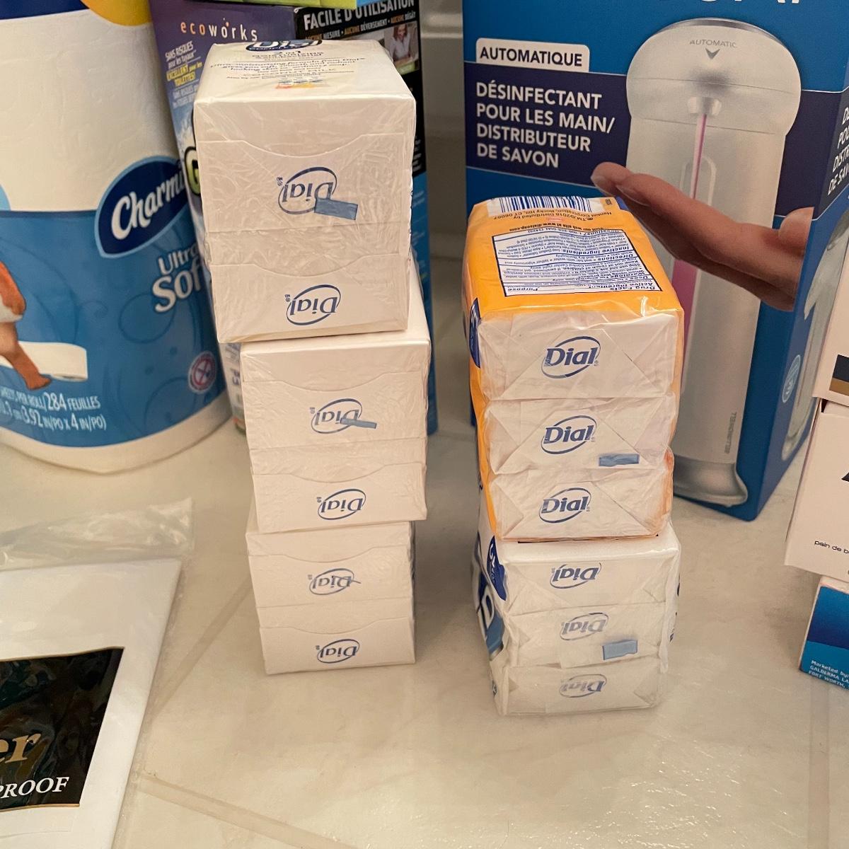 Six various sized/brand packaged toilet apparel, three rolls Bounty paper towels, six boxes of tissues, 16 packaged bar soap, two Bell+Howell automatic soap dispensers and more. Local pick up only.