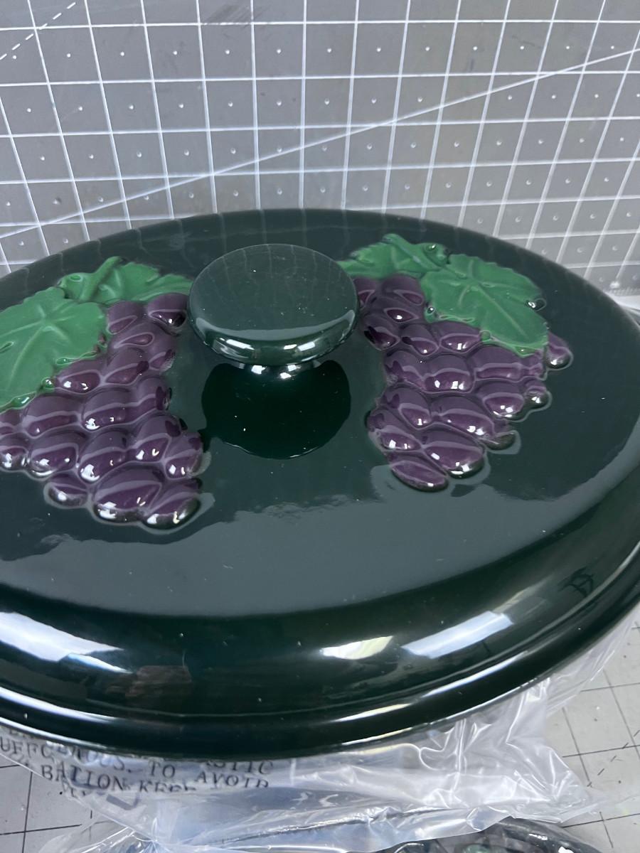 First Time out of the Box for this picture. OH MY, Green, New, WOW!!! Diameter 14" Long by 9" Wide OVAL 6-1/2" Tall with Lid. THIS IS Easter WORTHY!