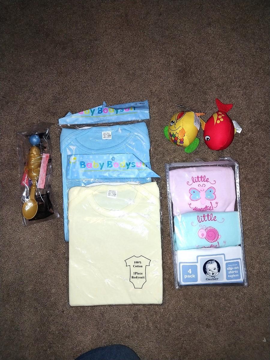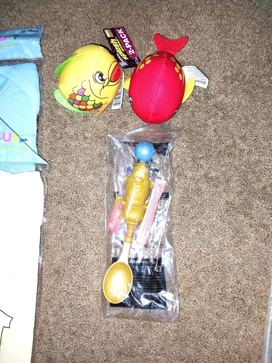 NEW INFANT ITEMS TWO 1PC BODYSUITS-4PK SLIP ON SHIRTS-MEDICINE SPOON-FISHYS