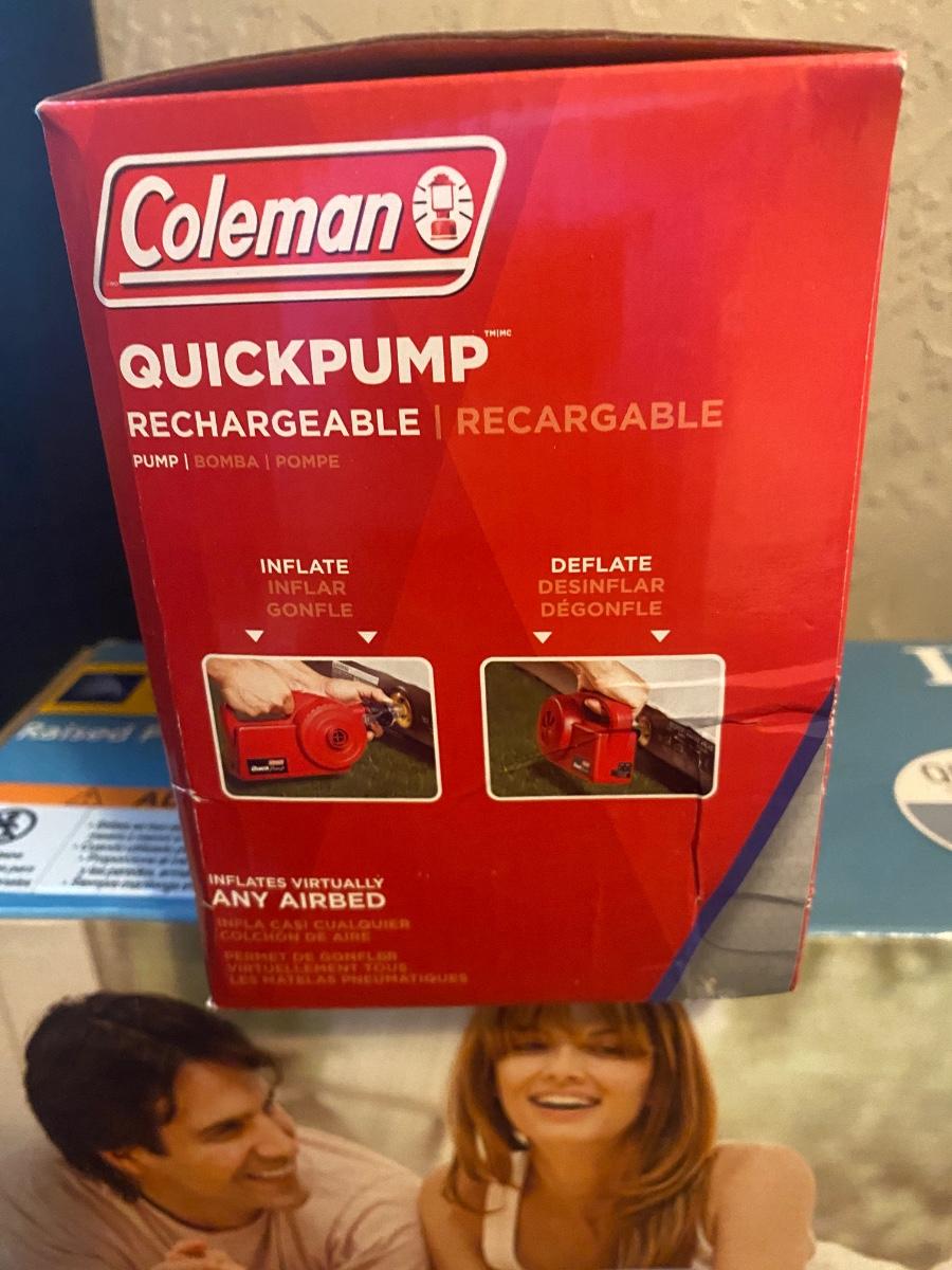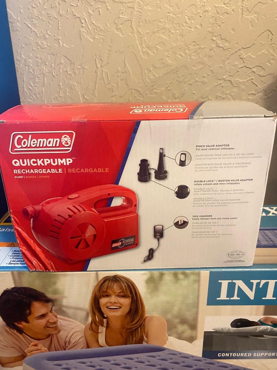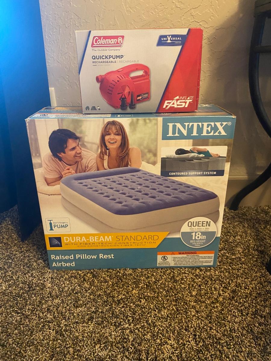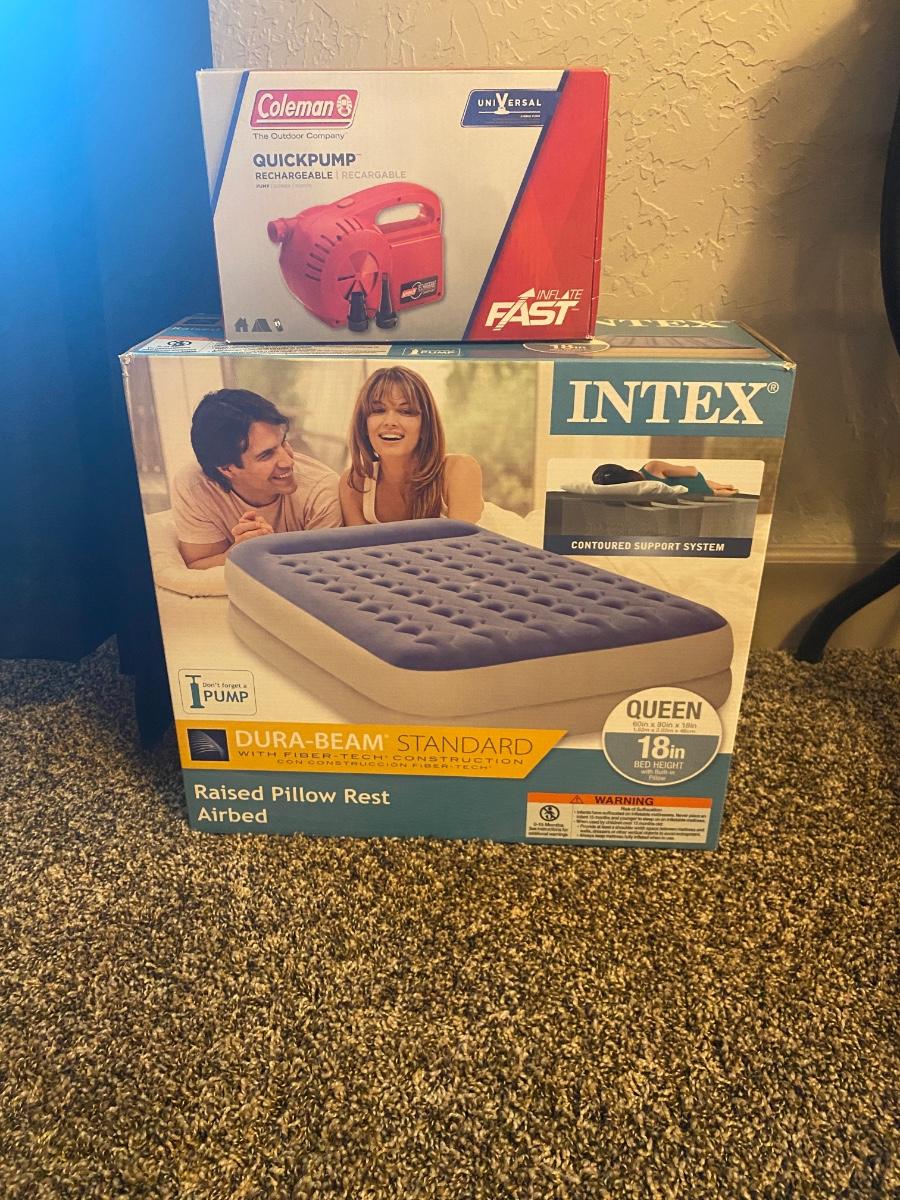 NEW INTEX 18” TALL QUEEN AIR MATTRESS AND COLEMAN ELECTRIC AIR PUMP