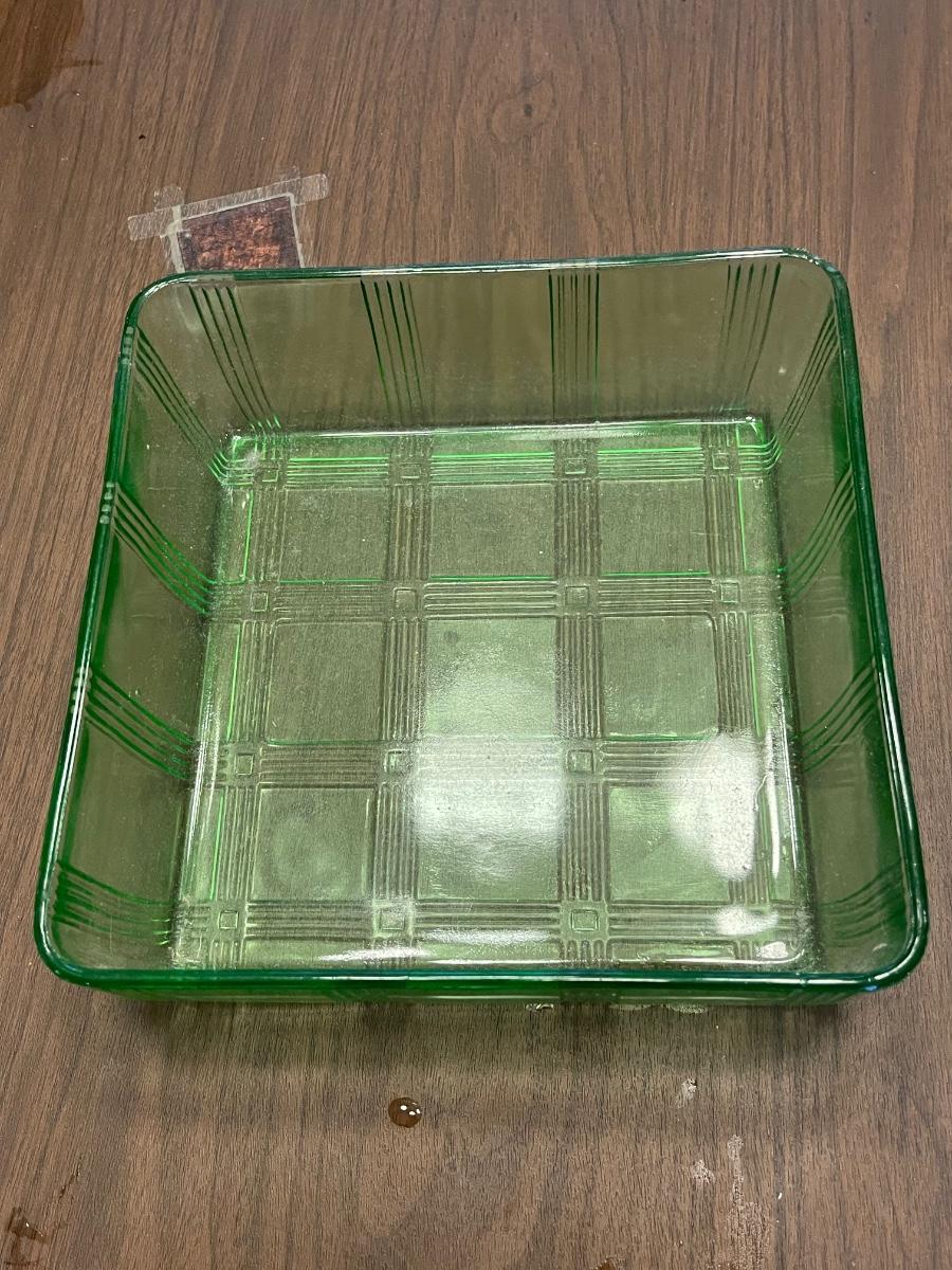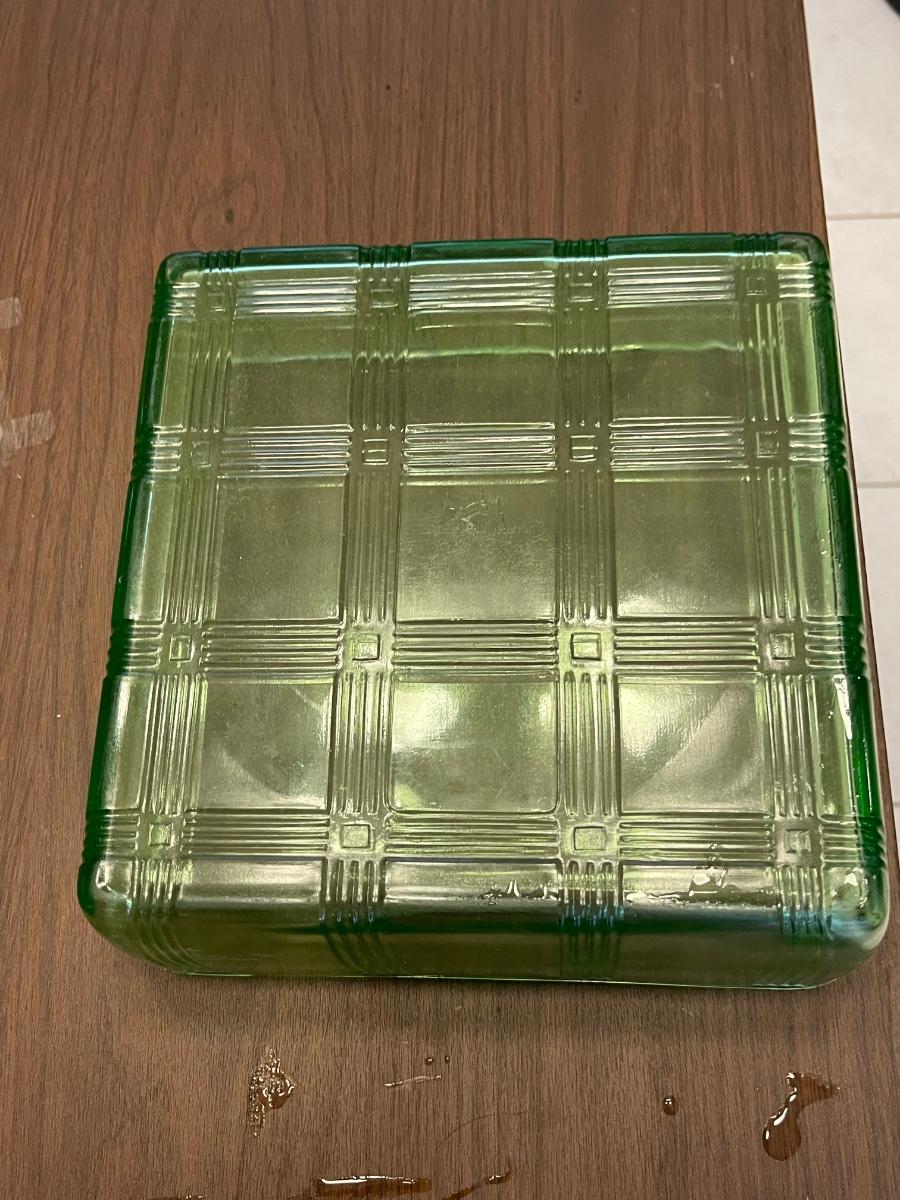 Vintage Hazel Atlas Vaseline (Uranium) Glass Square Criss Cross Refrigerator Dish
