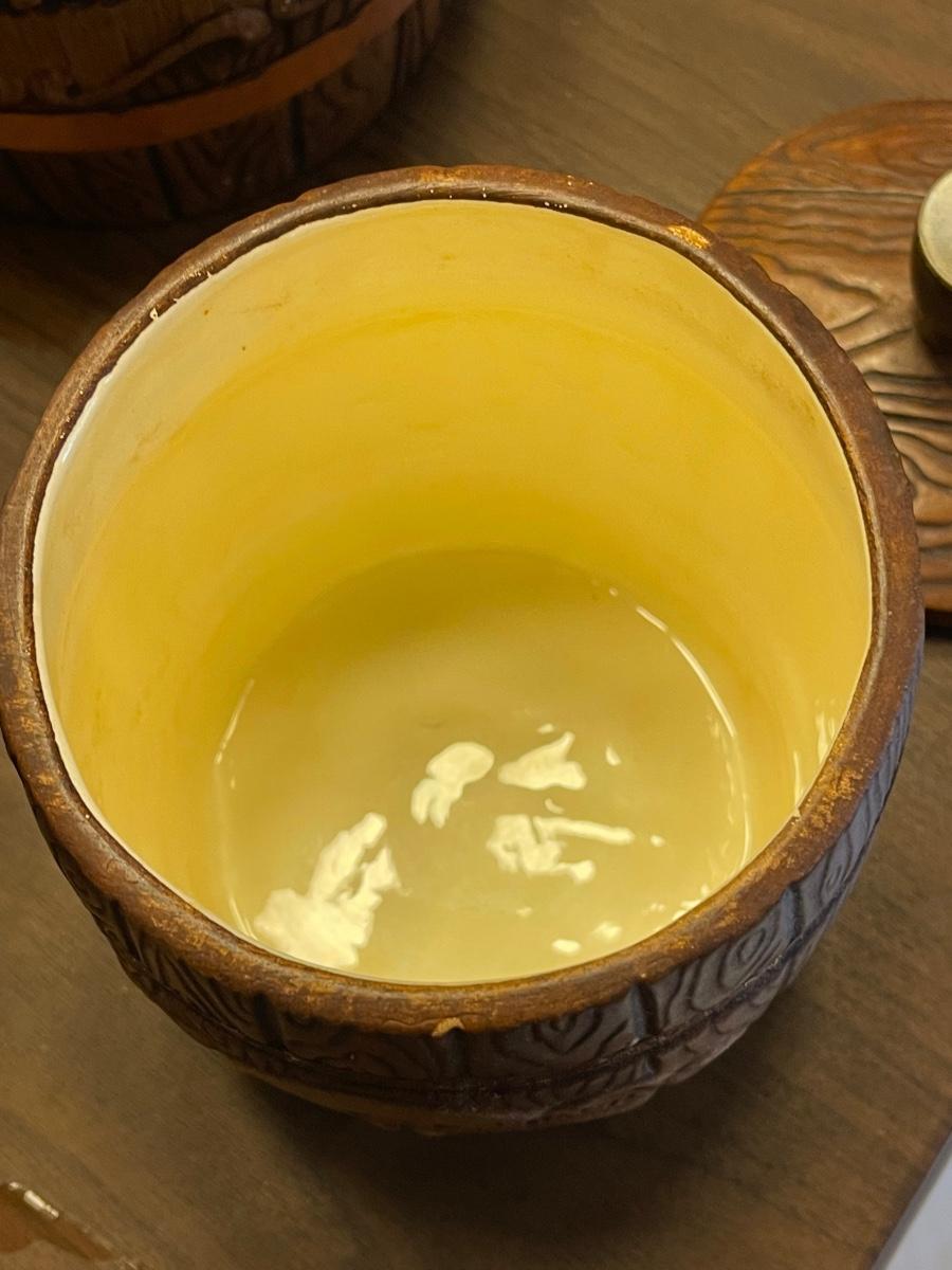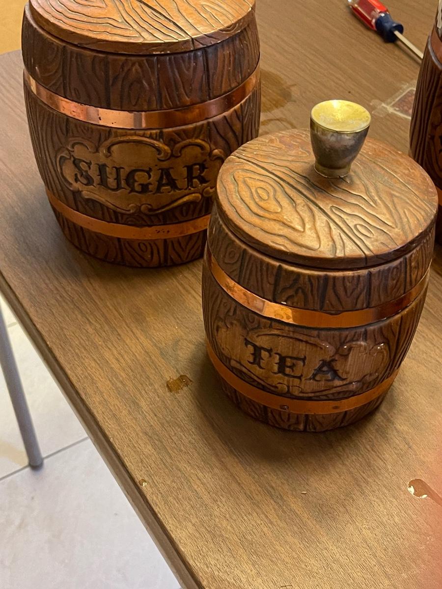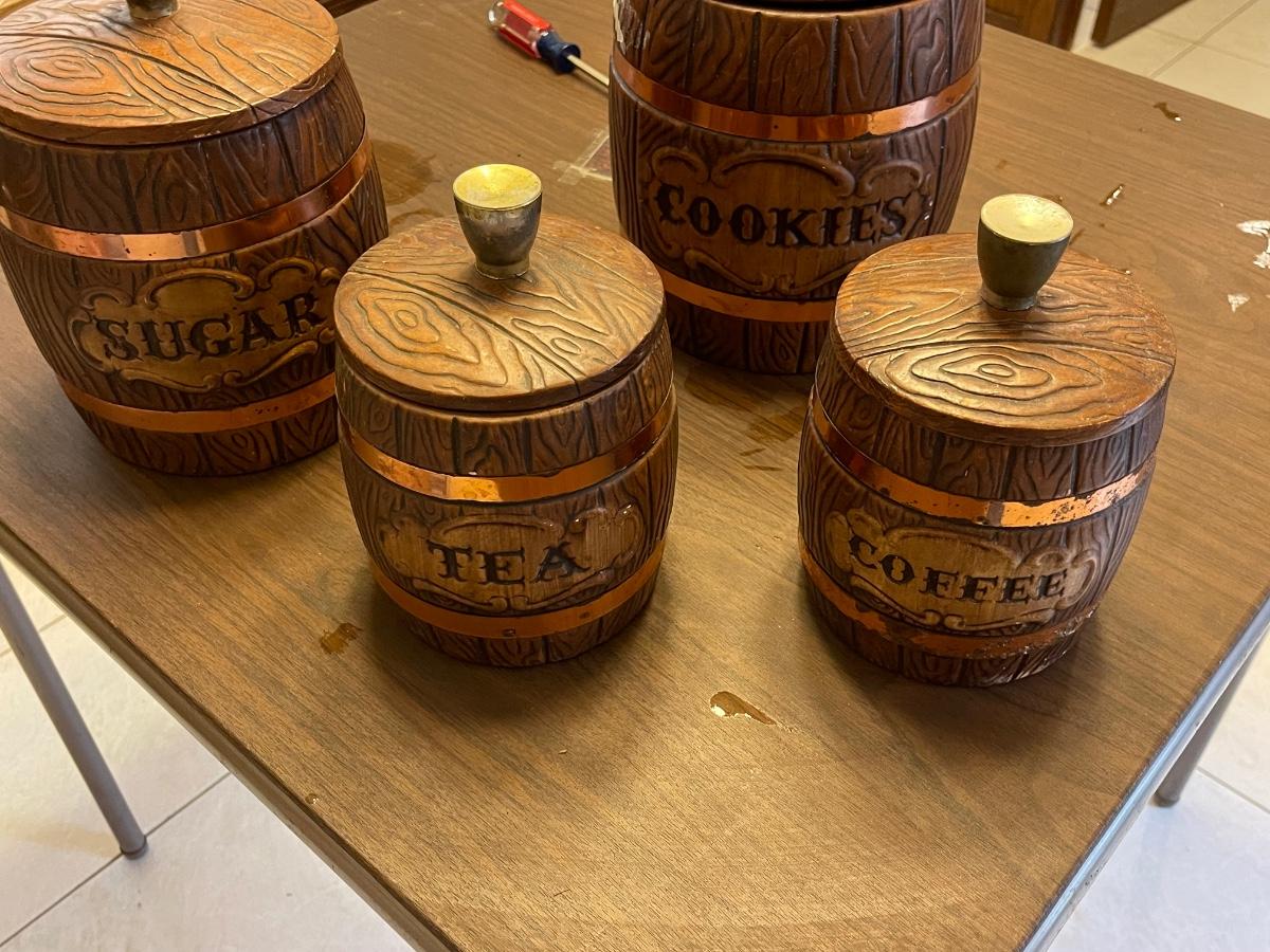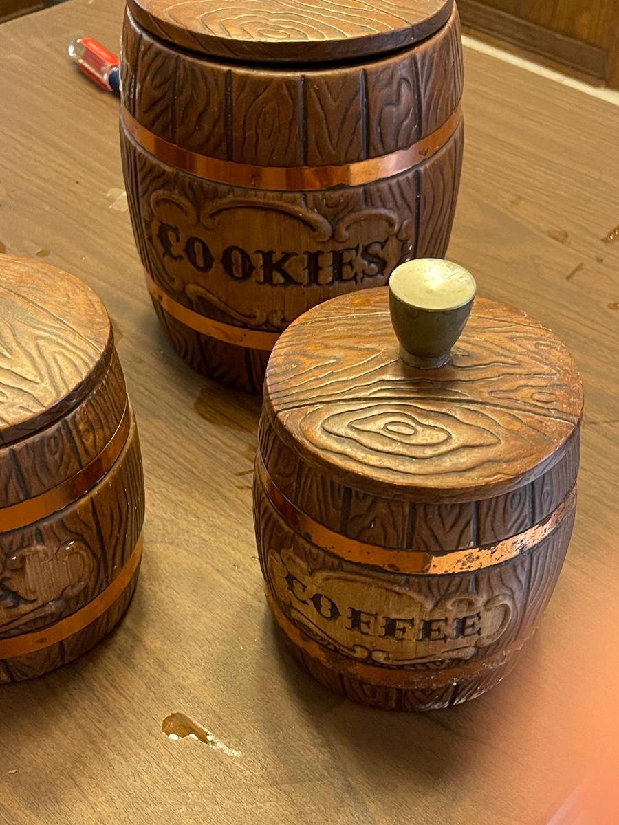 Four Vintage Treasure Craft Ceramic Barrel Canisters