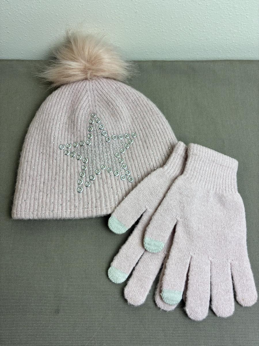 New Joan Voss Pink Star Beanie Hat and Glove Set