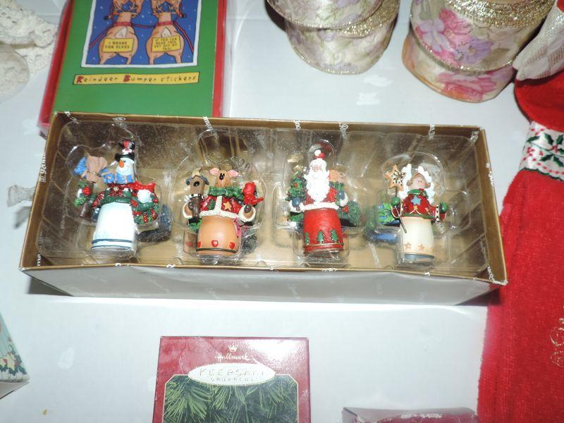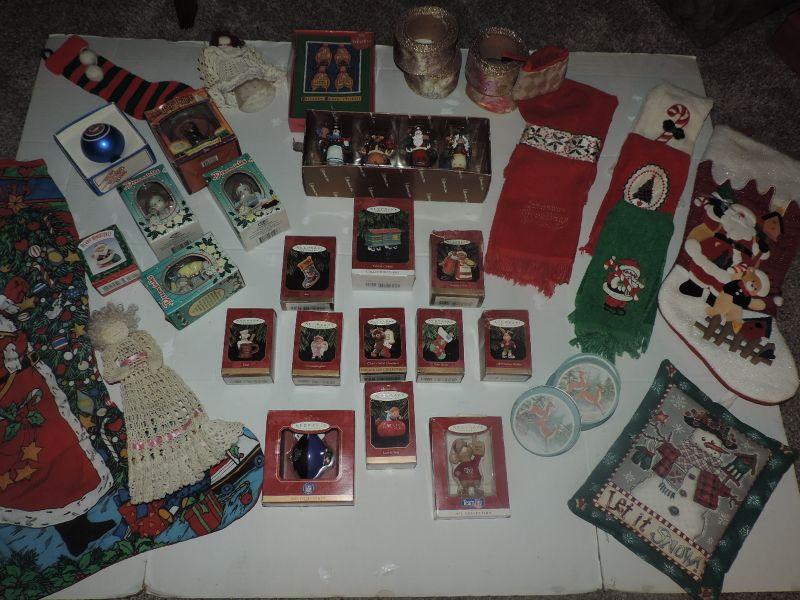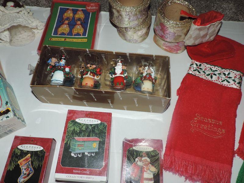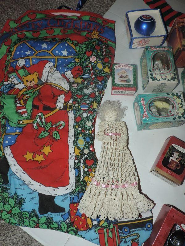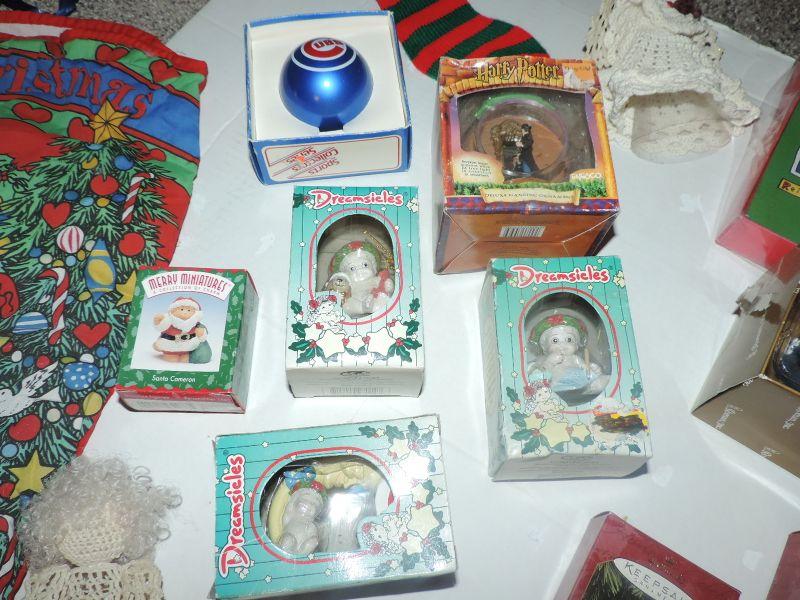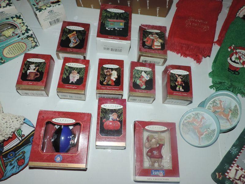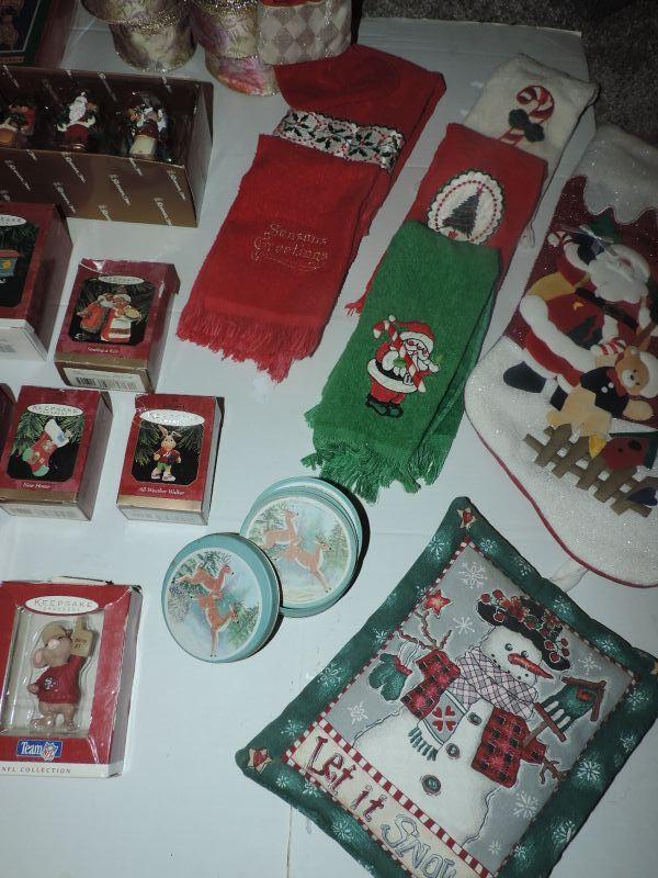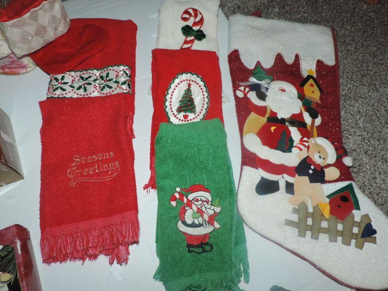 NIB ORNAMENTS FROM KEEPSAKE AND DREAMSICLE MAKE GREAT GIFTS, HOLIDAY HAND TOWELS, LARGE STOCKING THAT PLAYS MUSIC AND TWINKLES, AND MORE