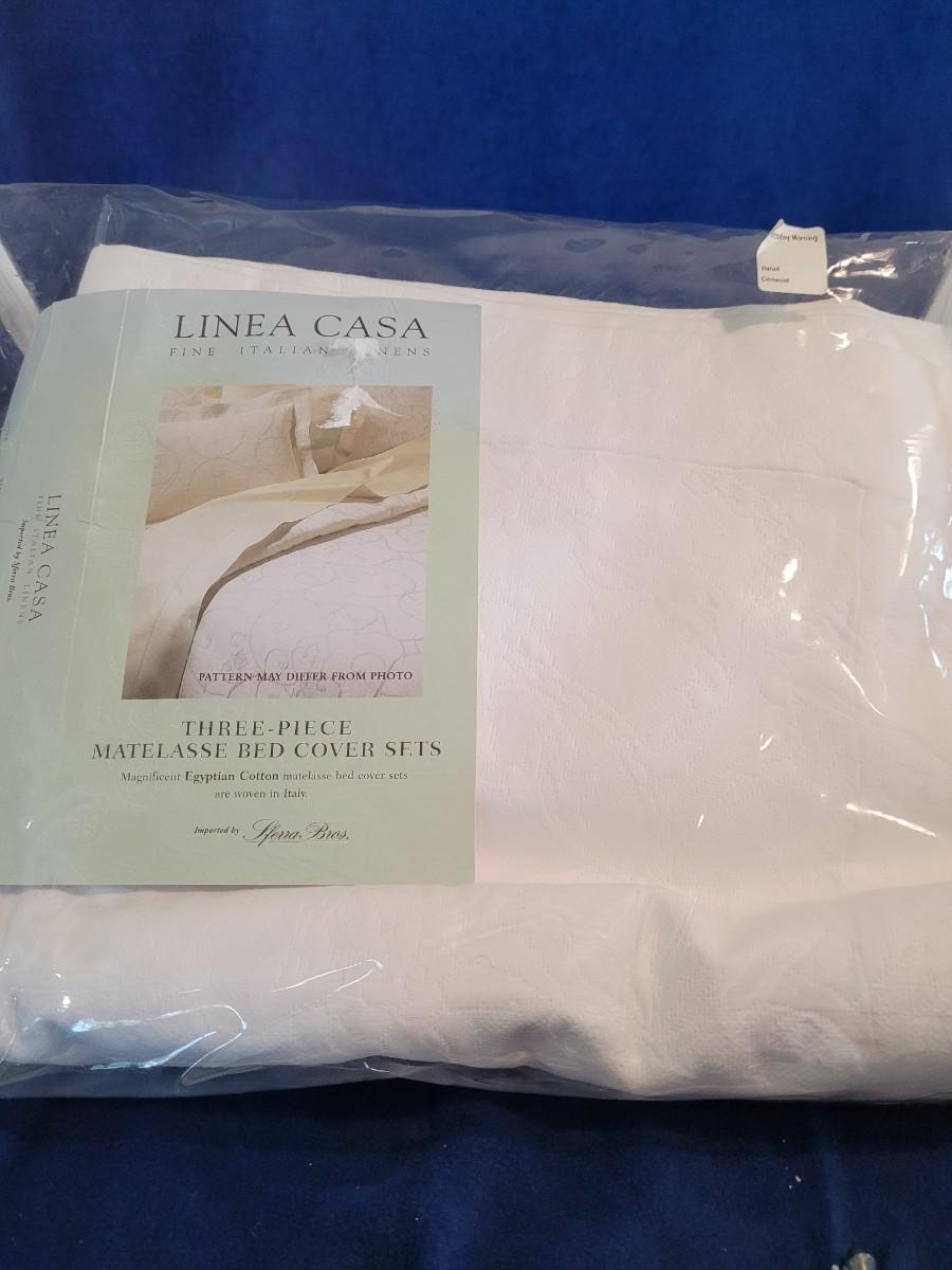New Linea Casa 3 pc bed set - Cover and 2 shams. A brocade type pattern, white queen size.