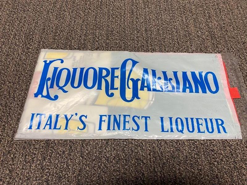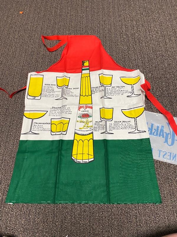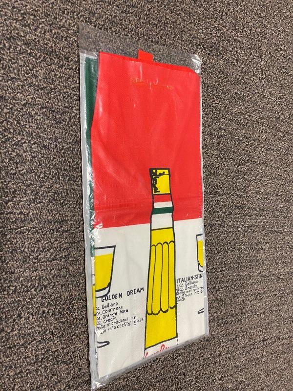 New in the original bag, Liquore Galliano Apron. Red, white, and green. Different Galliano mixed drink recipes on the front. No spots, stains, or discoloration. Bag is in good condition as well.