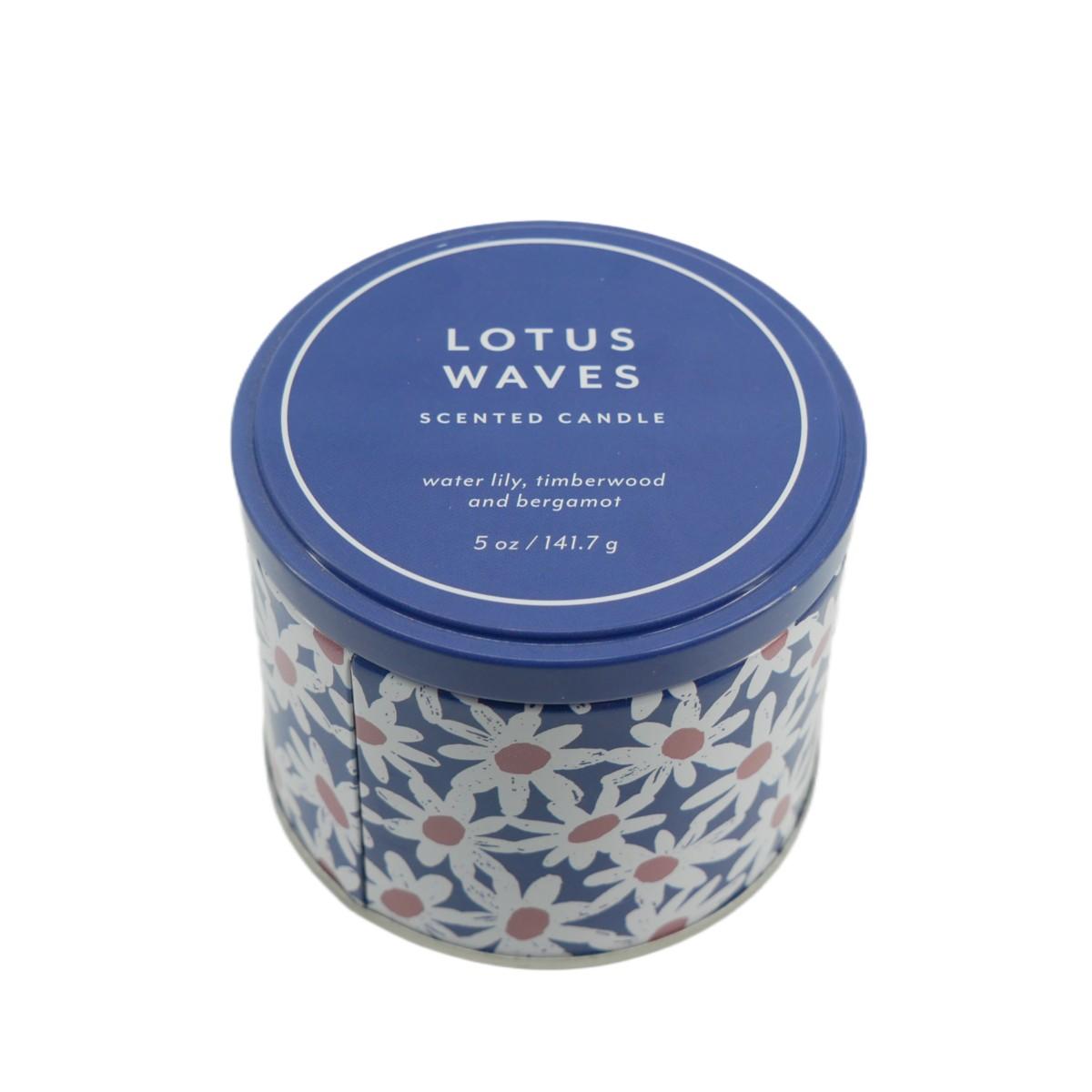 New, Lotus Waves 5 oz candle in blue flower tin. Fragrance notes: water lily, timberwood and bergamont.