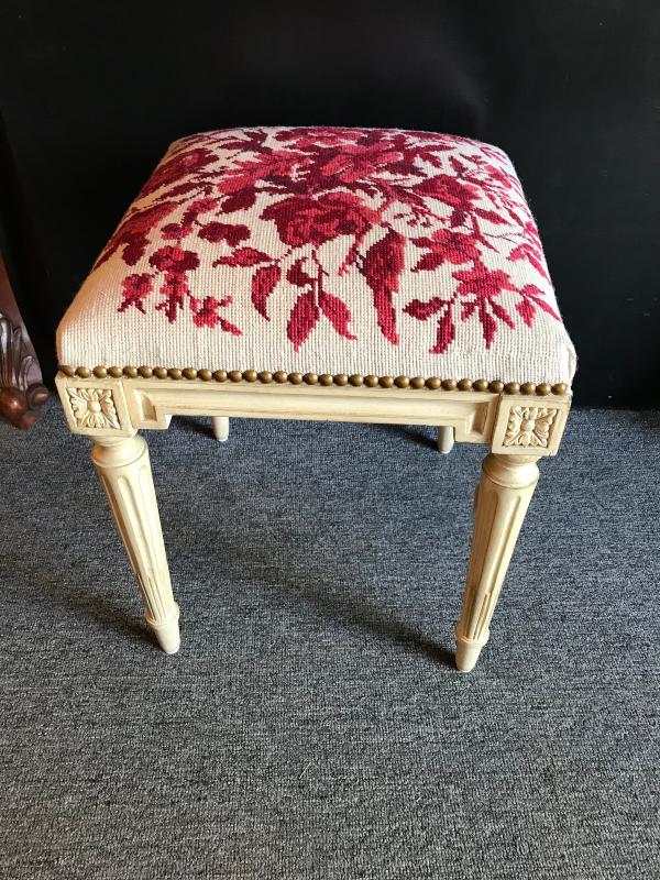 New decorator stool or ottoman in the French Louis XV style. Features turned and fluted legs and a carved and moulded skirt all in white glazed paint. Needlepoint upholstery in redwork flowers on white background. Nailhead trim. 17" x 17" x 19" H