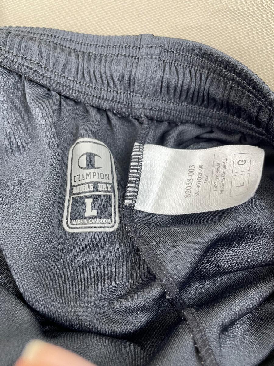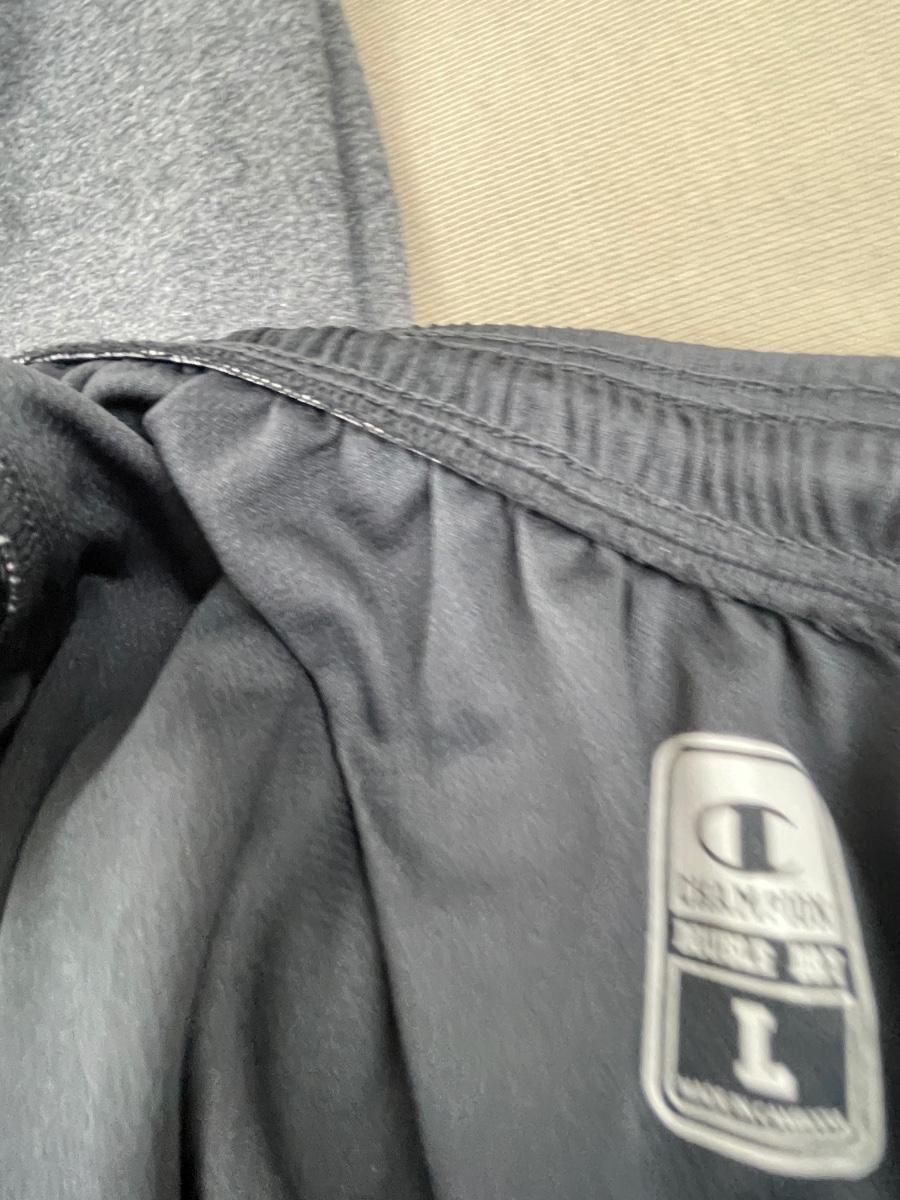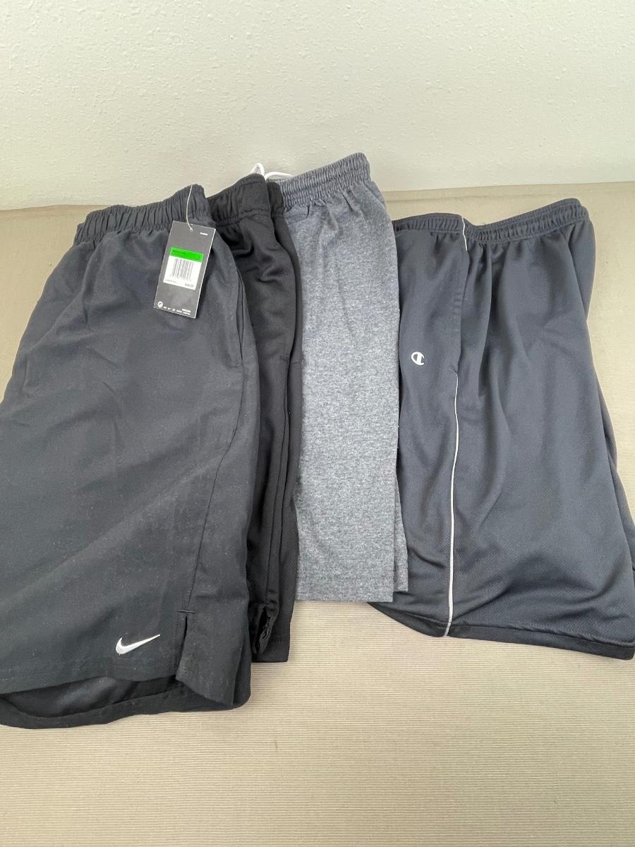 4 pairs of gym shorts, Champion, Wilson and Nike.