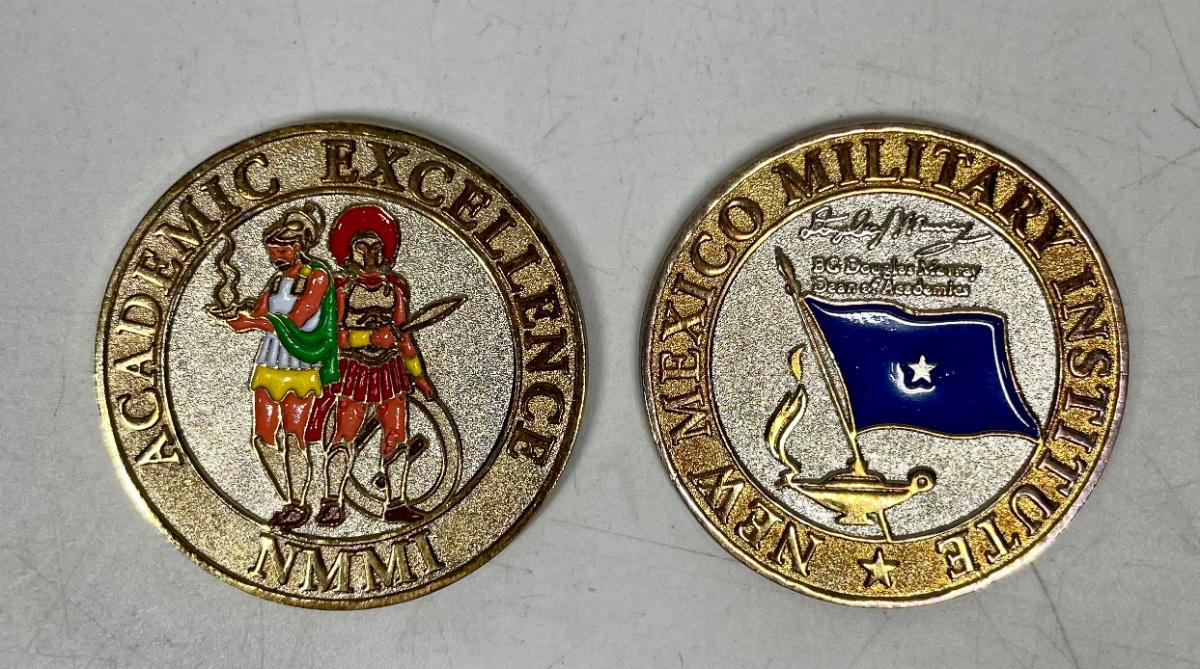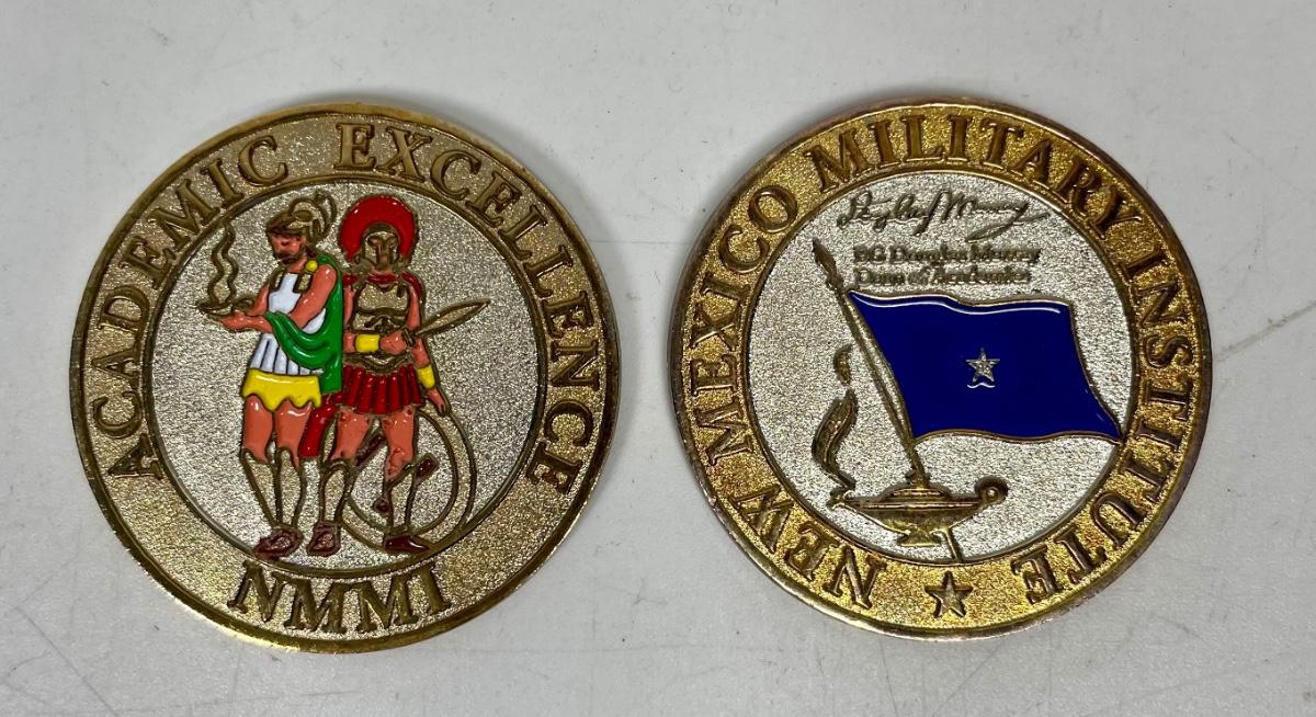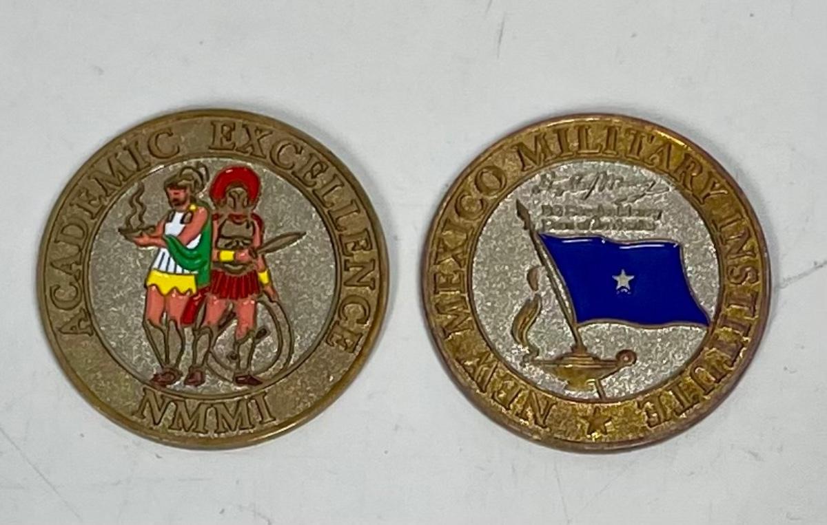Pair of undated coins. Obverse is "NMMI Academic Excellence" surrounding an image of 2 Ancient Warriors and the reverse is "Mew Mexico Military Institute" surrounding a blue flag and a Lamp of Knowledge. NMMI is a military prep school for grades 6 through Jr. College.