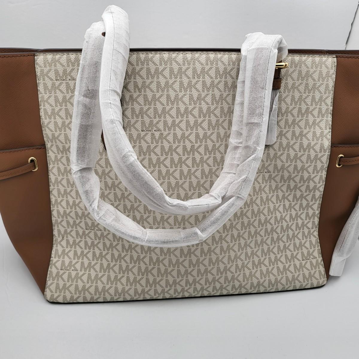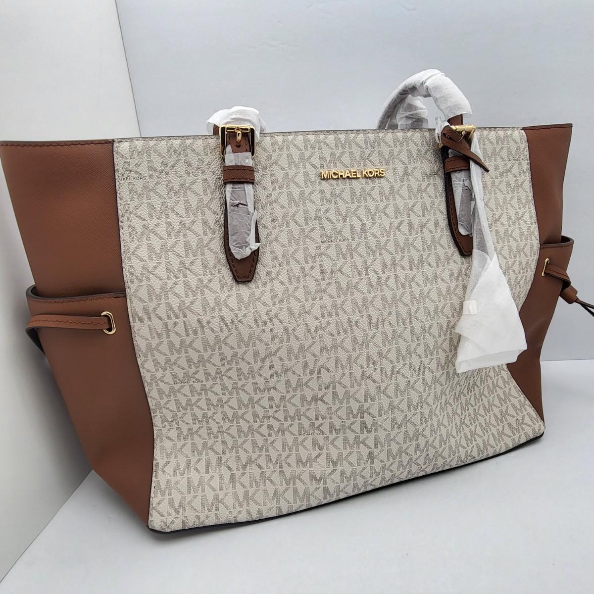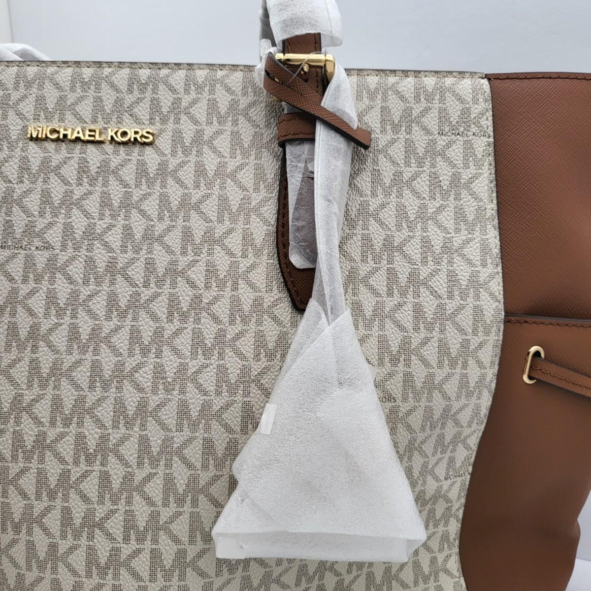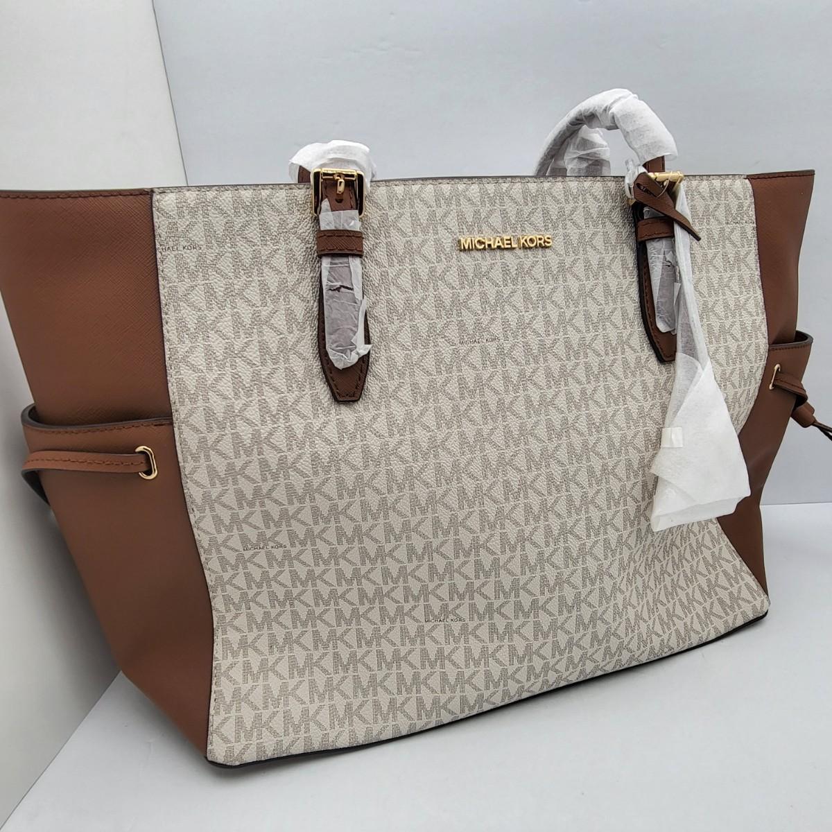 New Michael Kors large travel tote. Vanilla & camel brown leather, signature exterior. Signature nylon fabric lining. Parts of it are still foam wrapped. It measures 18" long x 11.25" tall x 6.5" deep. Leather drawstring sides. Top zipper closure.