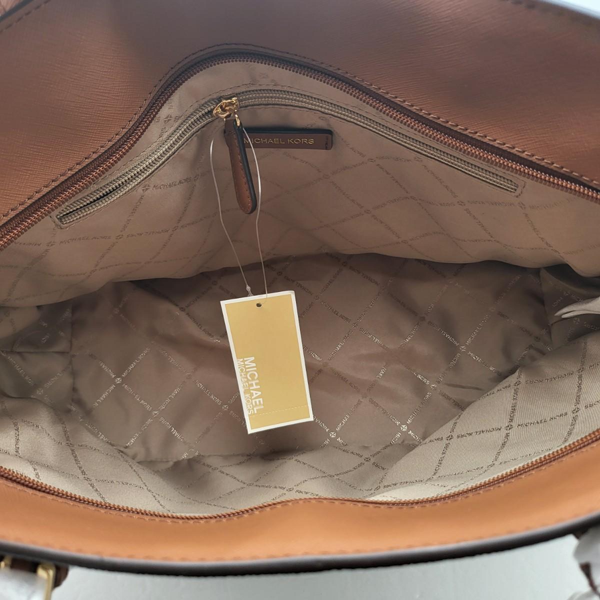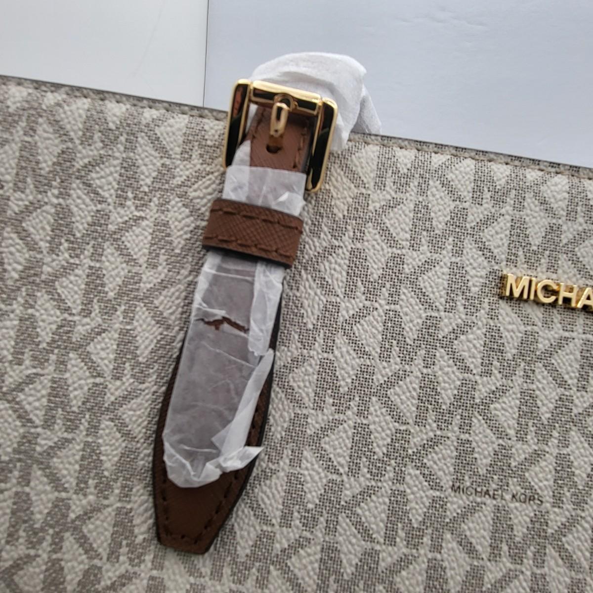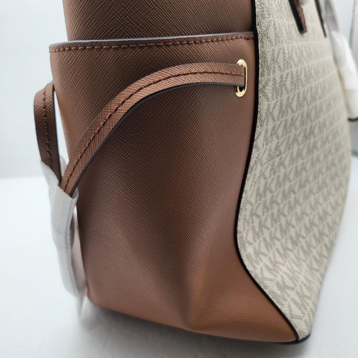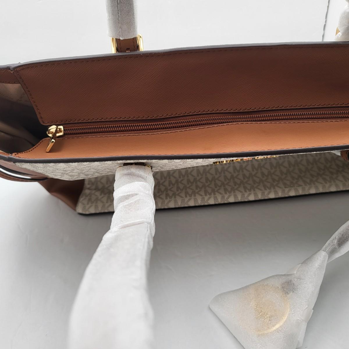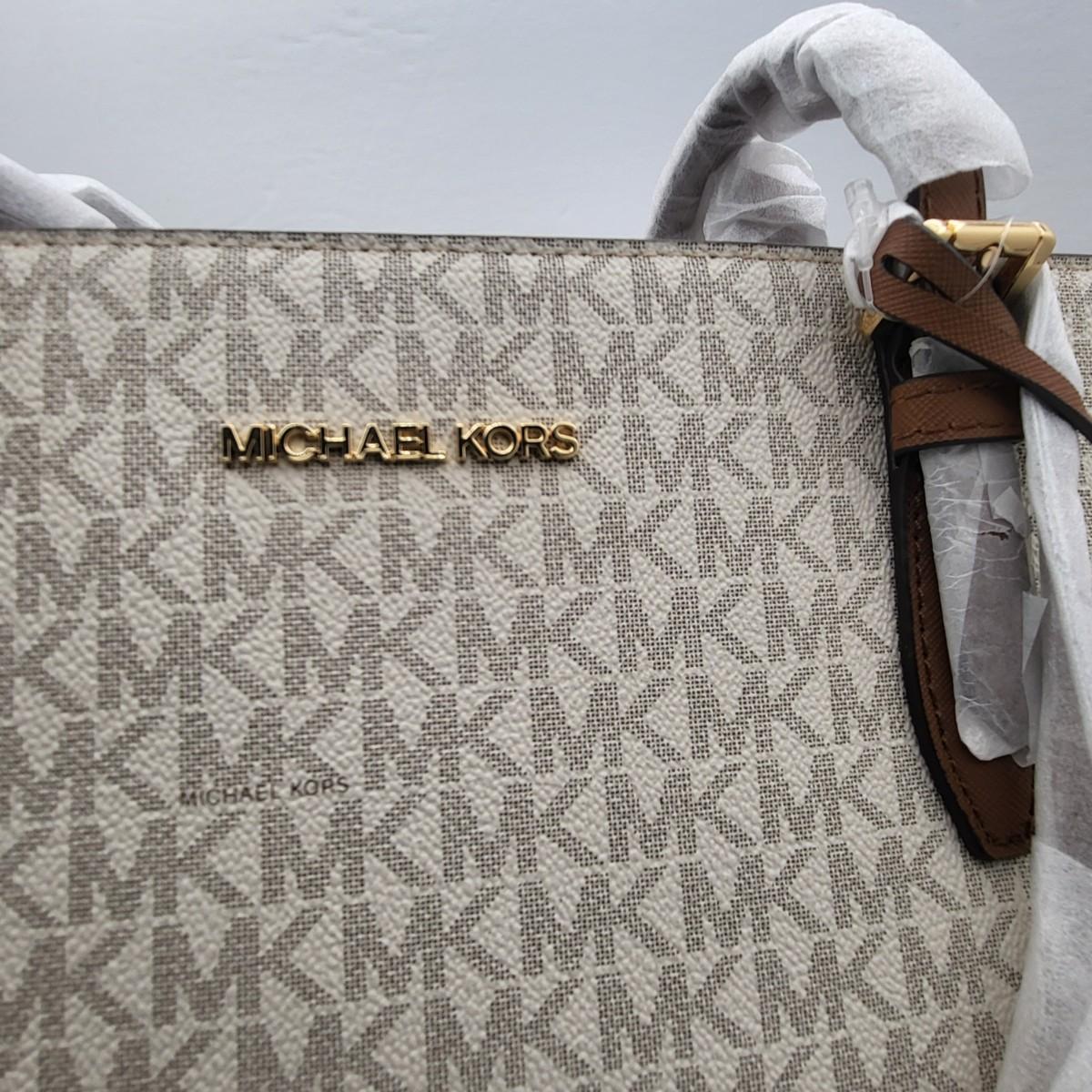 New Michael Kors large travel tote. Vanilla & camel brown leather, signature exterior. Signature nylon fabric lining. Parts of it are still foam wrapped. It measures 18" long x 11.25" tall x 6.5" deep. Leather drawstring sides. Top zipper closure.