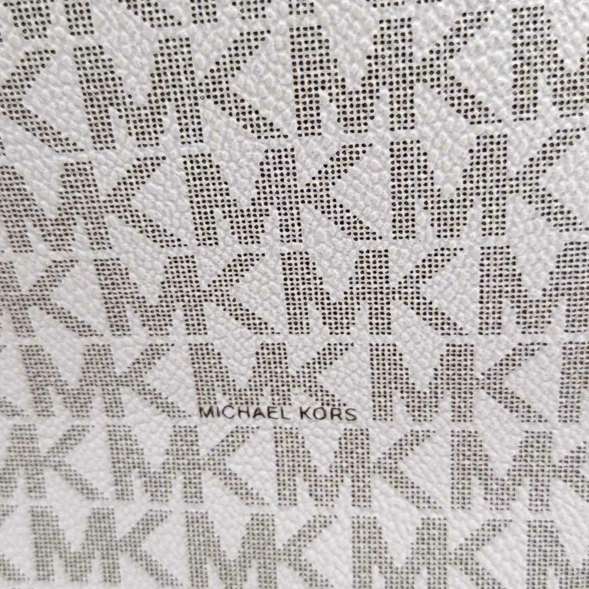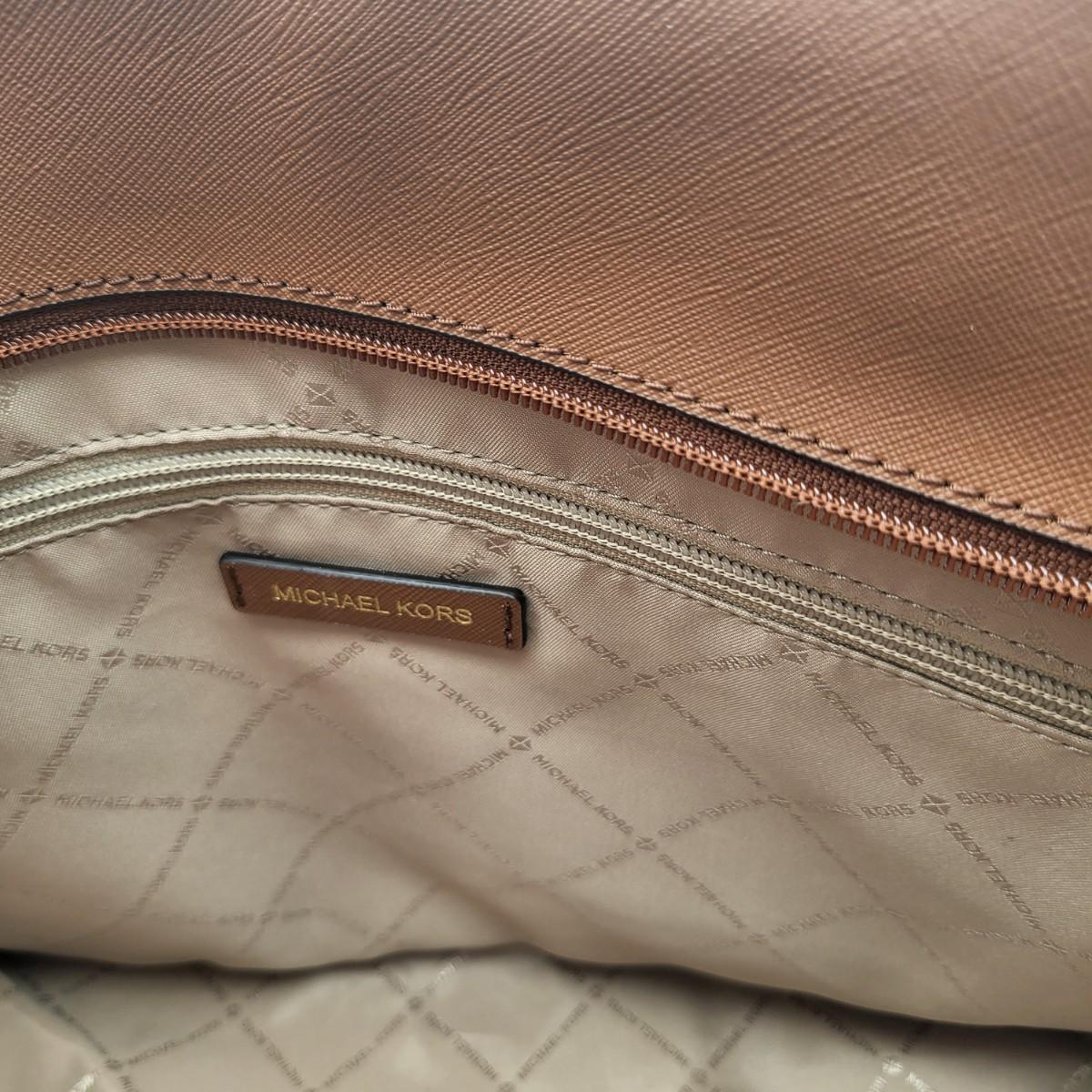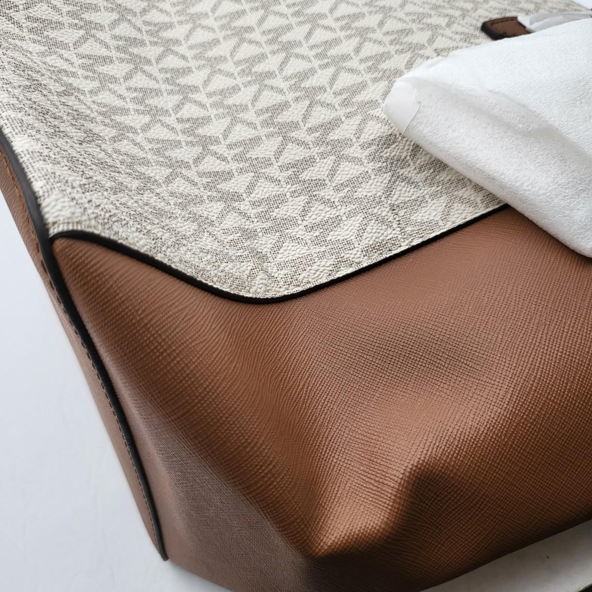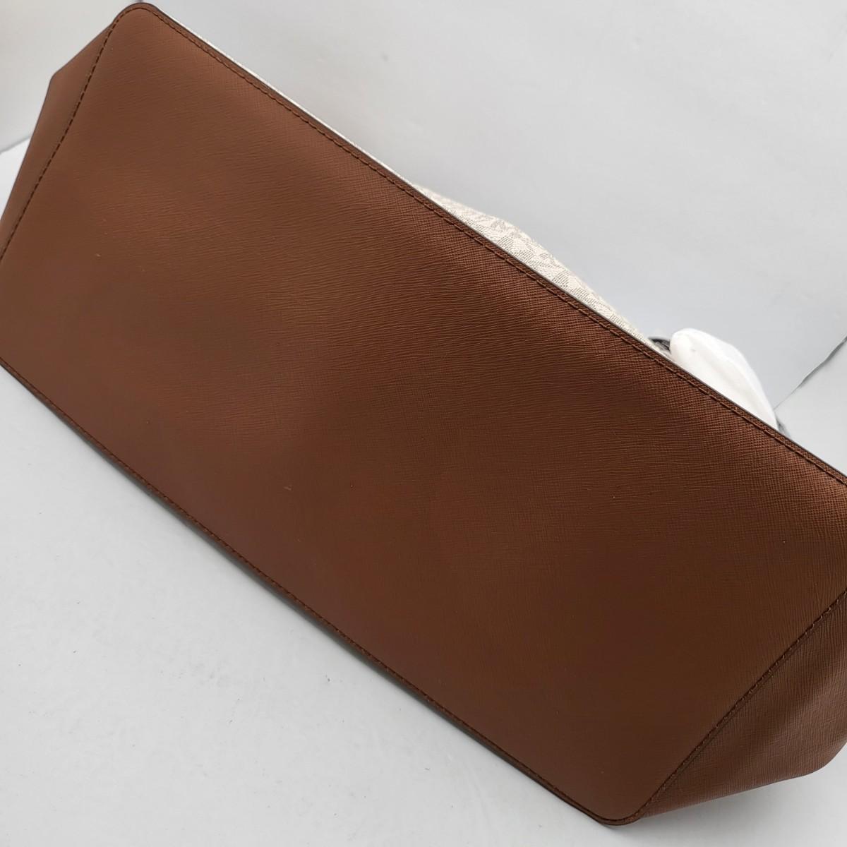 New Michael Kors large travel tote. Vanilla & camel brown leather, signature exterior. Signature nylon fabric lining. Parts of it are still foam wrapped. It measures 18" long x 11.25" tall x 6.5" deep. Leather drawstring sides. Top zipper closure.