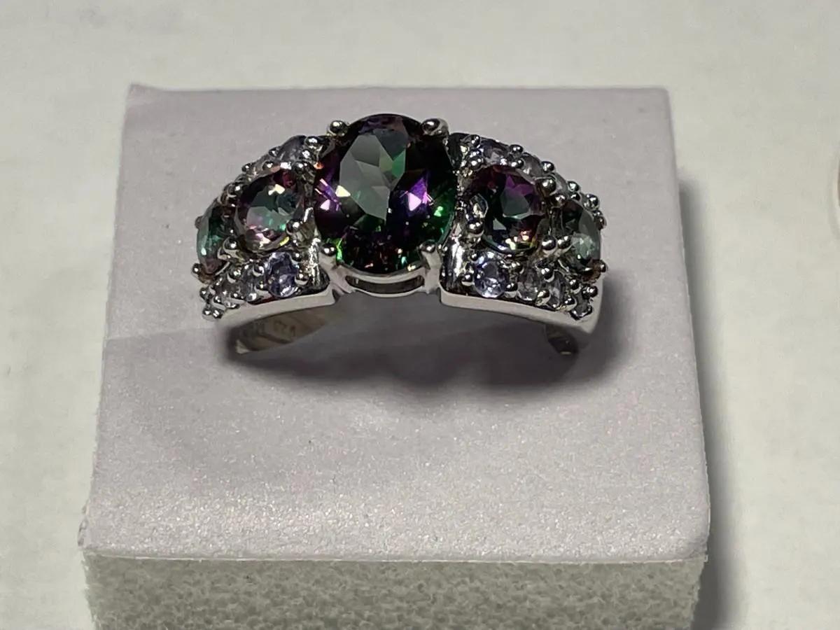 New Never Worn .925 Sterling Silver Designer Iridescent Colored Stone Band Ring Size-8.75 as Pictured. $5 DOMESTIC SHIPPING.