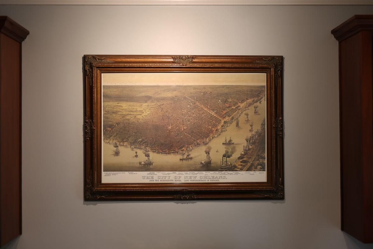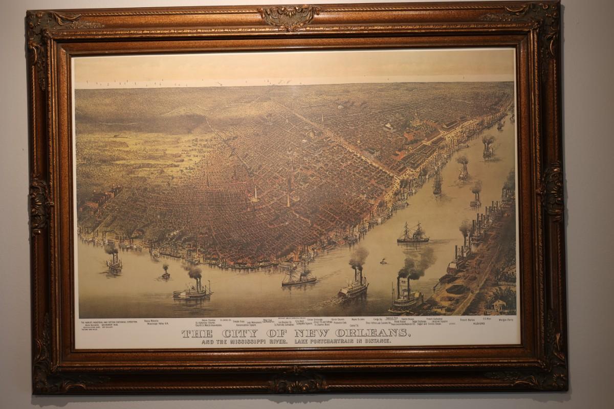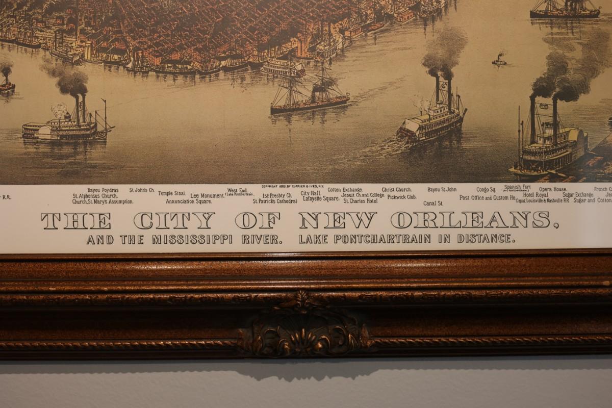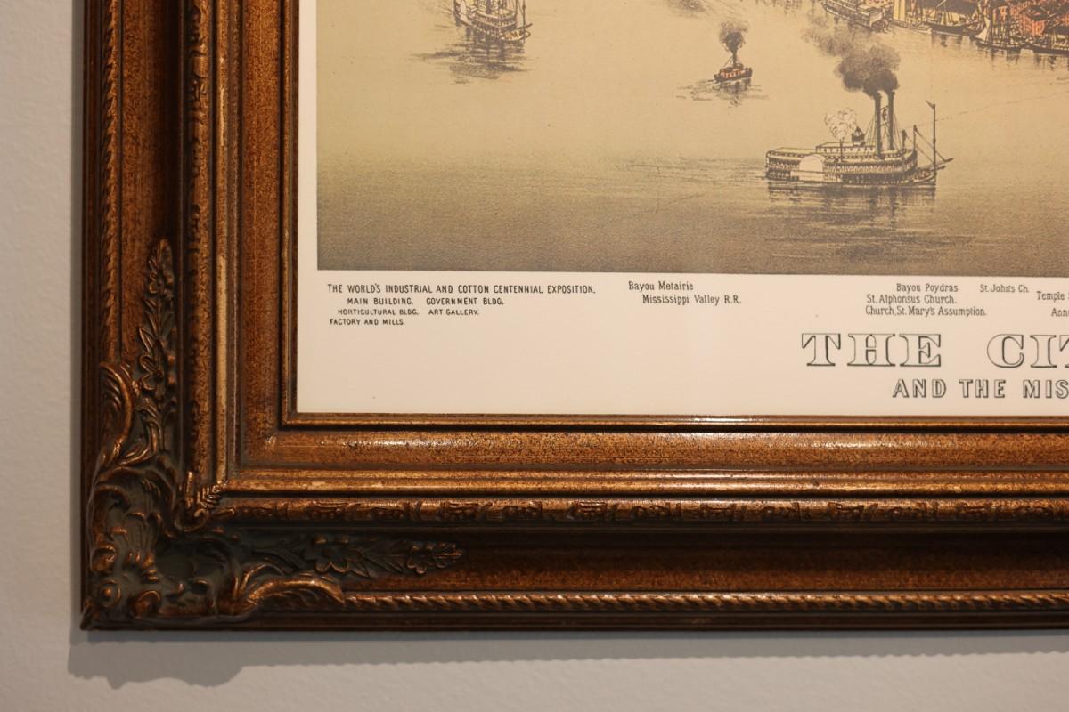 Large framed print titled “The City of New Orleans and the Mississippi River, Lake Pontchartrain in Distance,” depicting an aerial view of the city and river traffic, with labeled landmarks and references to the World’s Industrial and Cotton Centennial Exposition. Print is housed in an ornate, decorative frame. Overall good condition and ready to hang.