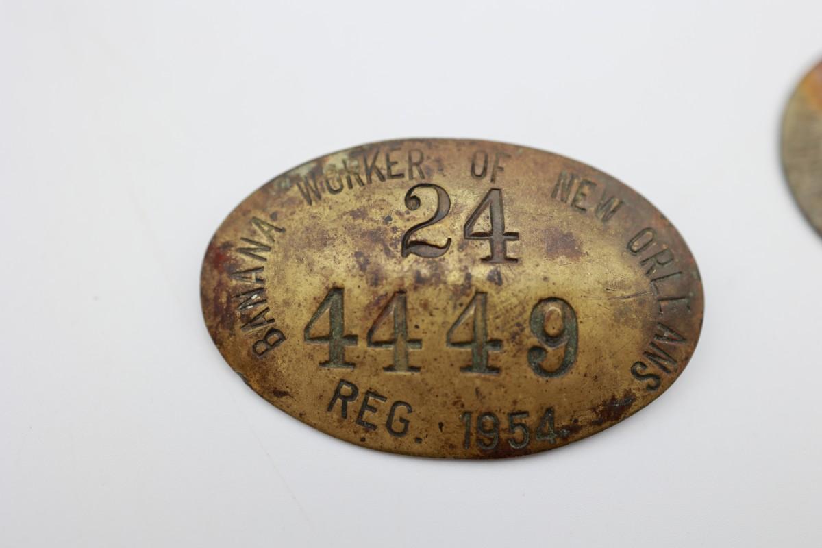 The middle oval badge reads "BANANA WORKER OF NEW ORLEANS, 1954"