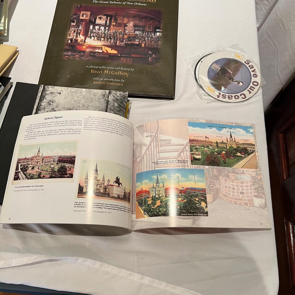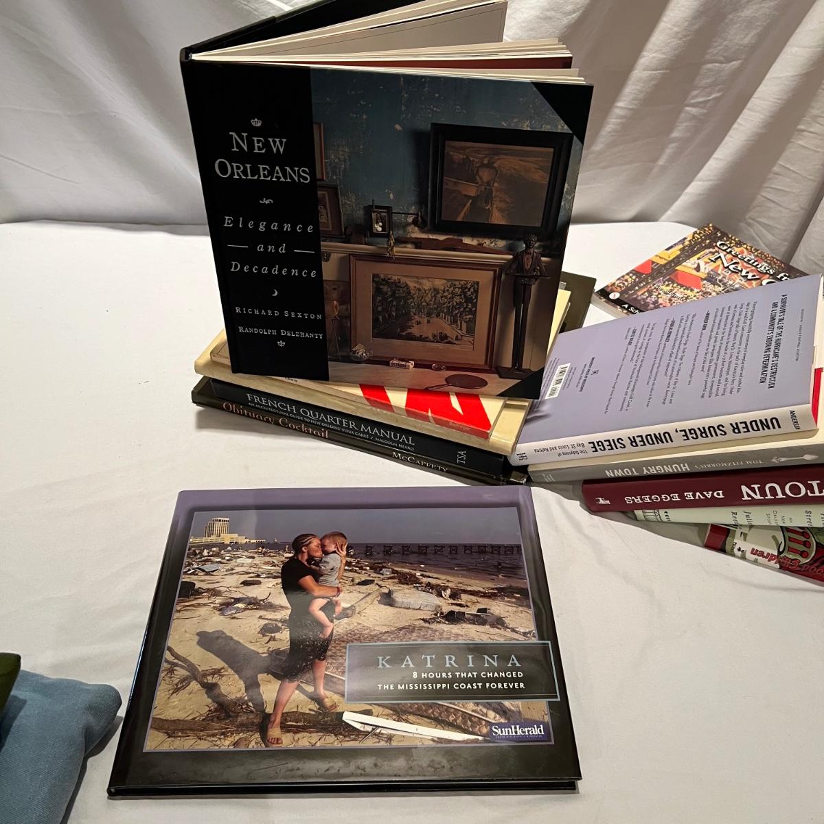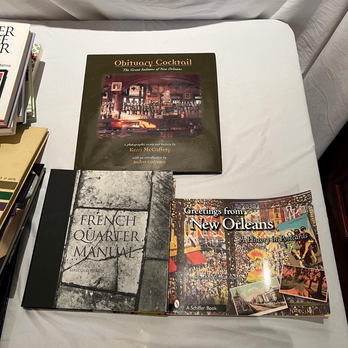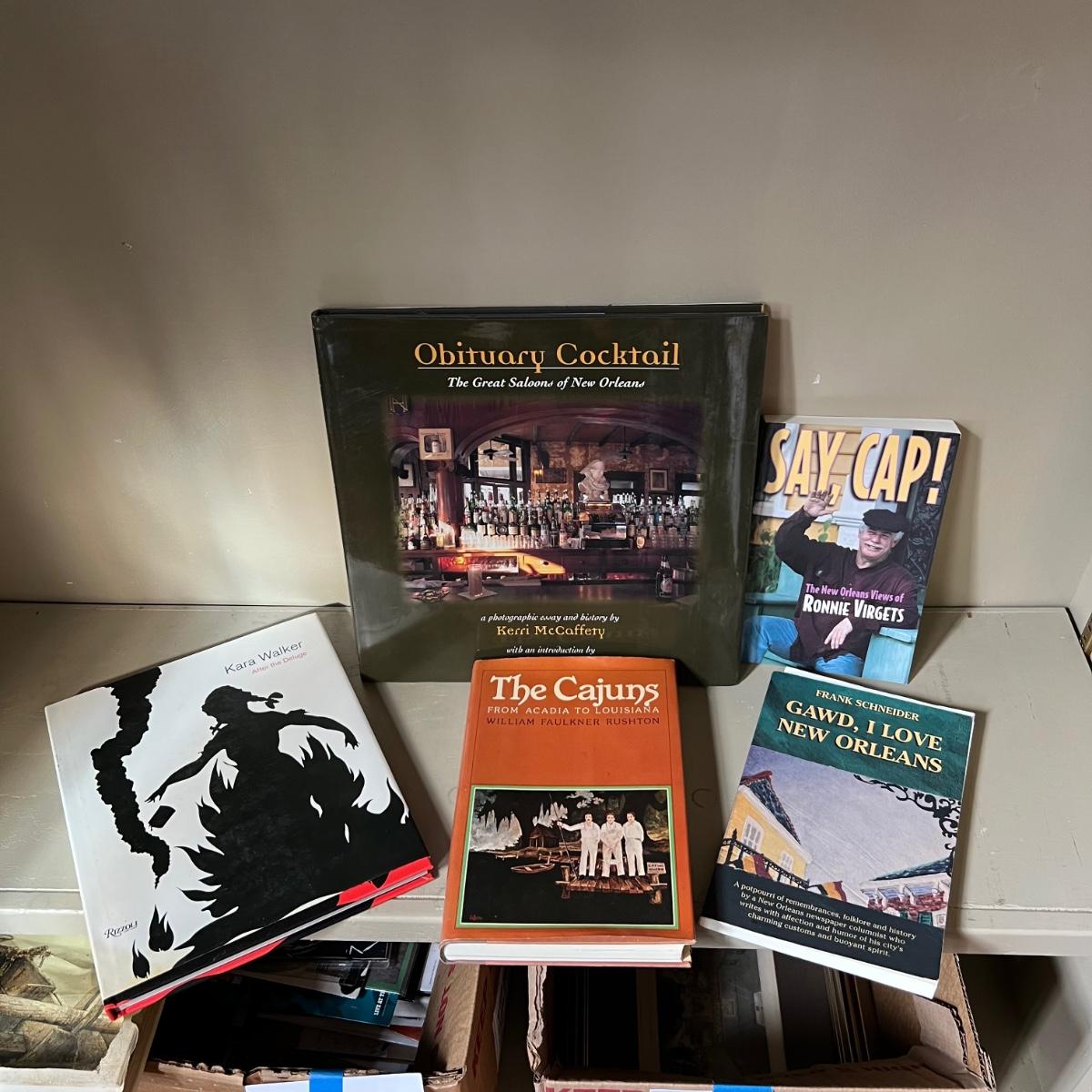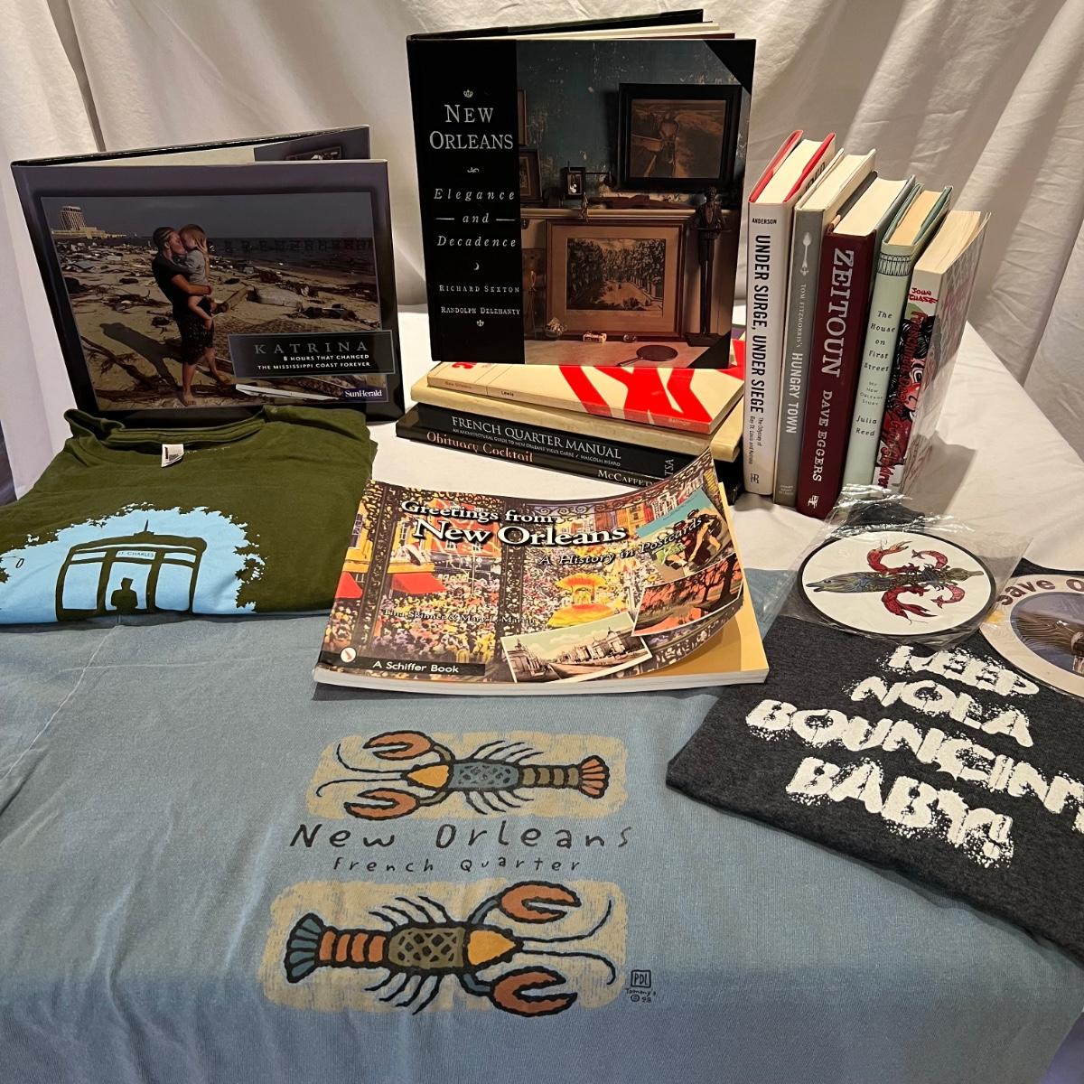 An assortment of New Orleans items includes 12 plus books, see images for titles and more information. Two magnets and three t-shirts also included; one is medium the other two are XL (blue shirt has no tag but appears to be XL. A couple of books are First Editions, see photos.
