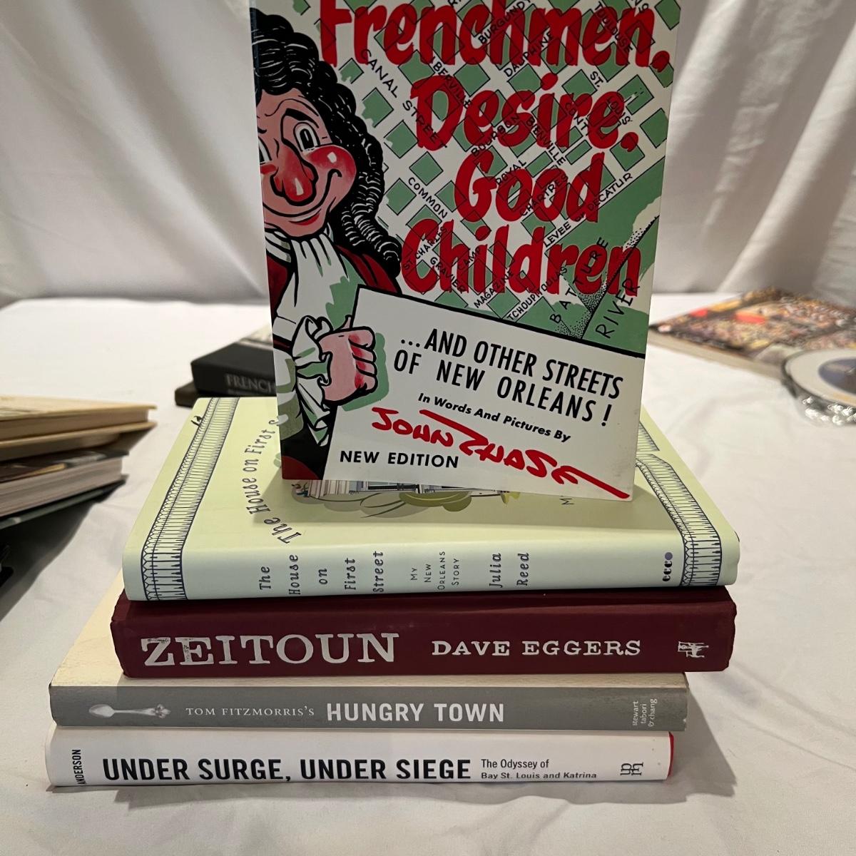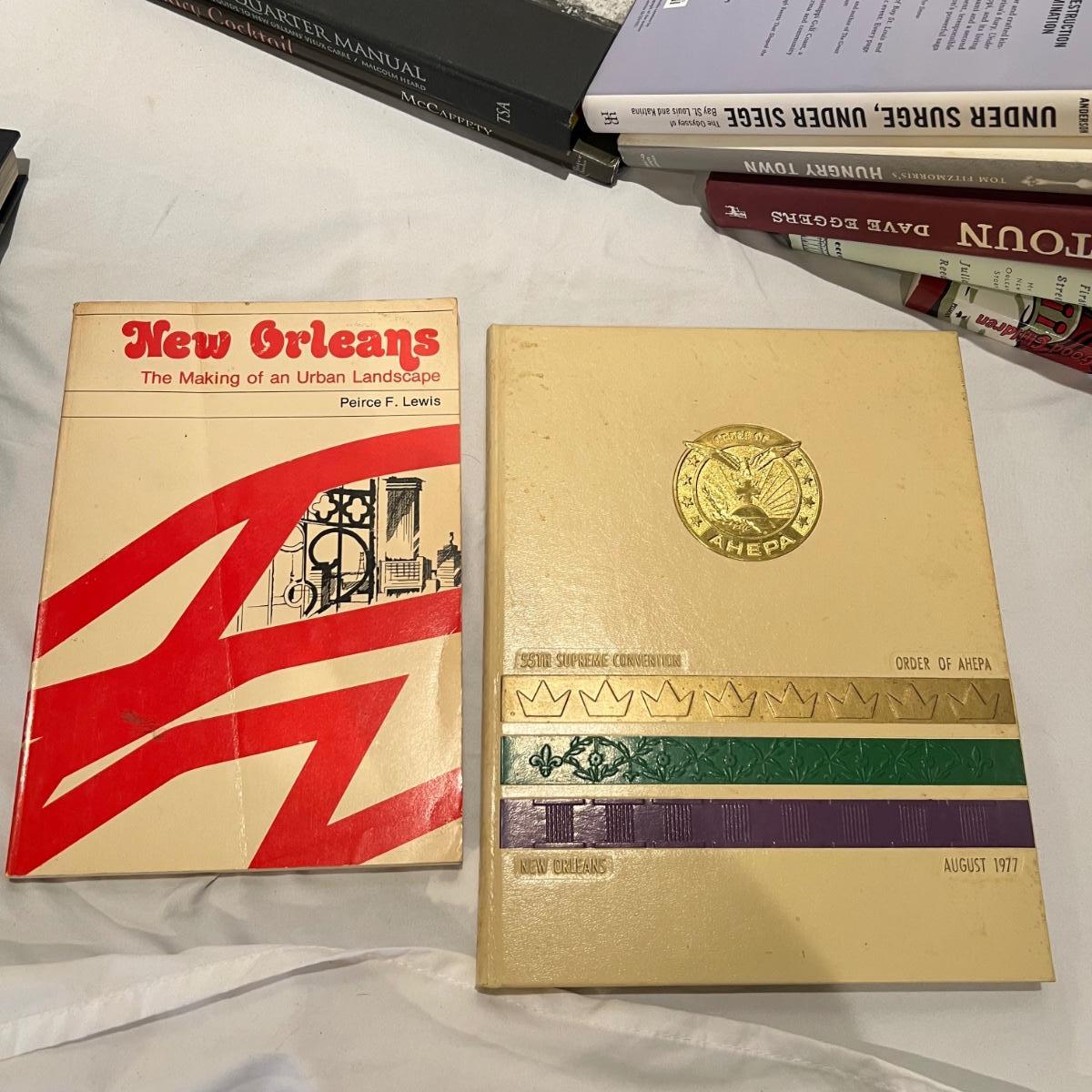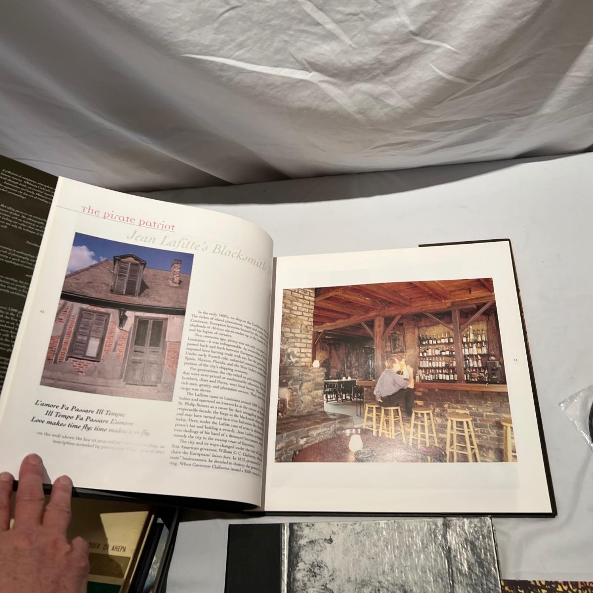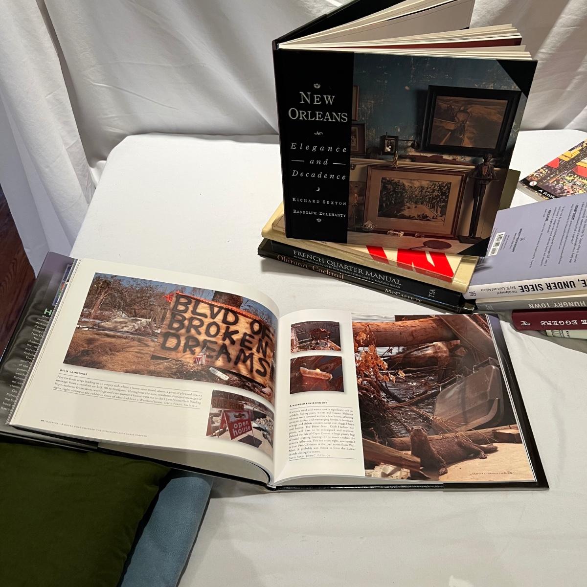 An assortment of New Orleans items includes 12 plus books, see images for titles and more information. Two magnets and three t-shirts also included; one is medium the other two are XL (blue shirt has no tag but appears to be XL. A couple of books are First Editions, see photos.