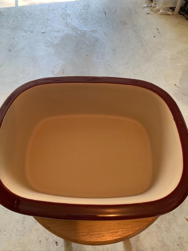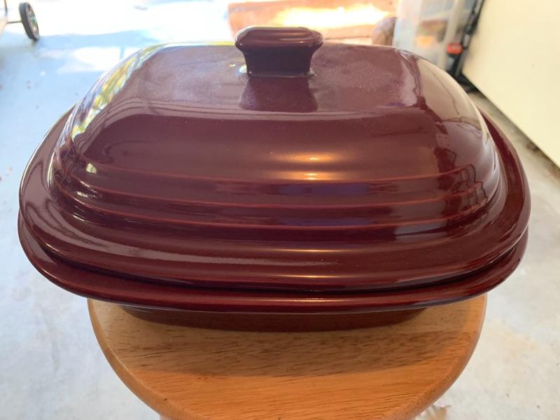 BURGUNDY PAMPERED CHEF ROASTER WITH LID. APPROX 13 INCHES.