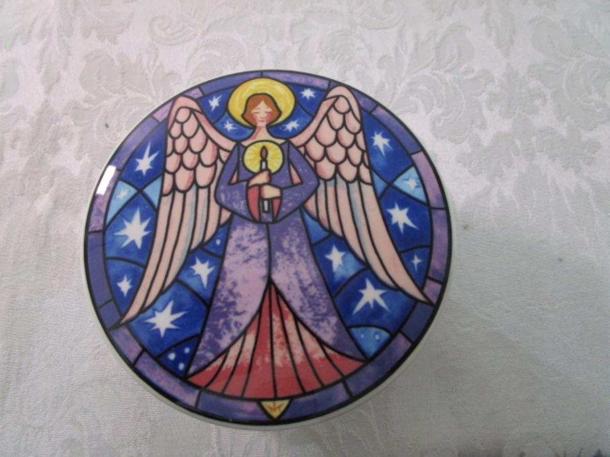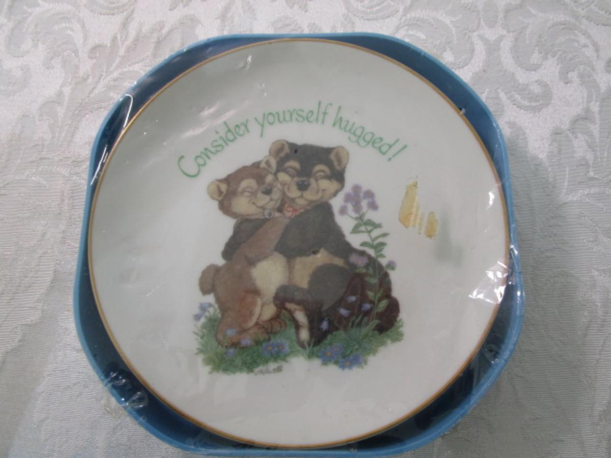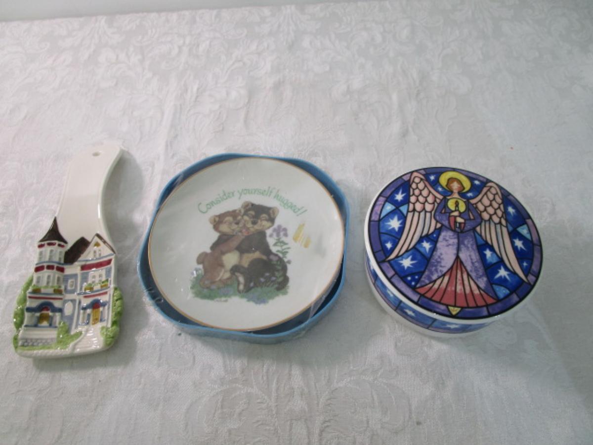 New American Greetings plate is 6" across & has "Consider Yourself Hugged" on it; new condition Mikasa dish is Model HK 501 Angel 4-3/4" across; excellent condition Spoon Holder is 9" long