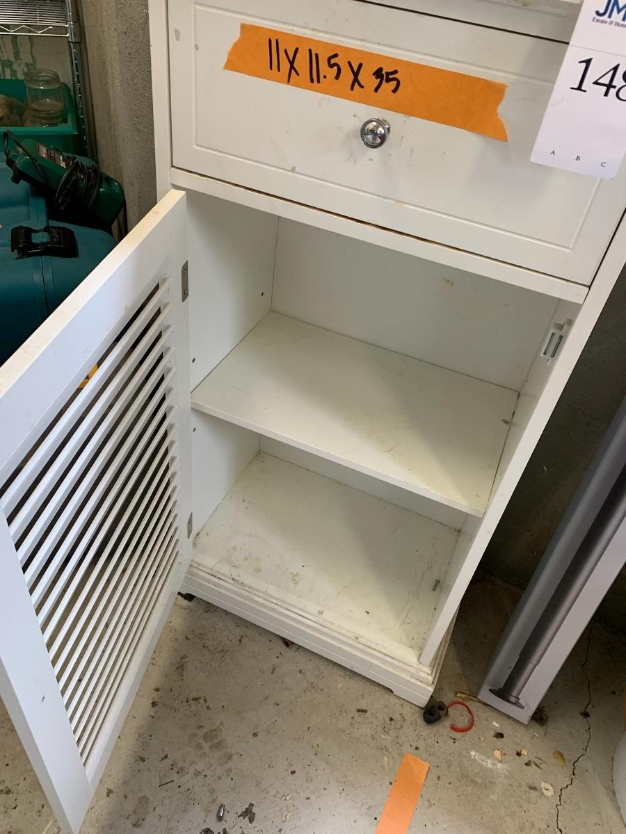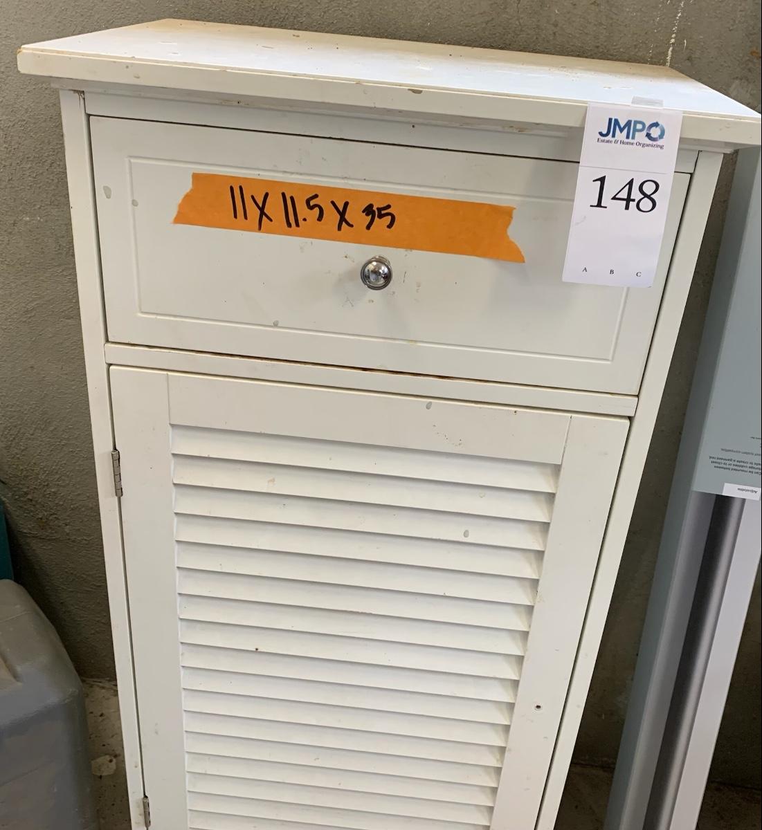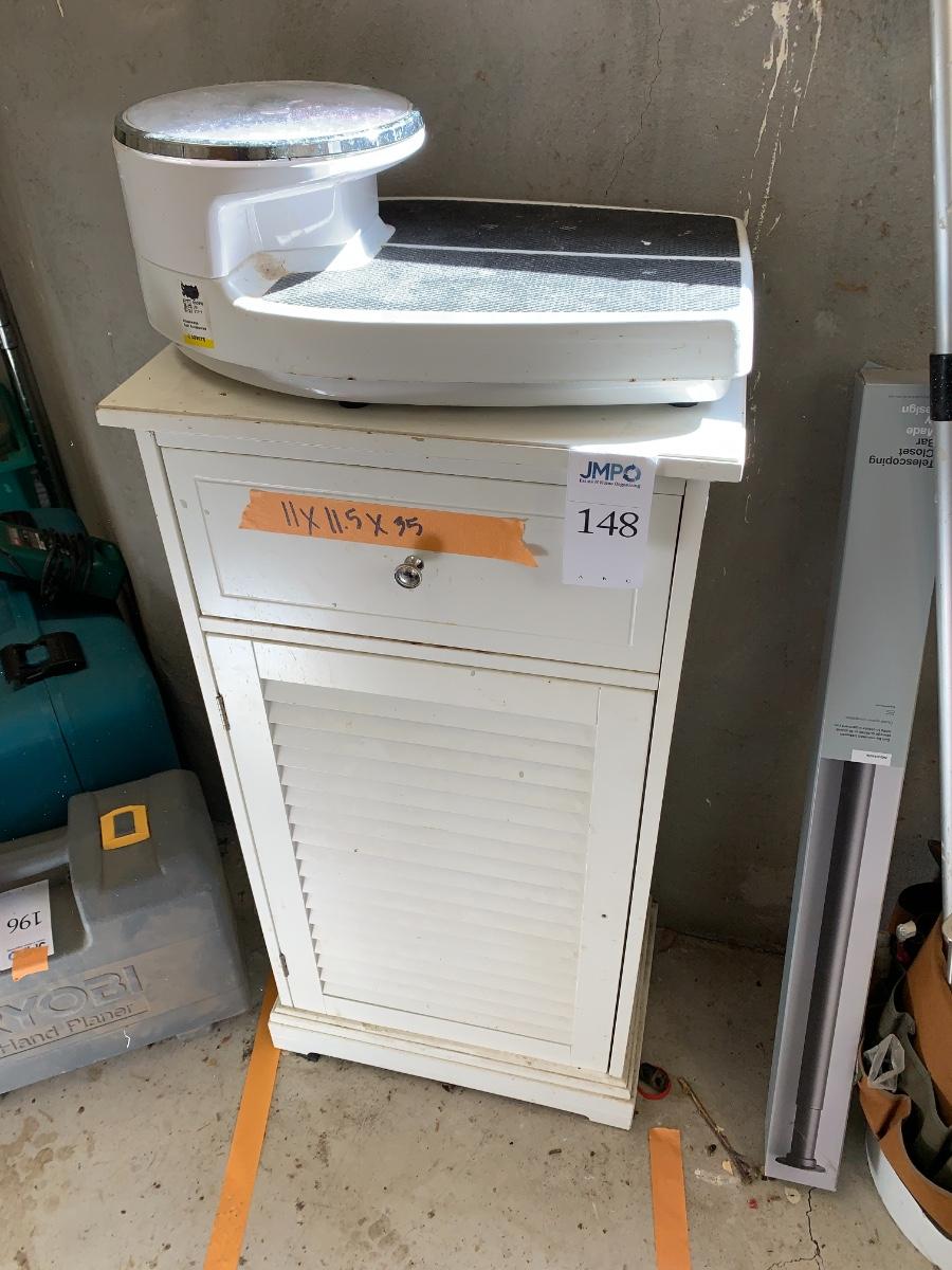 Health-o-meter vintage bathroom scale. White cabinet with louvered door and one drawer, some nicks. New in box sliding cabinet drawer.