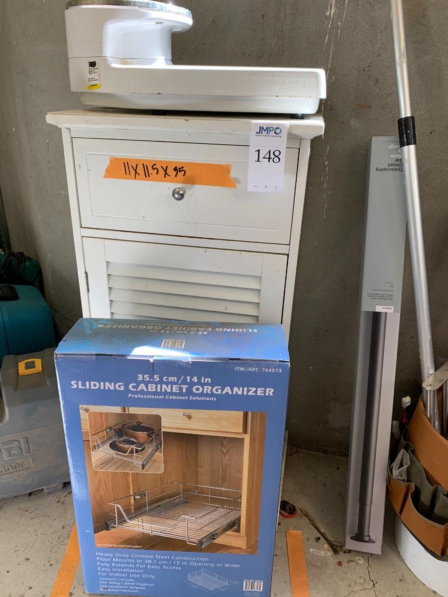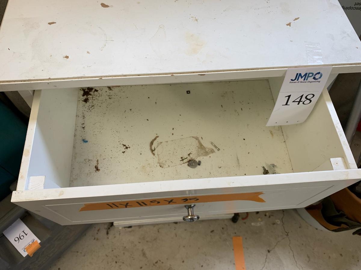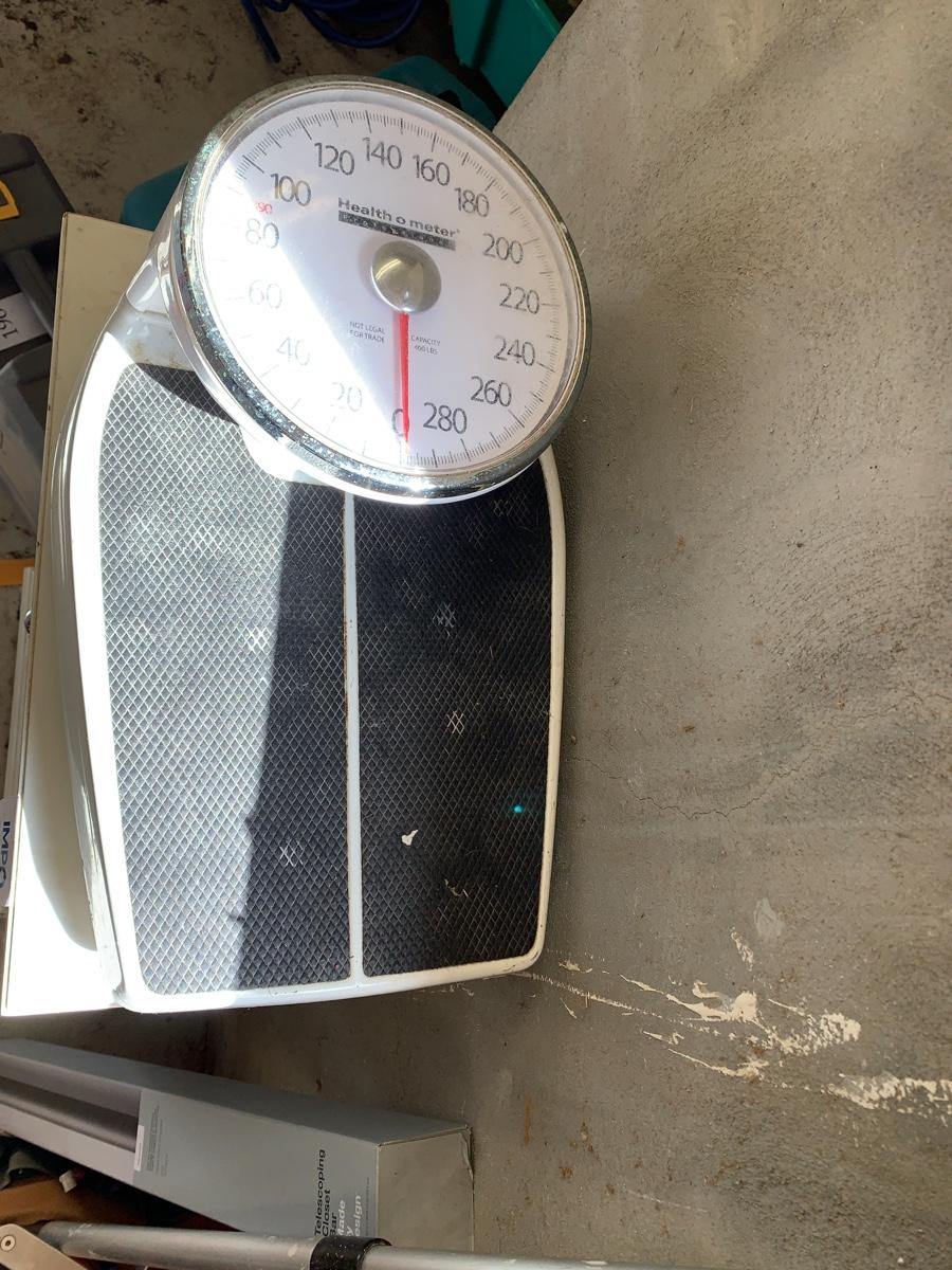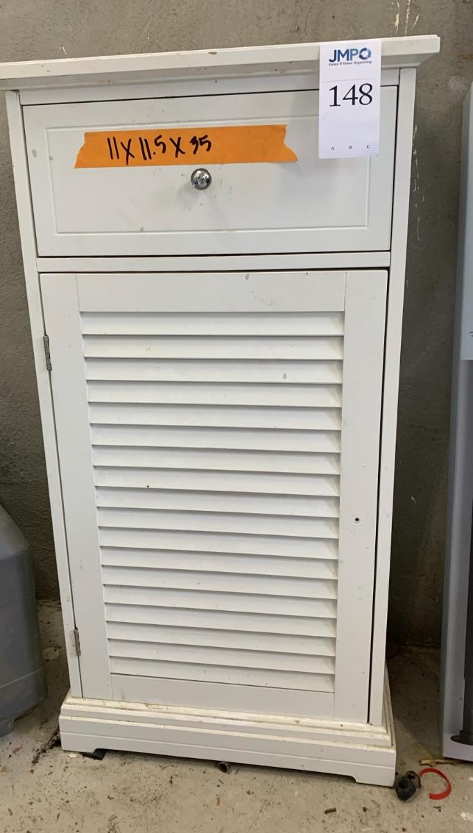 Health-o-meter vintage bathroom scale. White cabinet with louvered door and one drawer, some nicks. New in box sliding cabinet drawer.