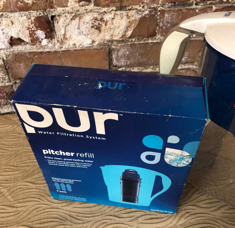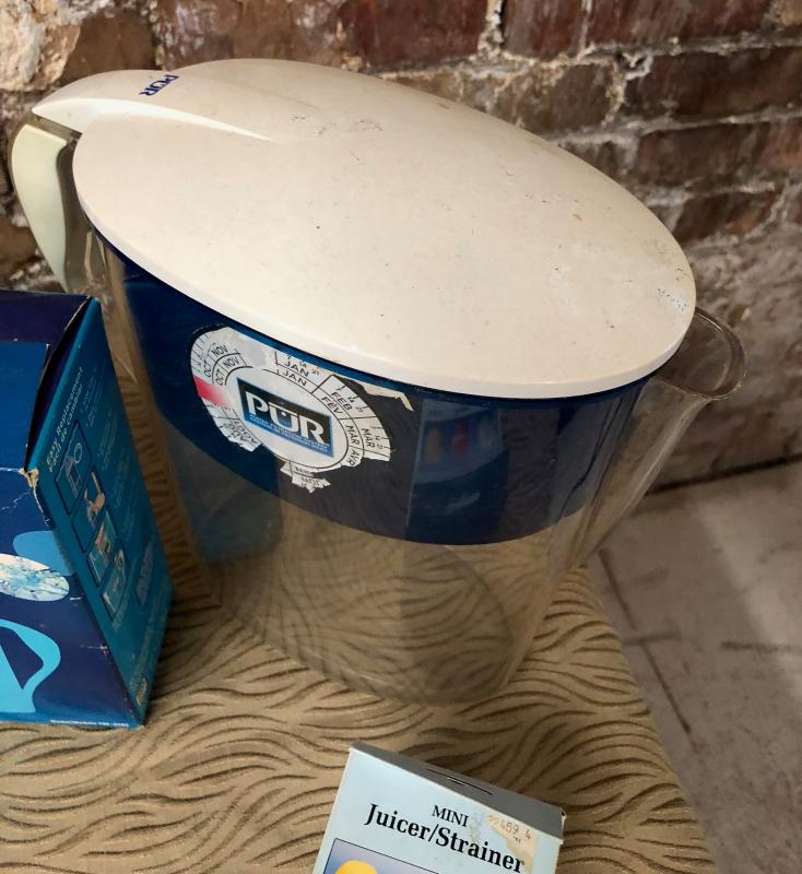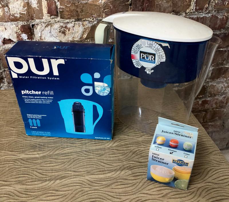 New with refill here is a Pur water filtration pitcher and a mini juice strainer...