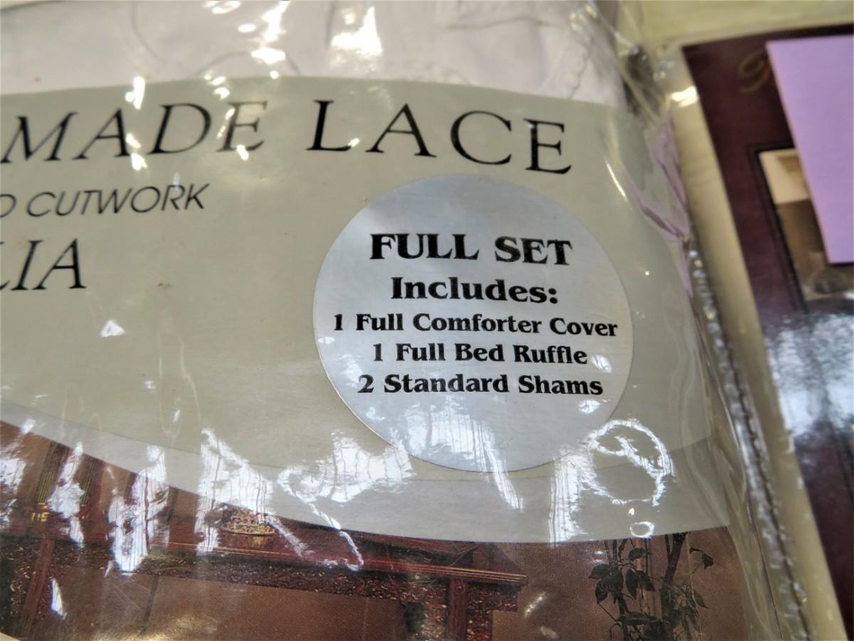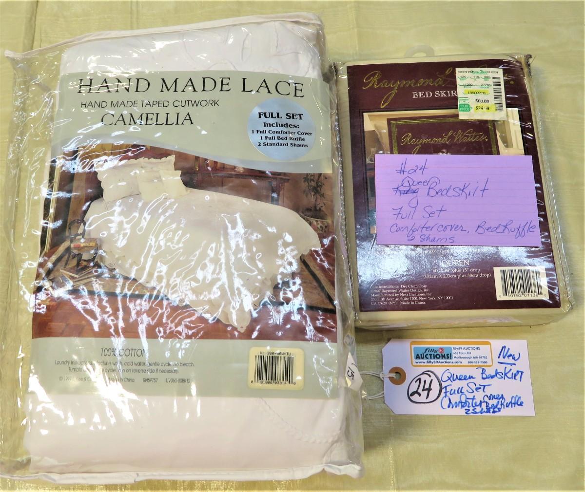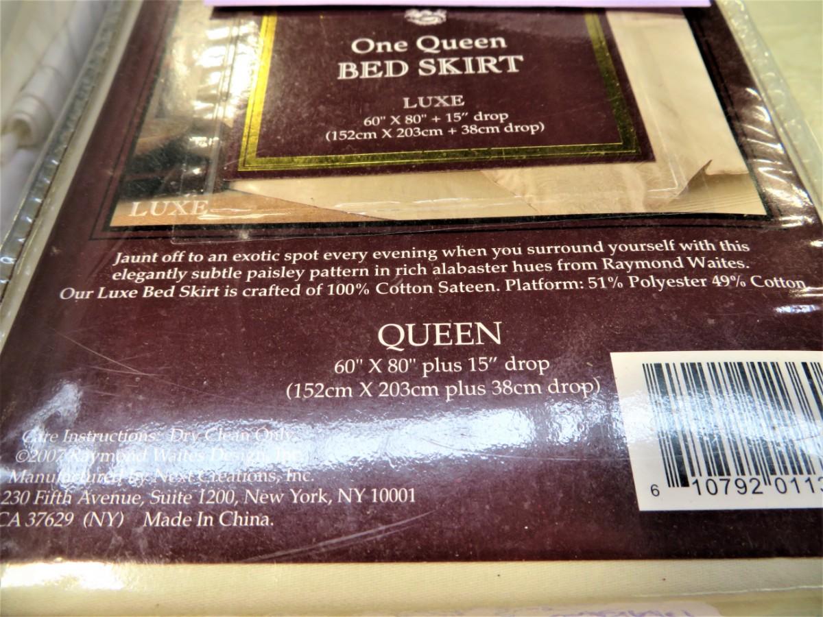 NEW in Packages - Queen bed size BED SKIRT LUXE Raymond Waites (Beige color) & Hand Made Lace 100% COTTON WHITE Bed Ruffle with 2 SHAMS for FULL SIZE Bed. See PHOTOS for contents.