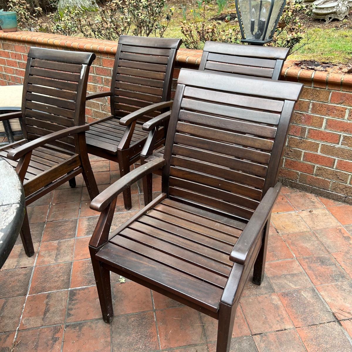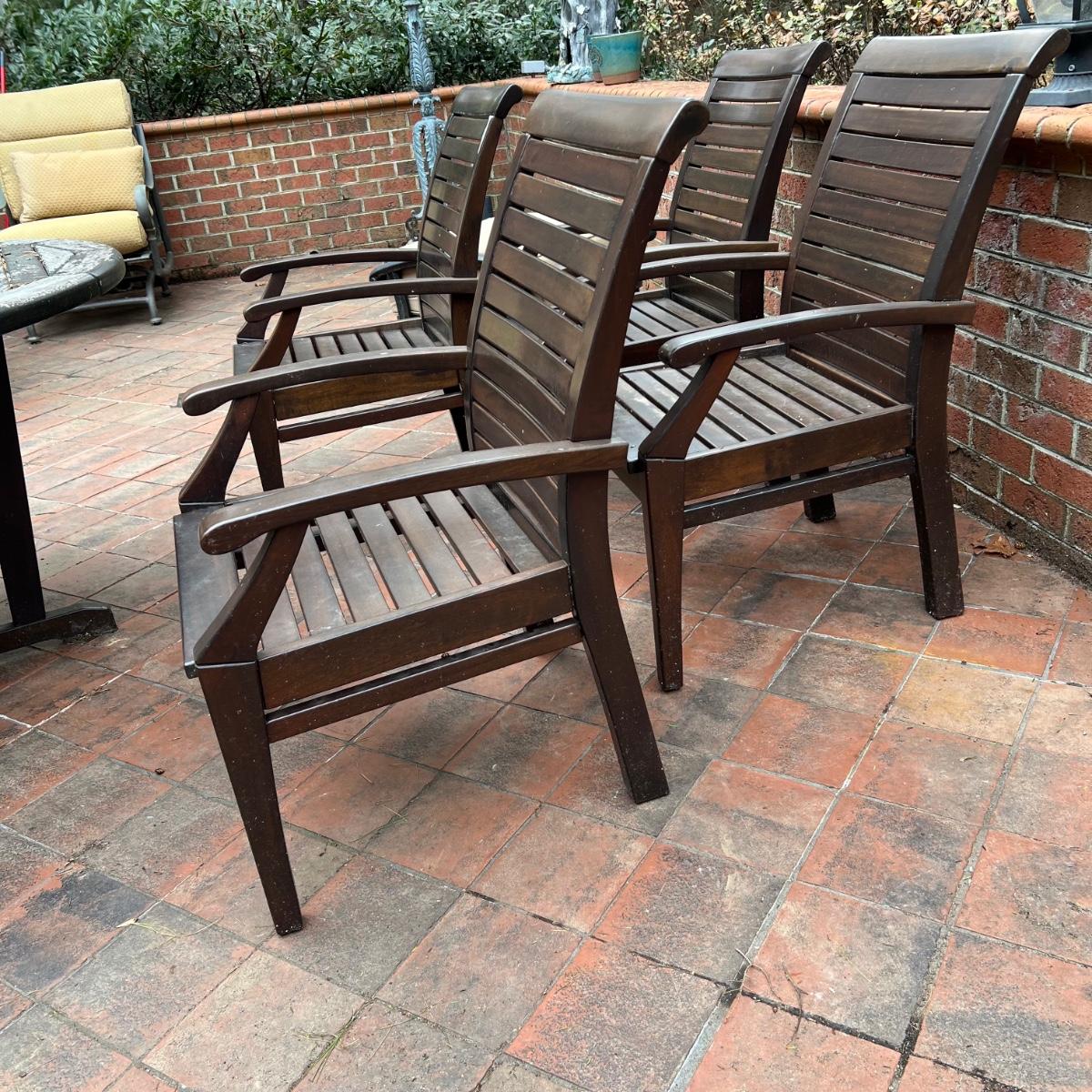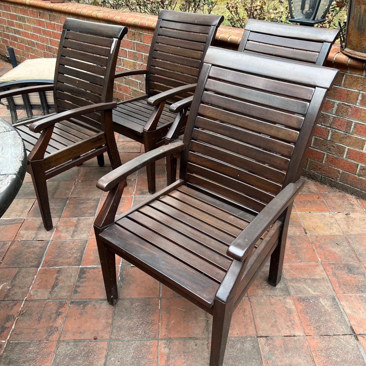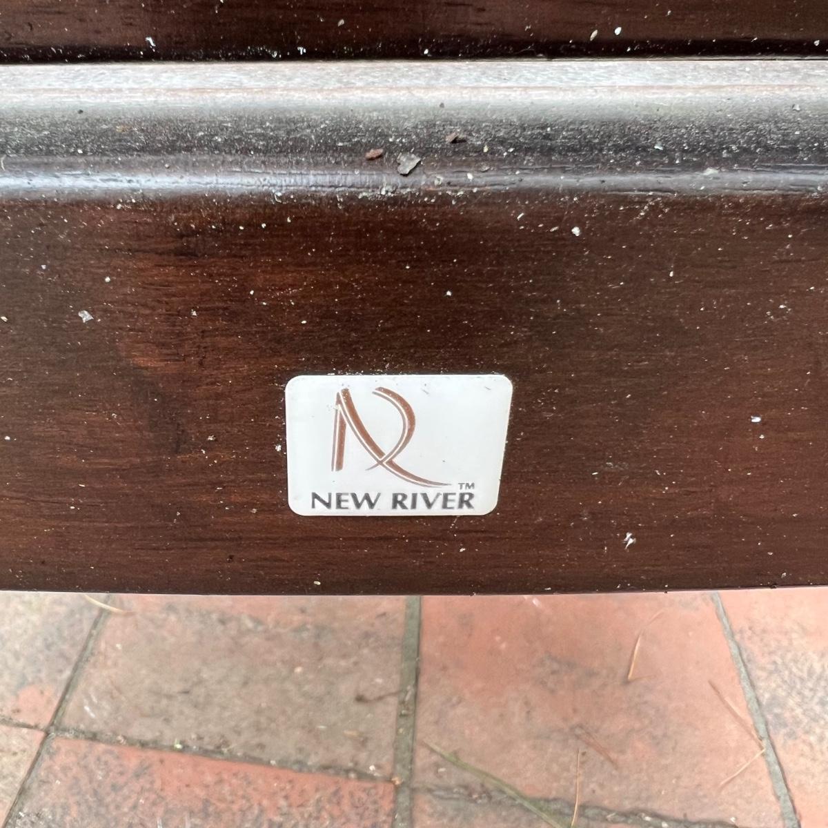 This matching set of four “˜New River’ chairs are extremely sturdy and weigh a lot more than your average patio chairs. A couple of chairs have a blemish, the light colored blemish shown in an image is actually where the wood has chipped off in a small section. A similar, quite possibly matching patio table is in another lot in this sale.