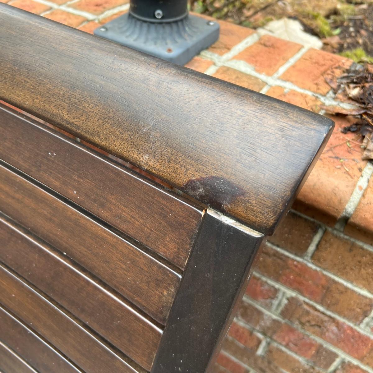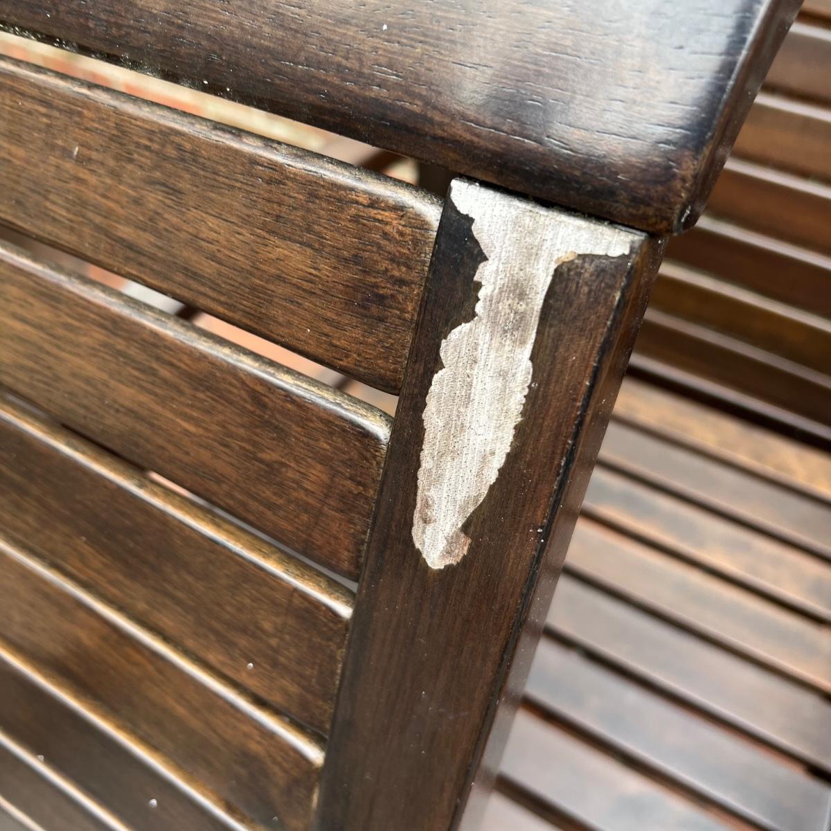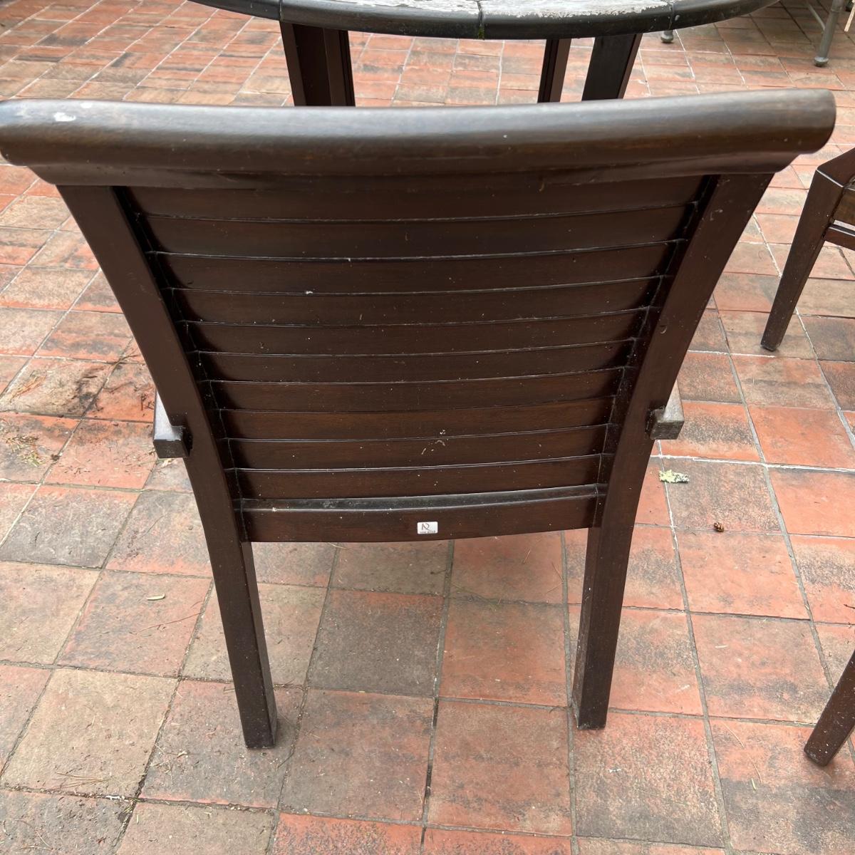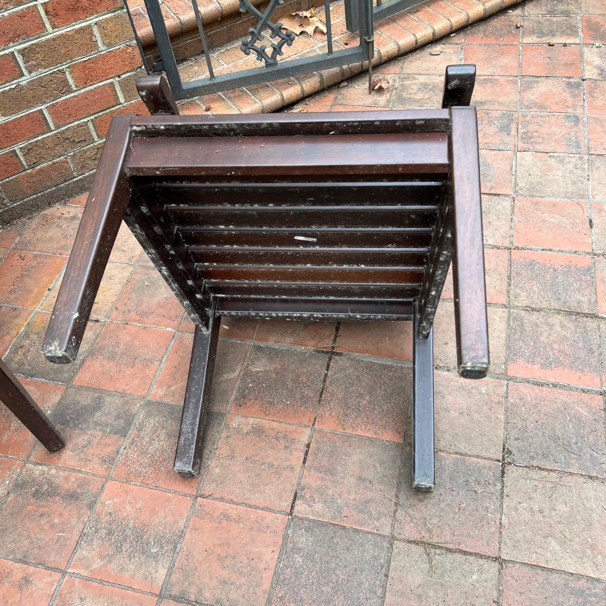 This matching set of four “˜New River’ chairs are extremely sturdy and weigh a lot more than your average patio chairs. A couple of chairs have a blemish, the light colored blemish shown in an image is actually where the wood has chipped off in a small section. A similar, quite possibly matching patio table is in another lot in this sale.