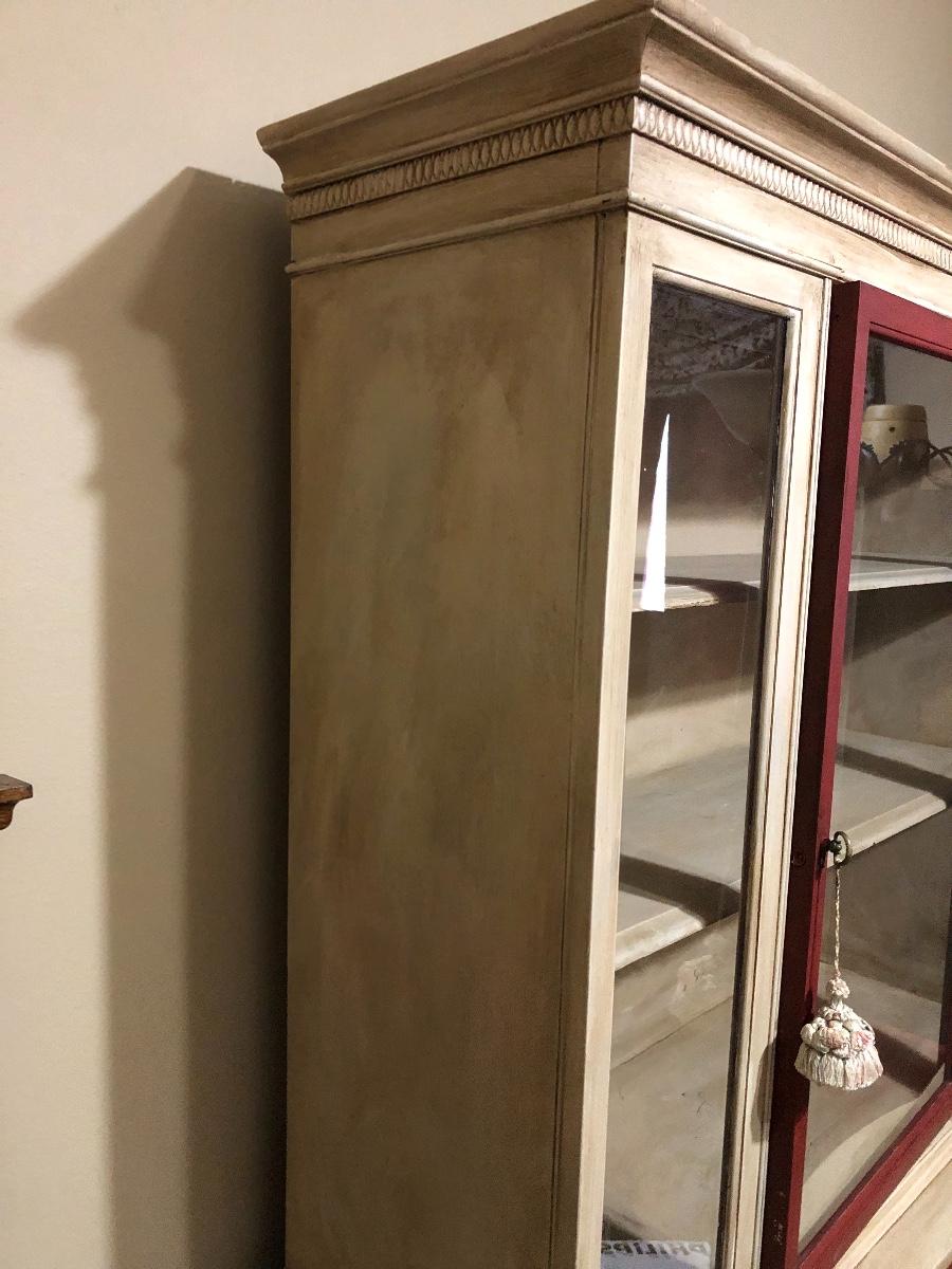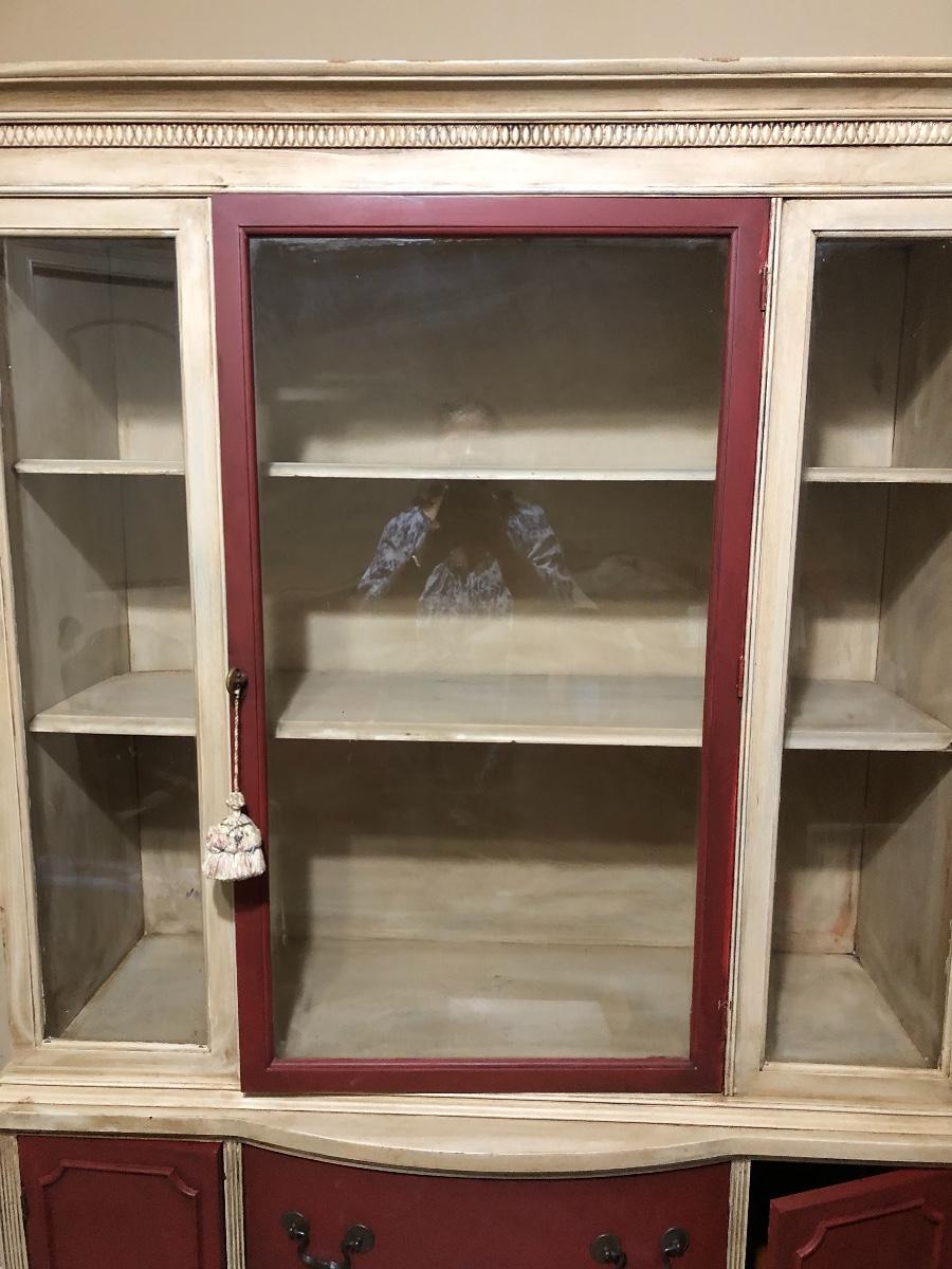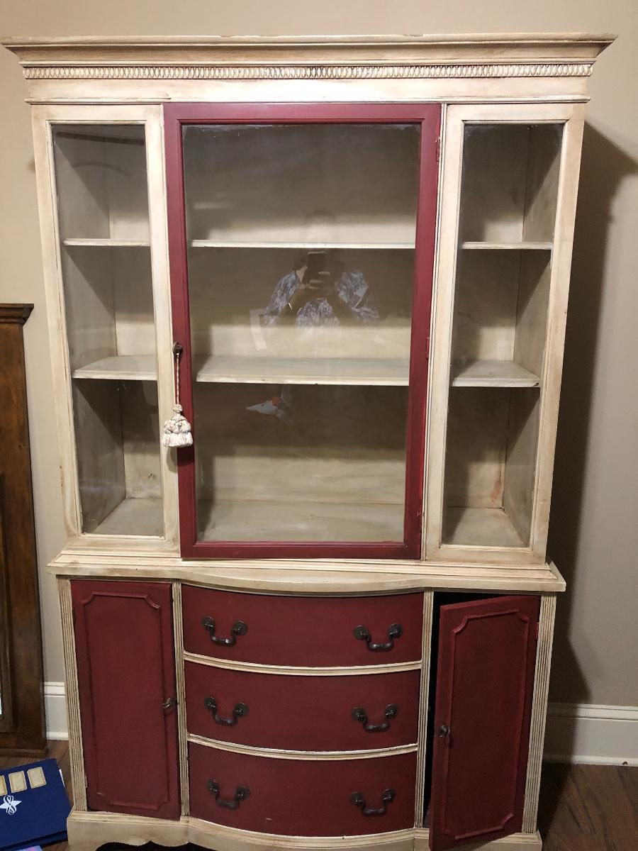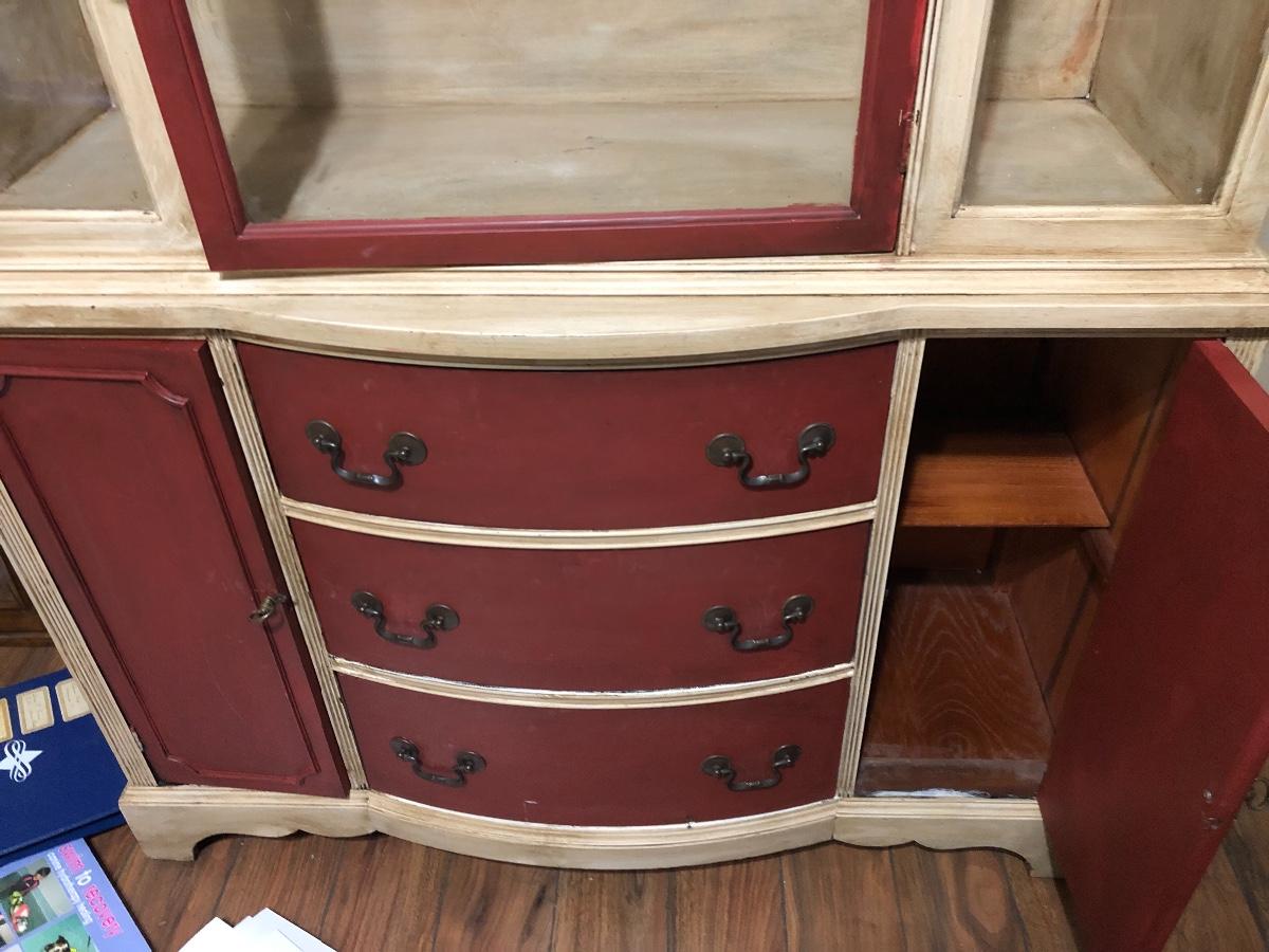 This is a new solid wood China cabinet. It features 3 drawers and two cabinets plus the shelving on top. Love the red color accents. Measures 44 x 15 x 72