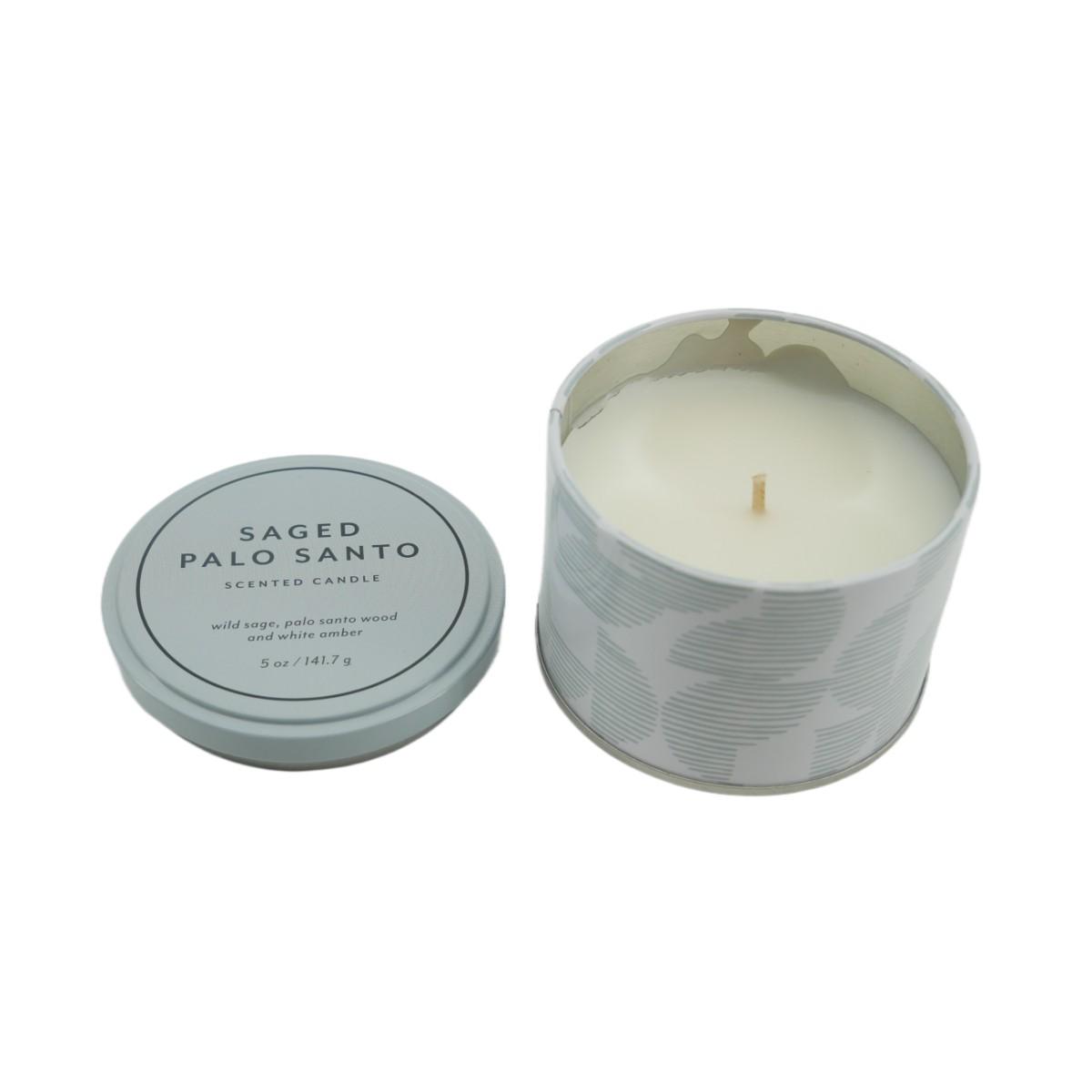 New, Saged Palo Santo 5 oz candle in tin container. Fragrance notes: wild sage, palo santo wood and white amber.