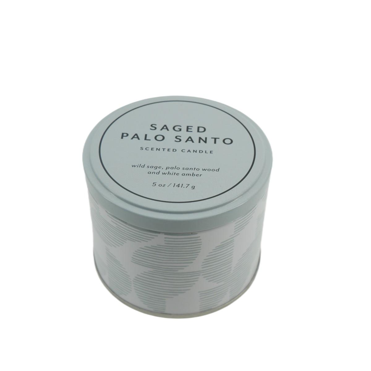 New, Saged Palo Santo 5 oz candle in tin container. Fragrance notes: wild sage, palo santo wood and white amber.