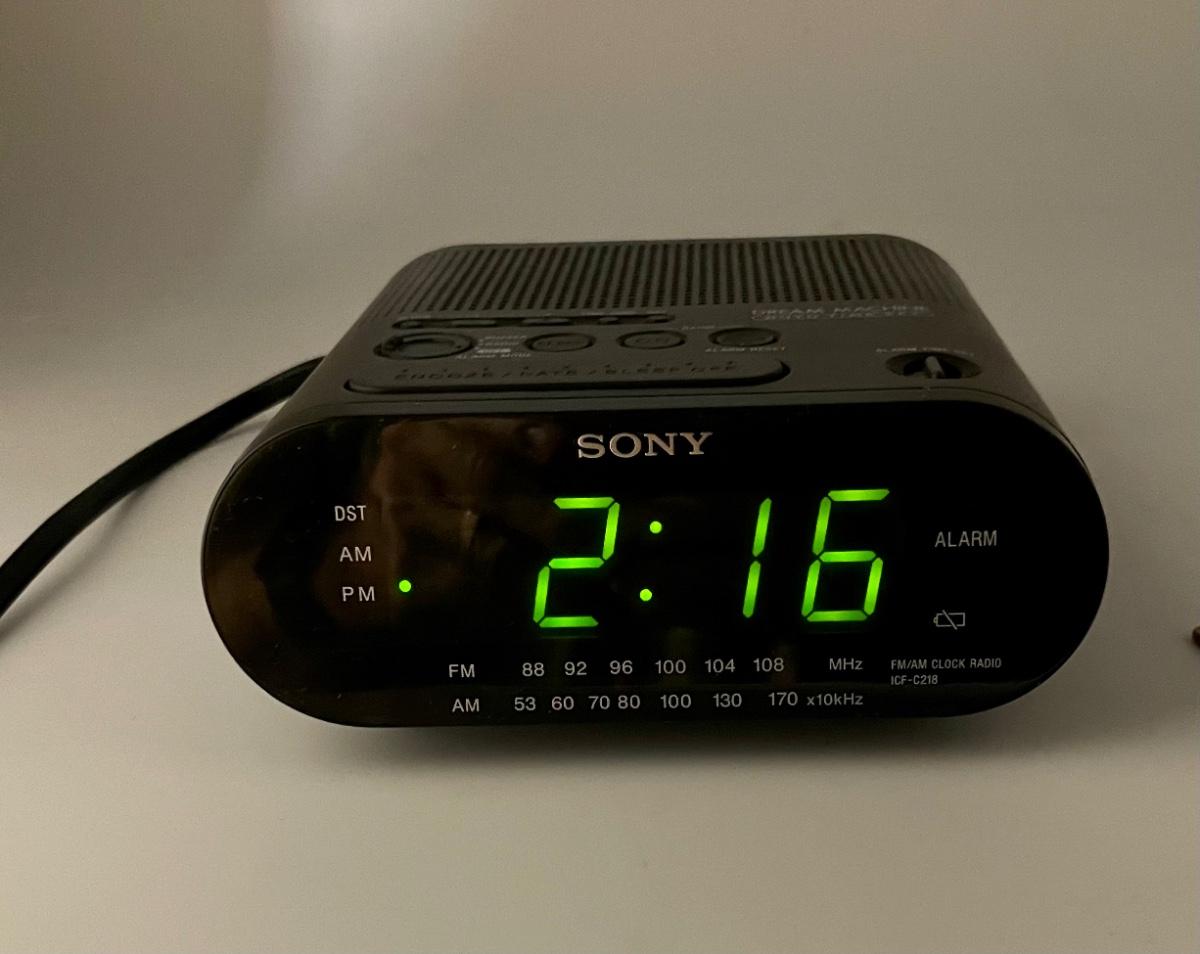Sony AM-FM clock radio. Battery backup, snooze function, auto adjusts for daylight savings time.