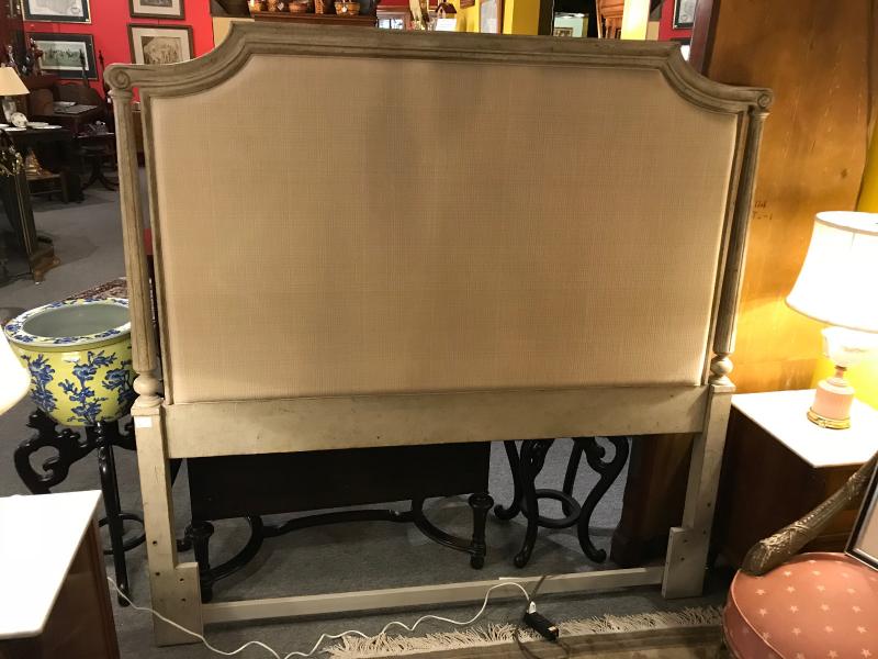 New furniture store floor sample Stanley "Arrondissment Palais" French style upholstered headboard. Fits full or queen size bed frames. Features hand distressed taupe painted finish on the carved wood frame with neutral woven fabric upholstery. Lovely carved scrolls on top rail, with turned and fluted columns on either side. Excellent condition. 64" x 4" x 64" H