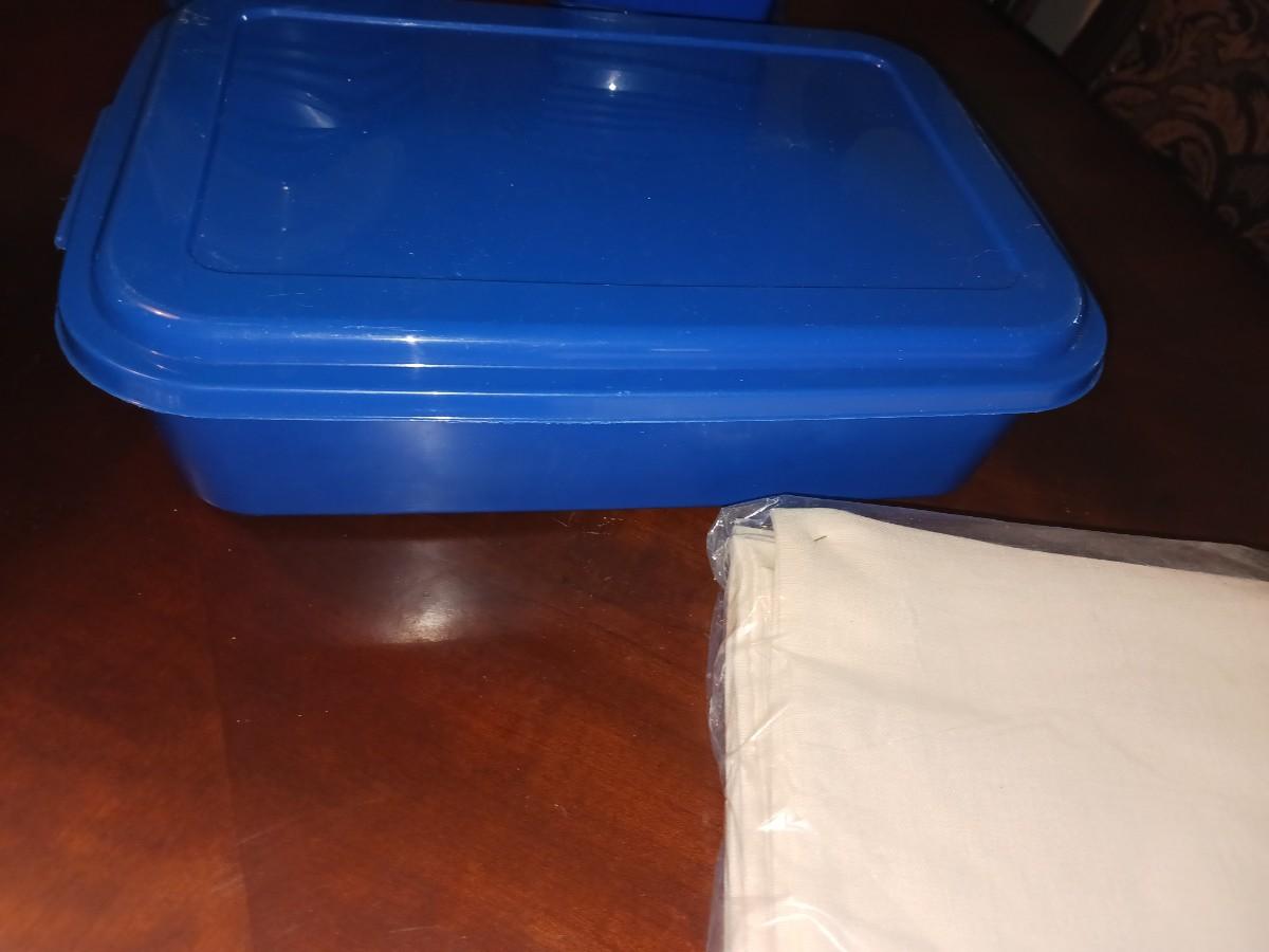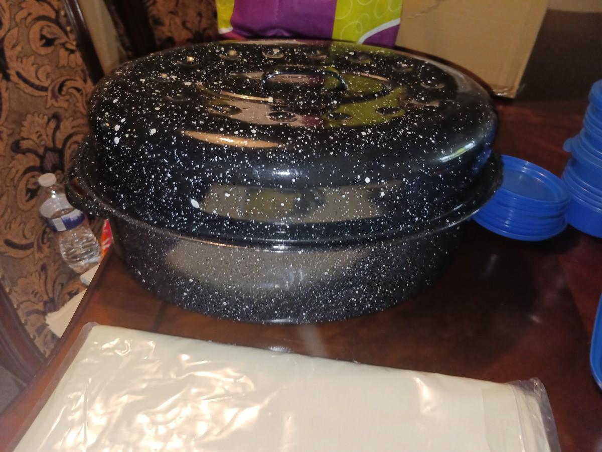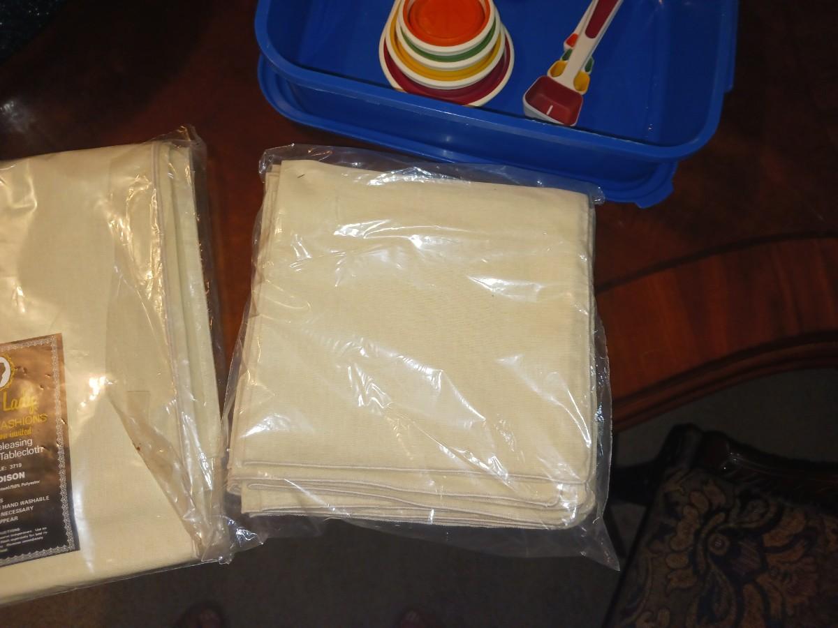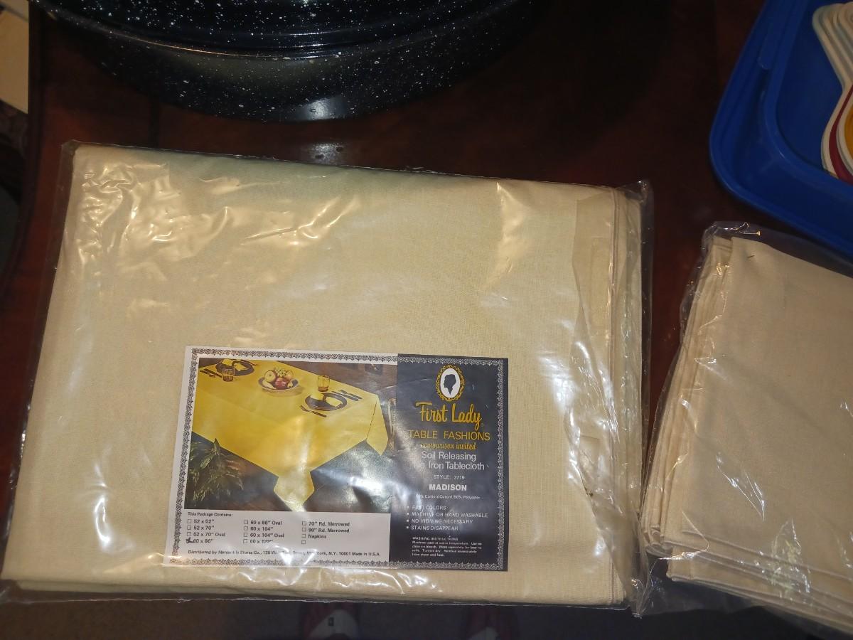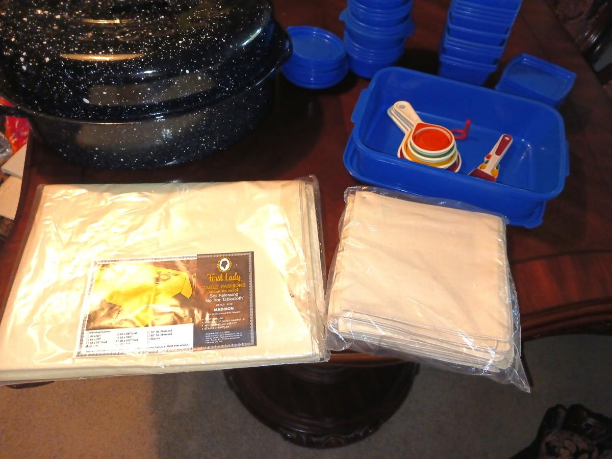 NEW TABLECLOTH AND LINEN NAPKINS, LARGE ROASTING PAN AND FOOD STORAGE CONTAINERS