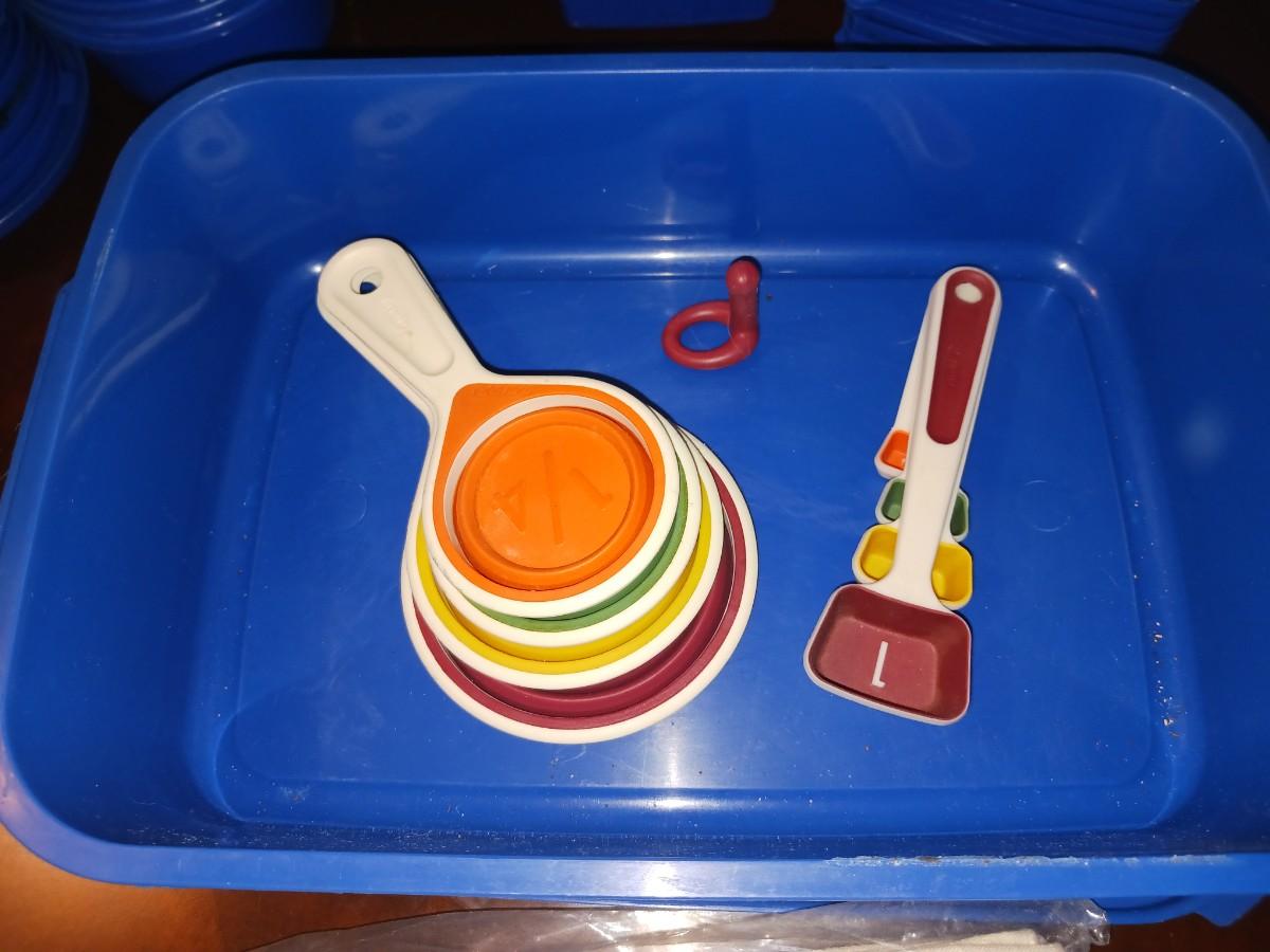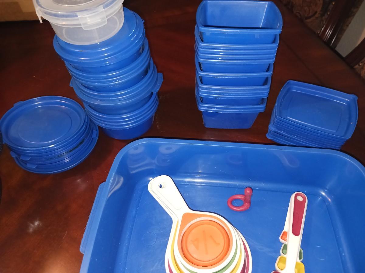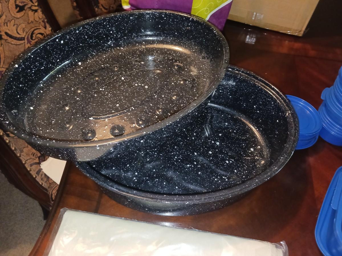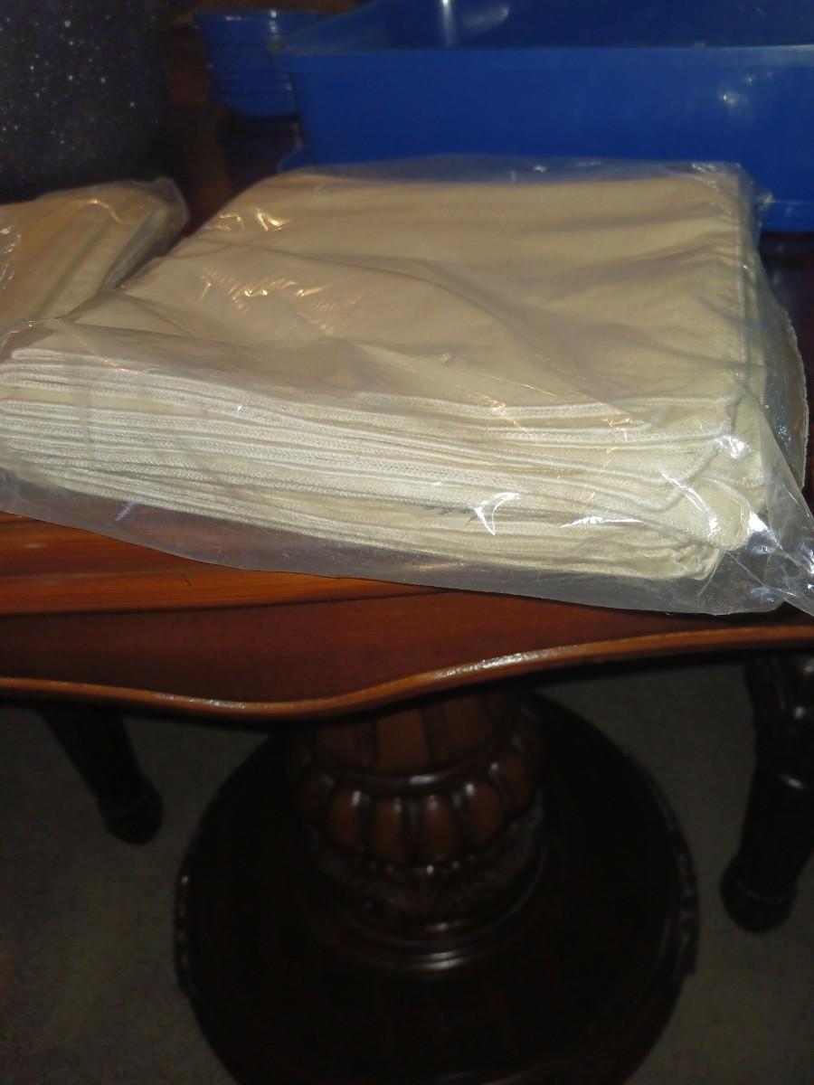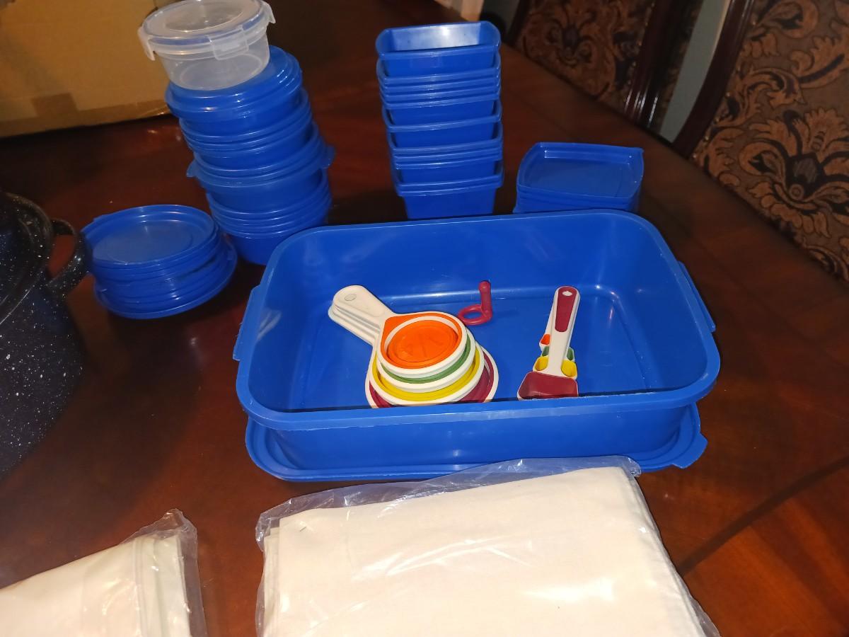 NEW TABLECLOTH AND LINEN NAPKINS, LARGE ROASTING PAN AND FOOD STORAGE CONTAINERS