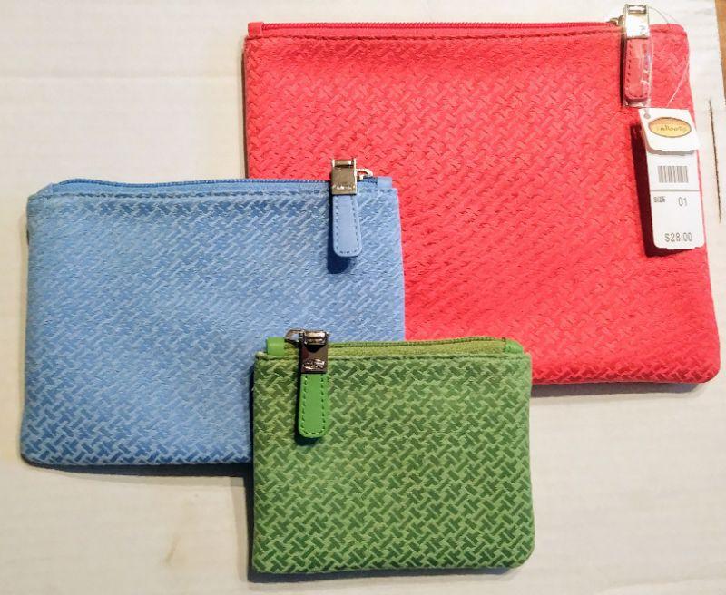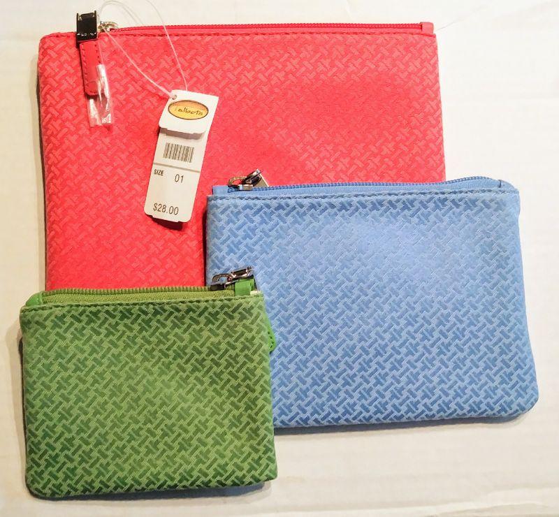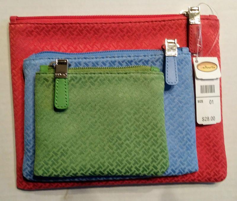 Handy Classic Talbots 3 piece colorful Accessory Jewelry Cosmetic Makeup Pouches. Red 8-3/4 x 7", Blue 7x5", Green 5x4" all with Zippers. New with Price Tag